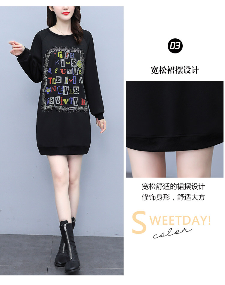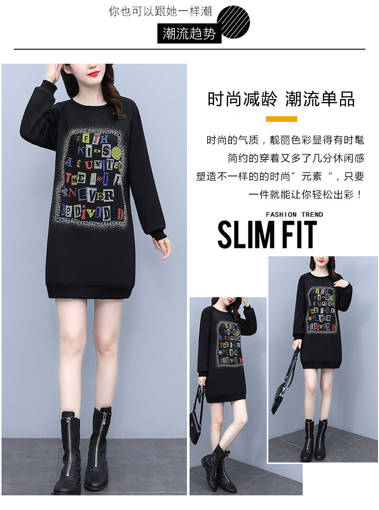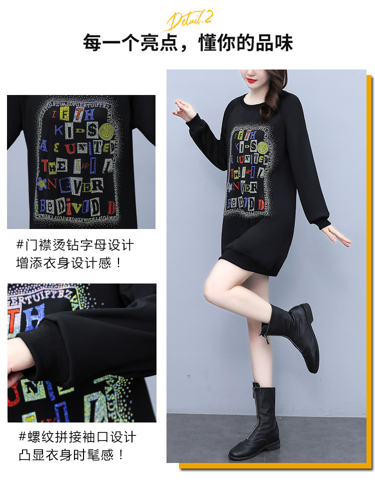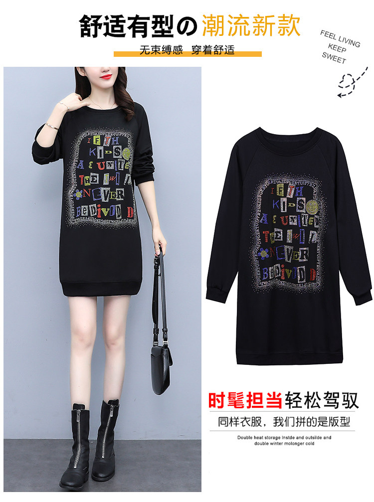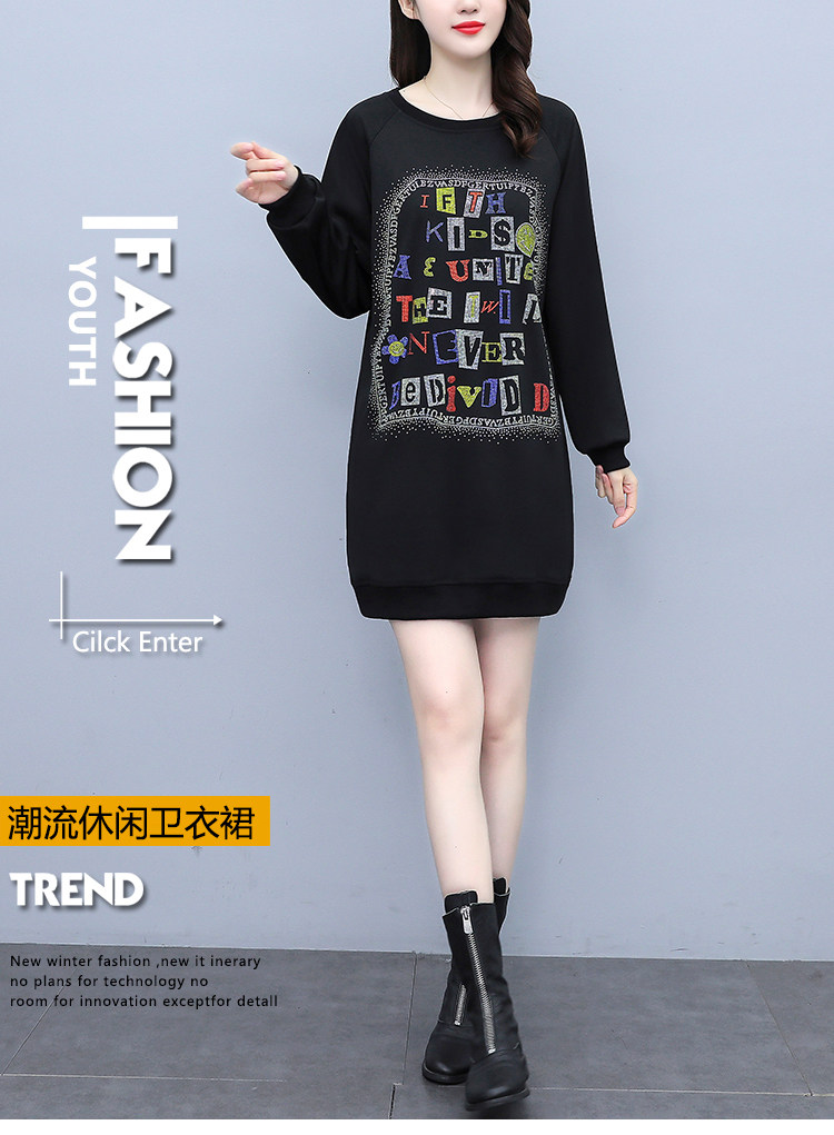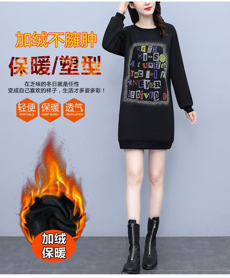 RM30582#大码2023年秋冬新款烫钻时尚百搭园领加绒加厚中长款卫衣裙