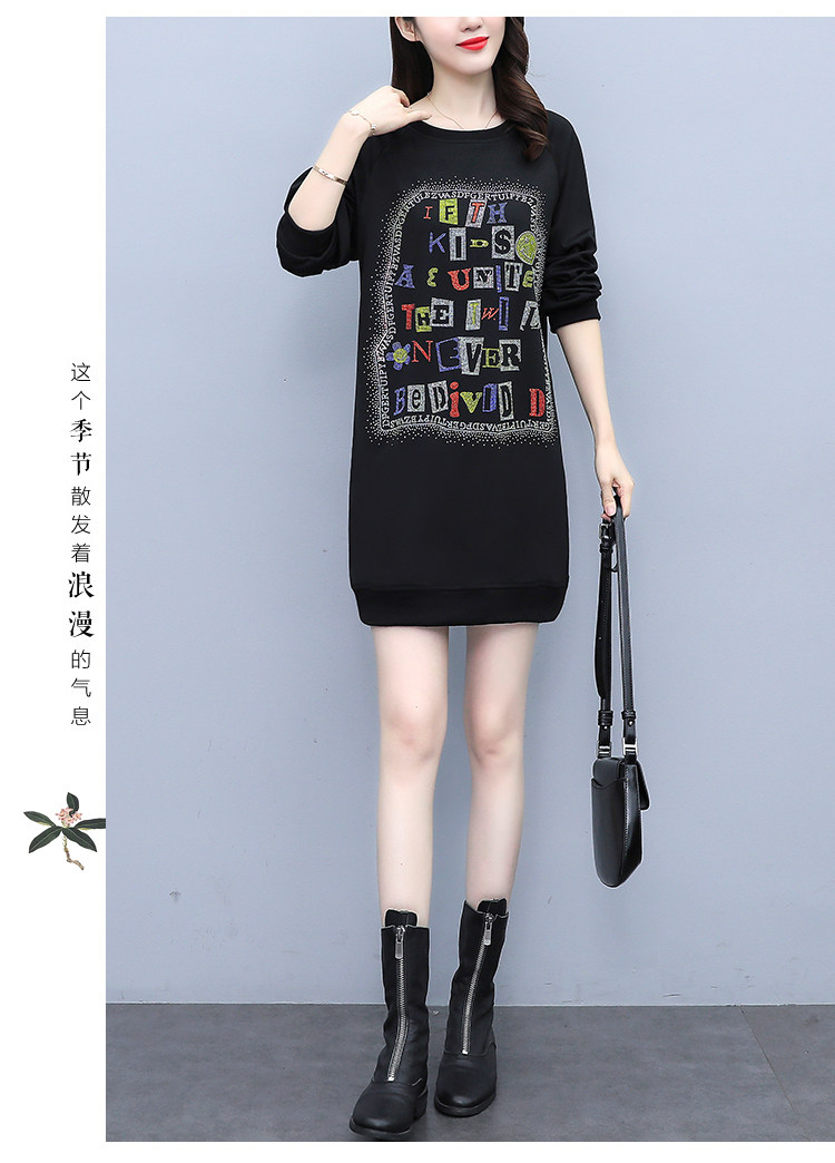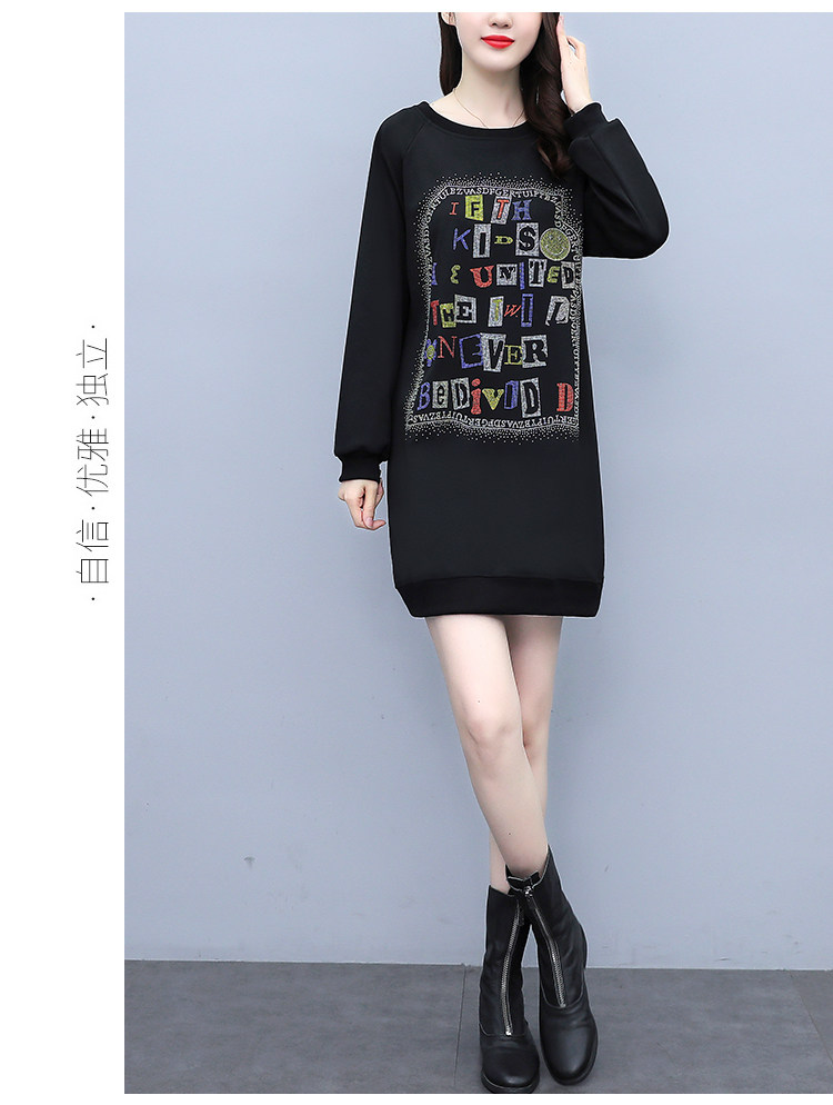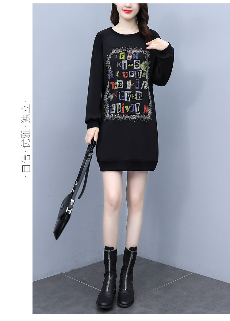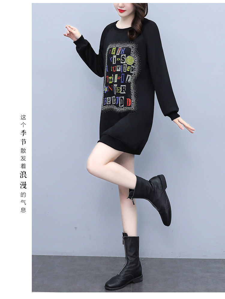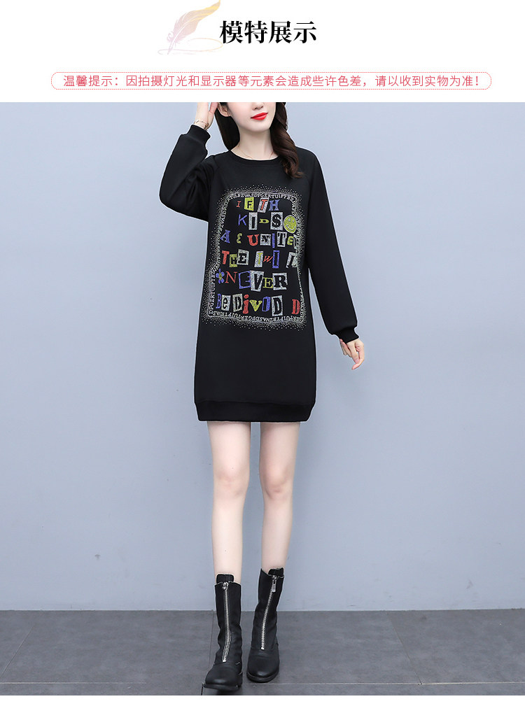 RM30582#大码2023年秋冬新款烫钻时尚百搭园领加绒加厚中长款卫衣裙