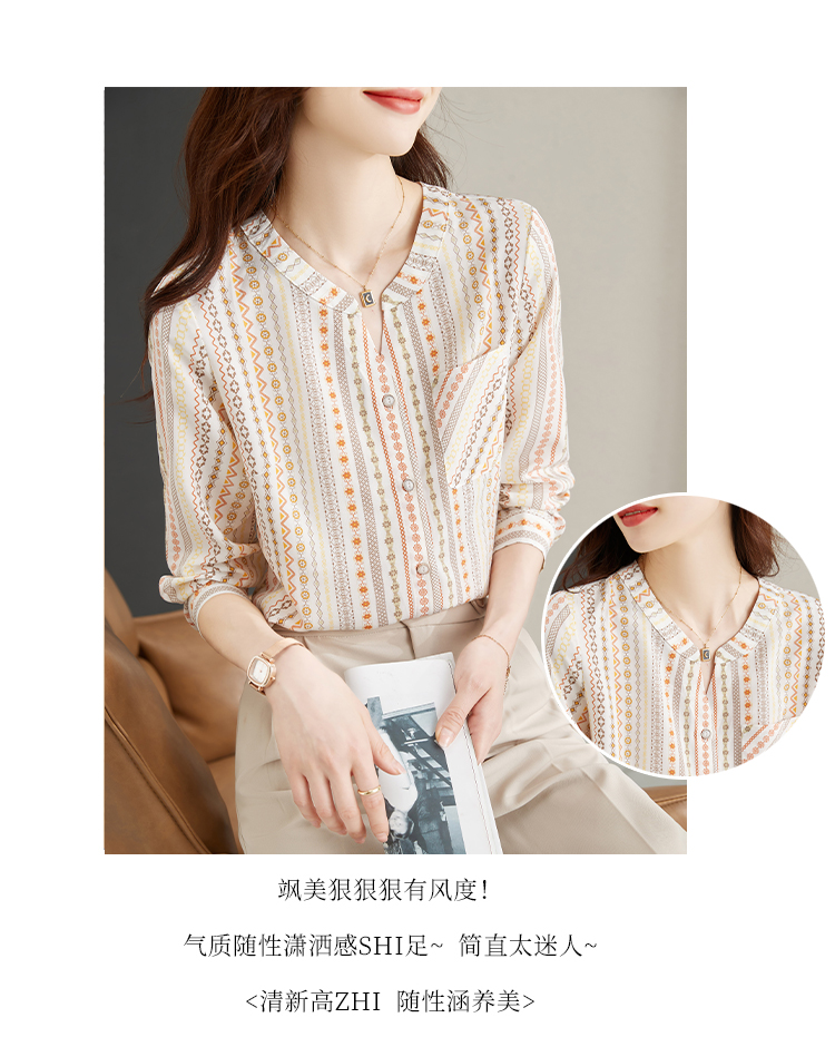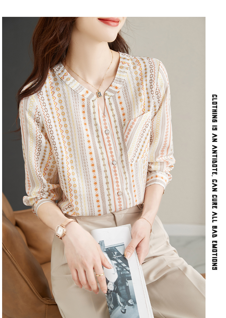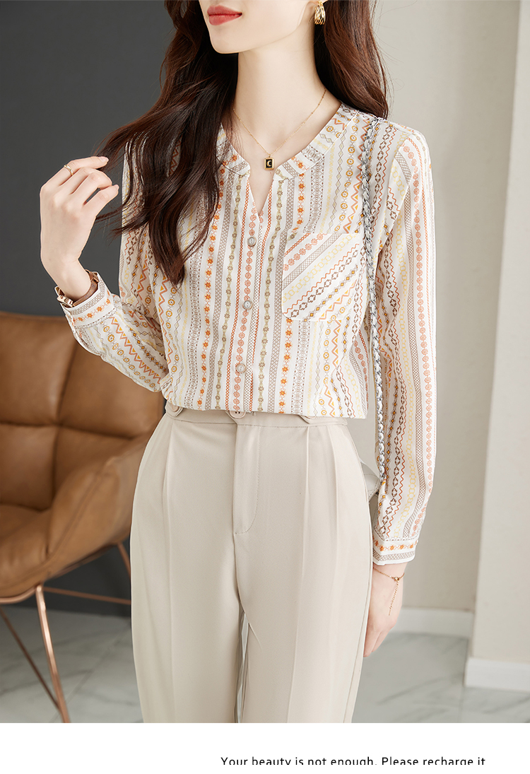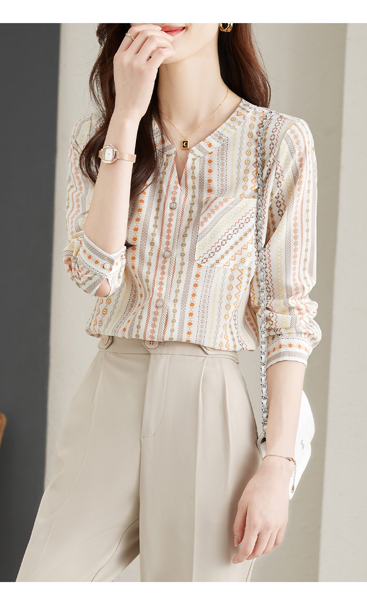 RM30589#港风复古印花V领衬衫女2024年春季新款洋气百搭显瘦长袖雪纺小衫
