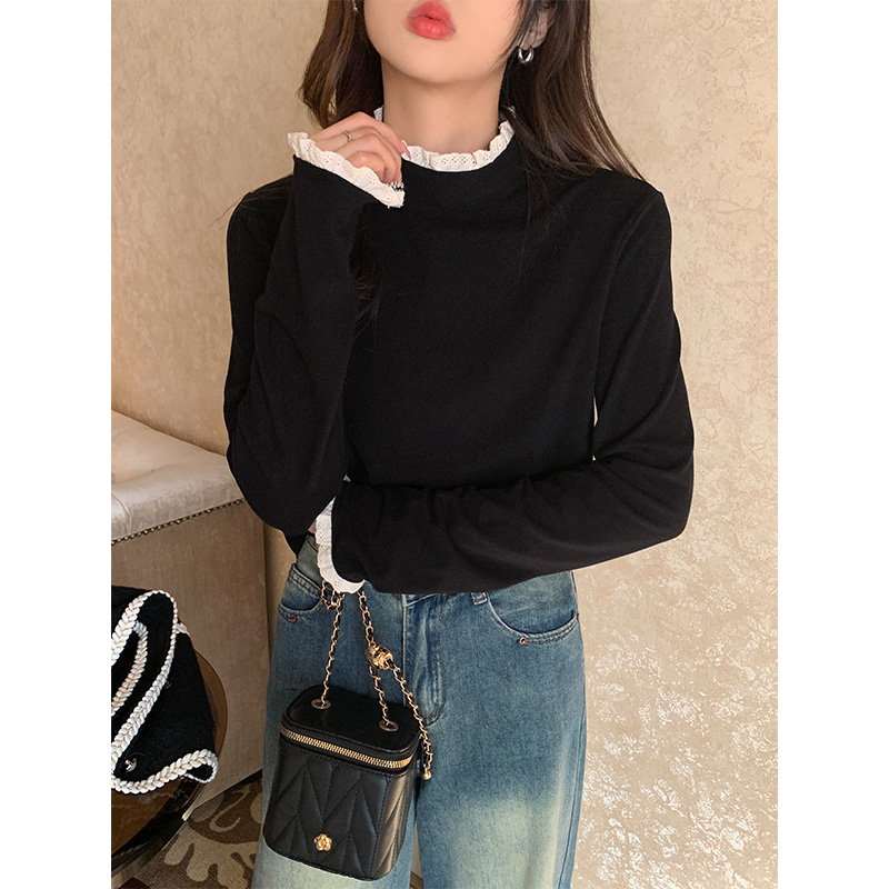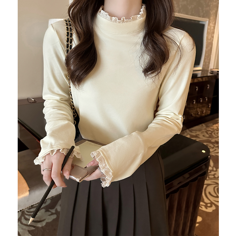 RM30708#半高领德绒打底衫女秋冬季法式蕾丝花边长袖t恤气质上衣