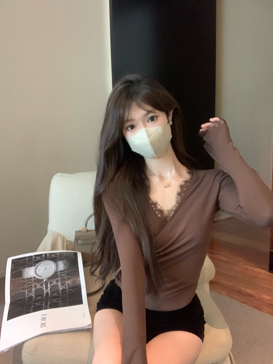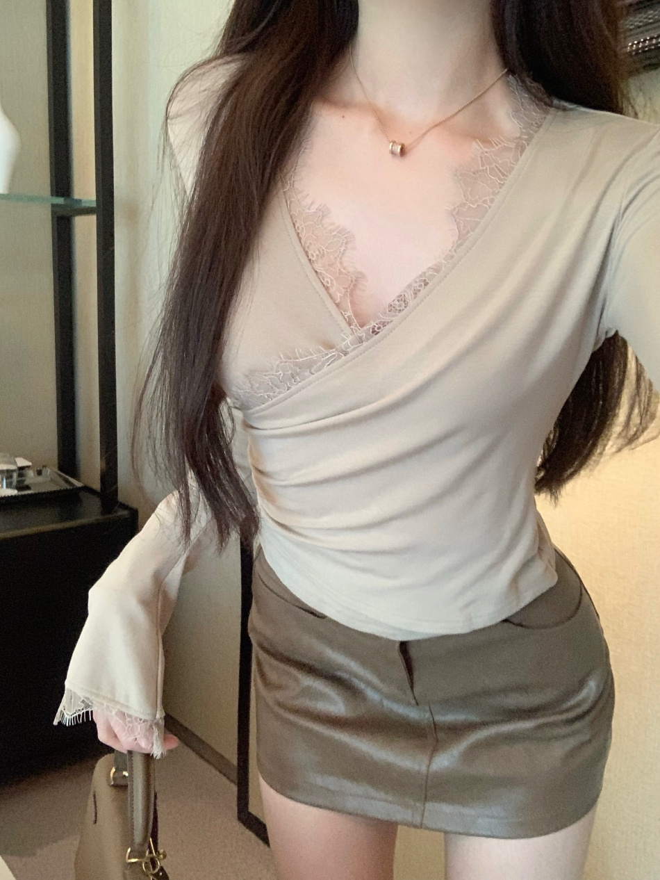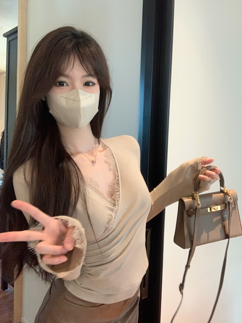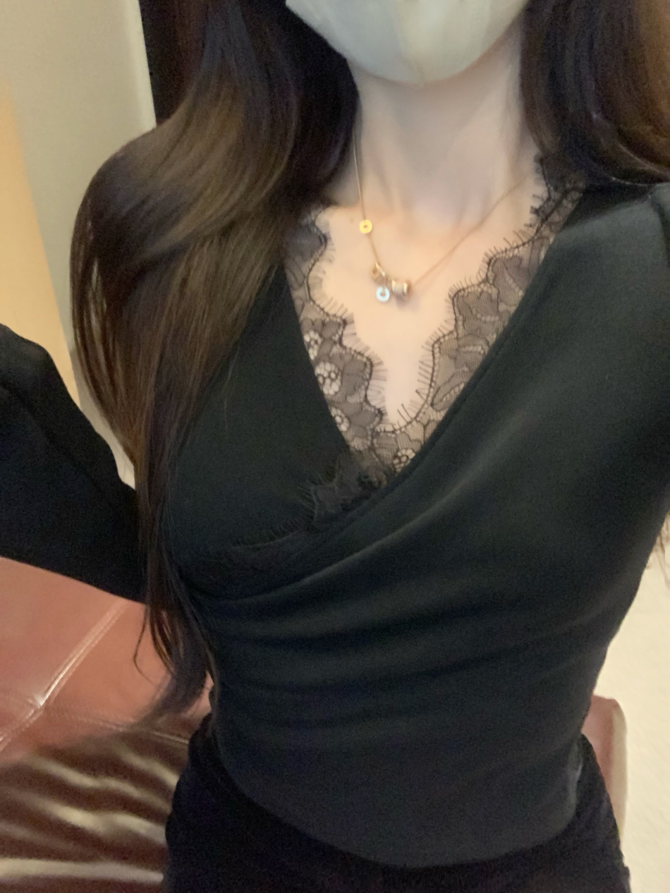 RM30746#气质V领蕾丝拼接上衣女设计感时尚交叉长袖打底衫