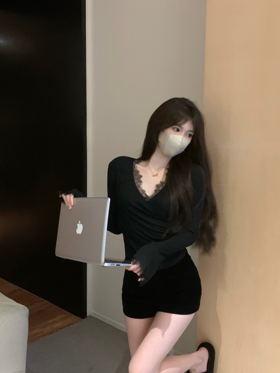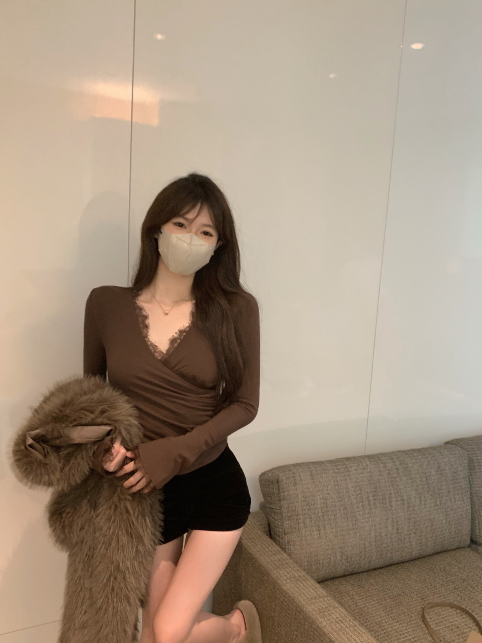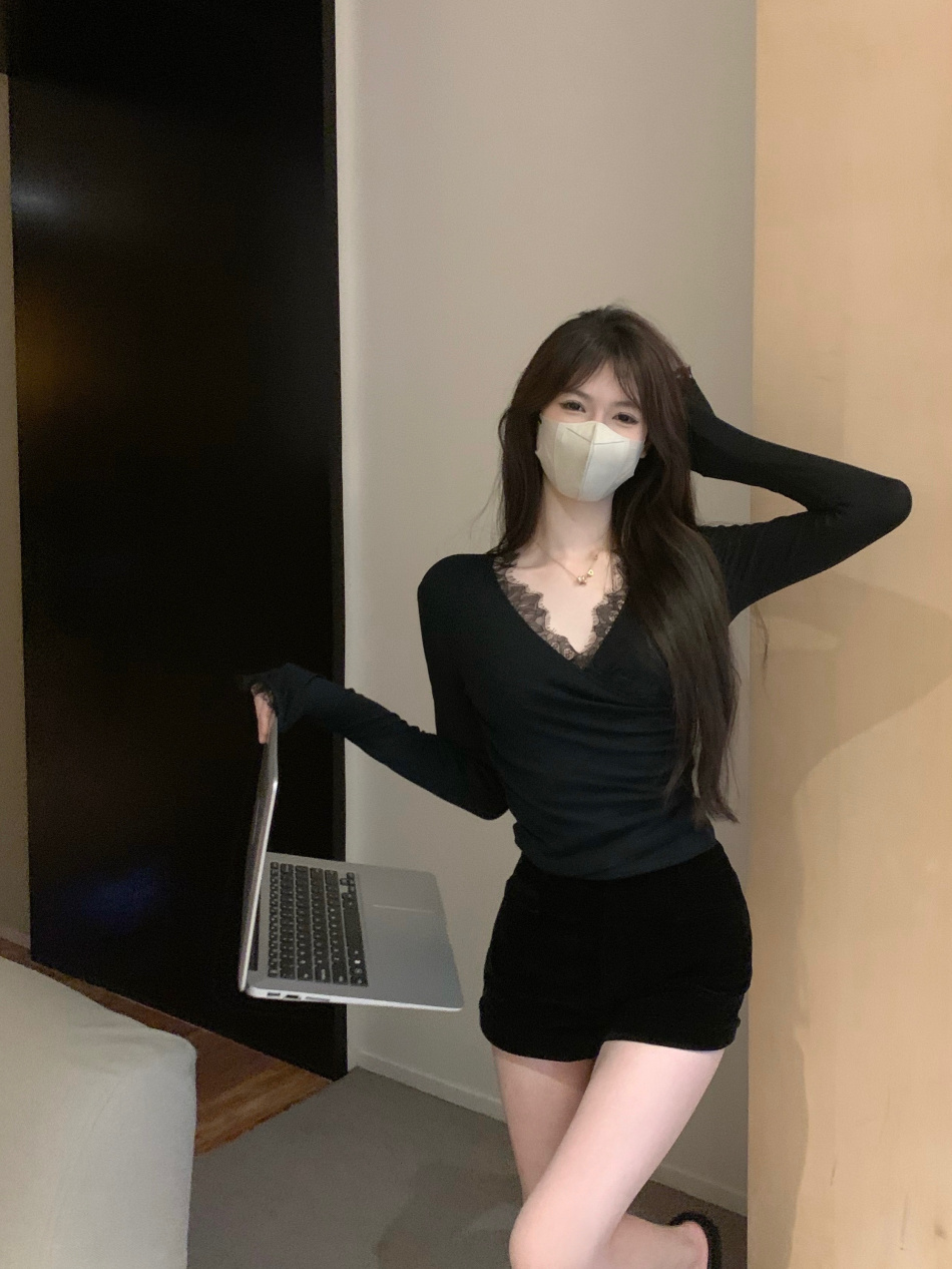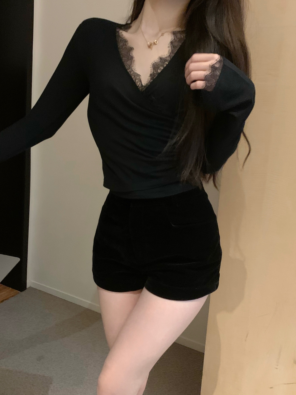 RM30746#气质V领蕾丝拼接上衣女设计感时尚交叉长袖打底衫
