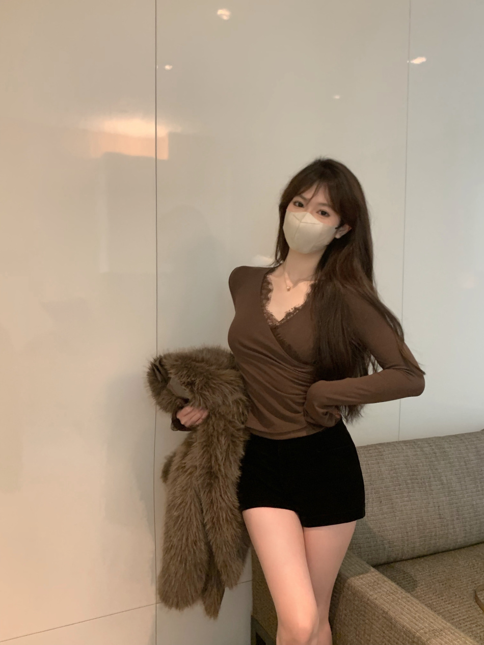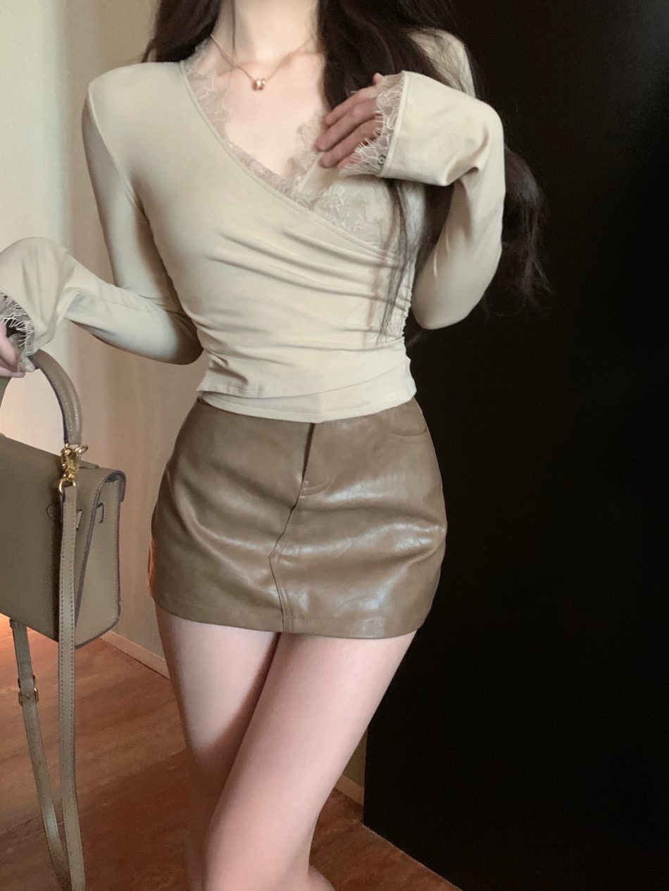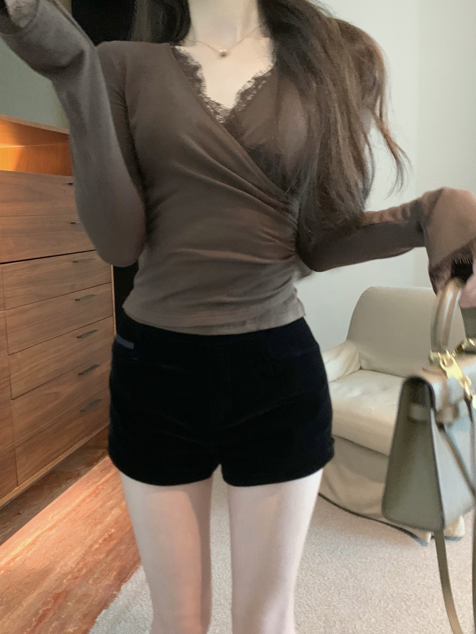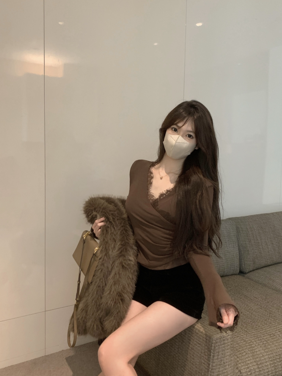 RM30746#气质V领蕾丝拼接上衣女设计感时尚交叉长袖打底衫