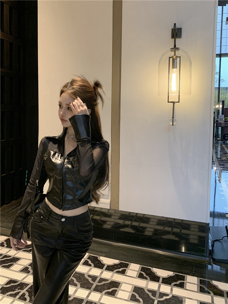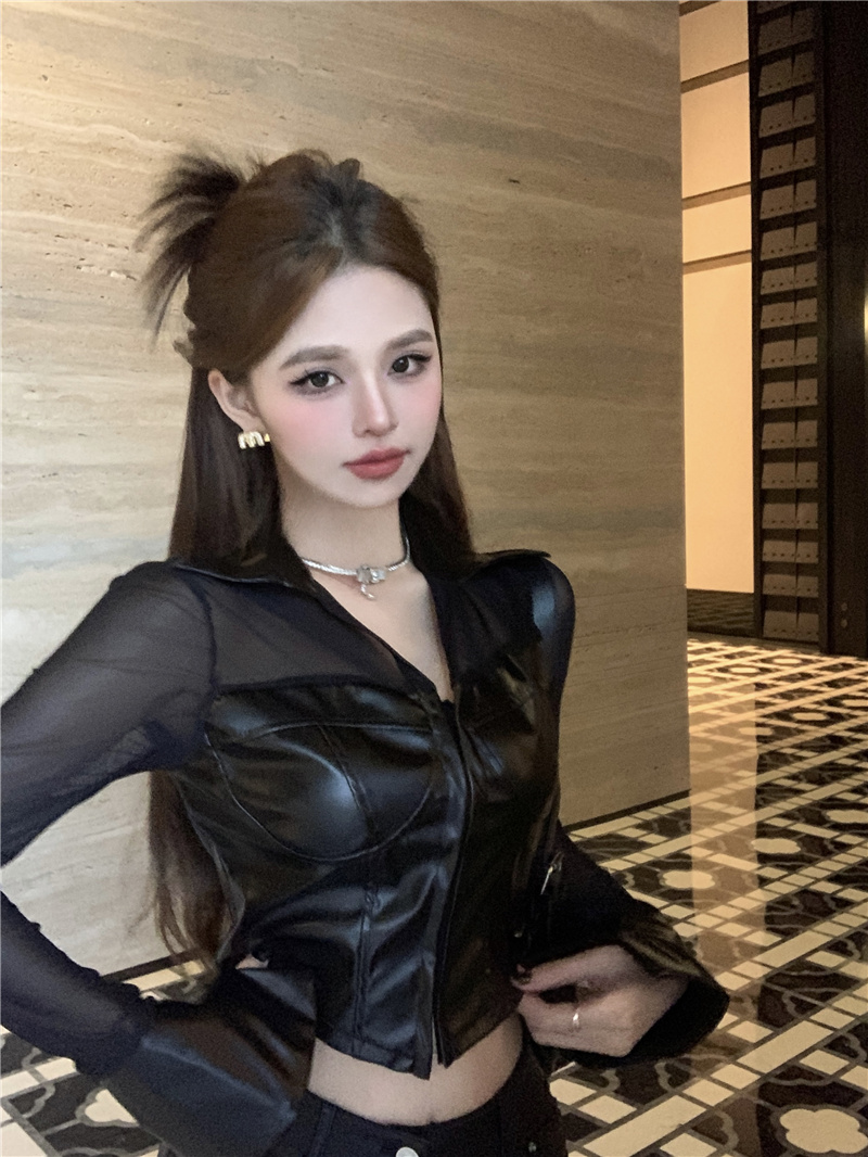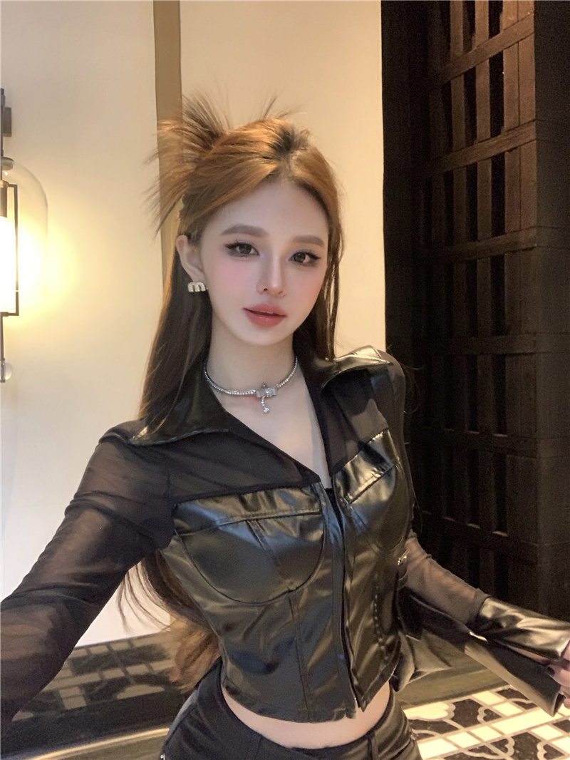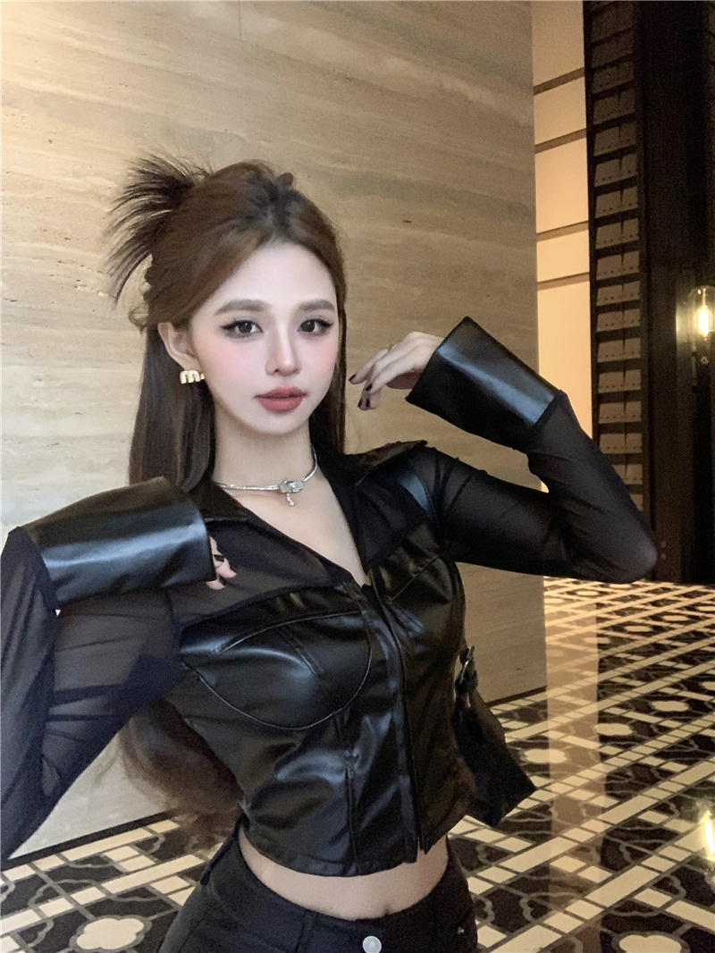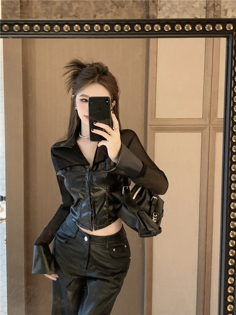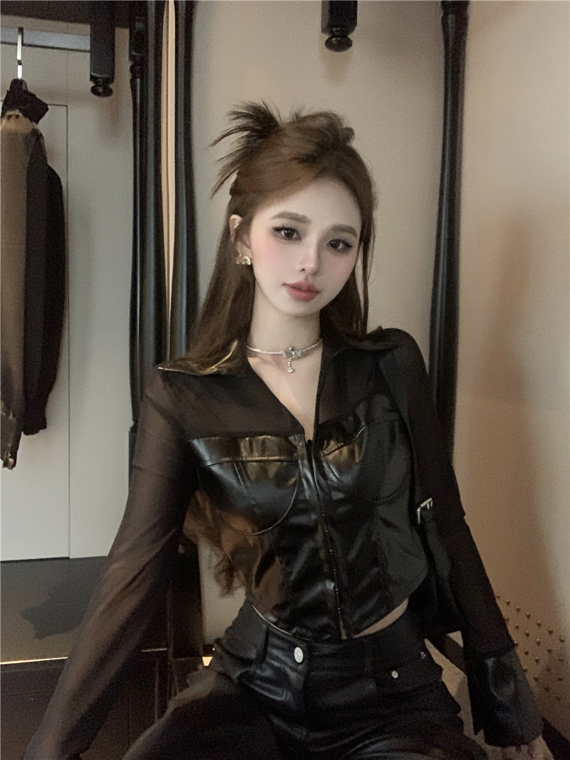 RM30747#新款性感纯欲风设计感拼接pu皮衬衫辣妹上衣女