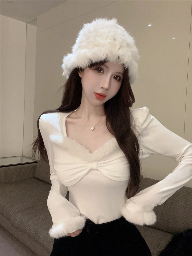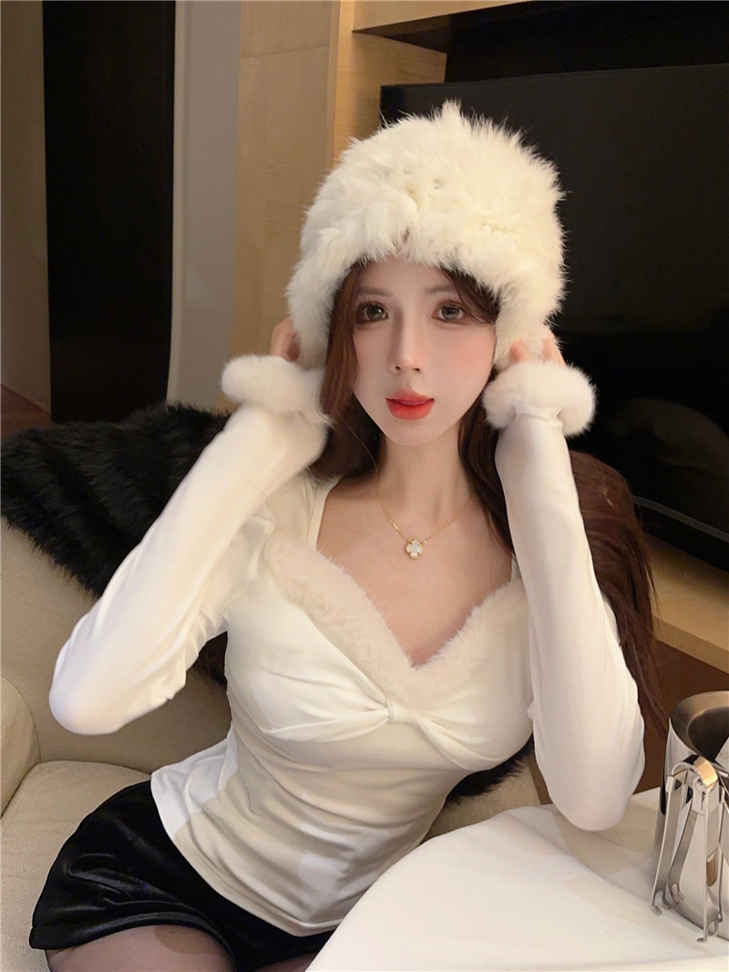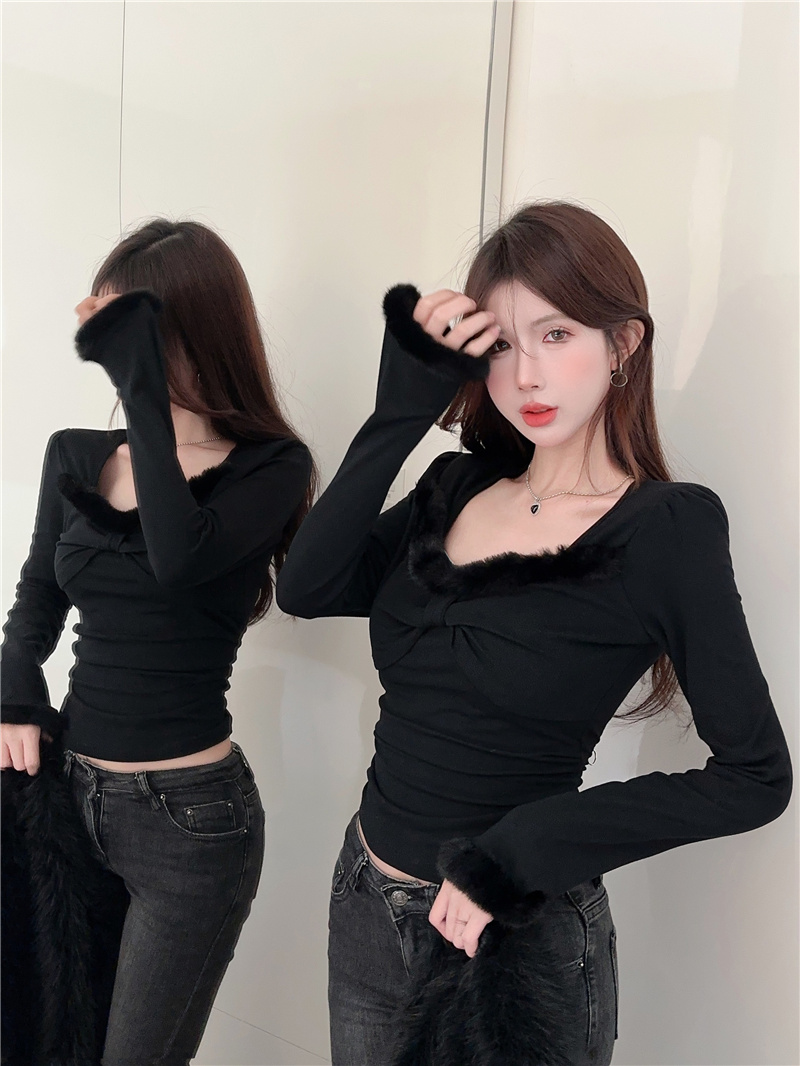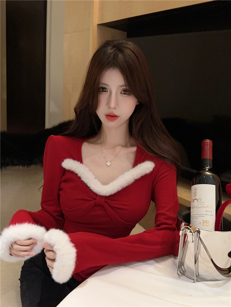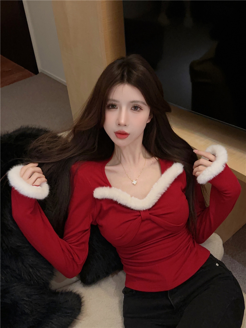 RM30753#女装加绒红色长袖打底衫秋冬新款别致小众显瘦内搭上衣