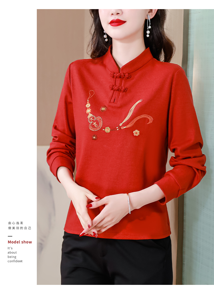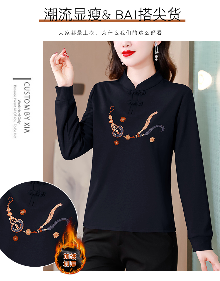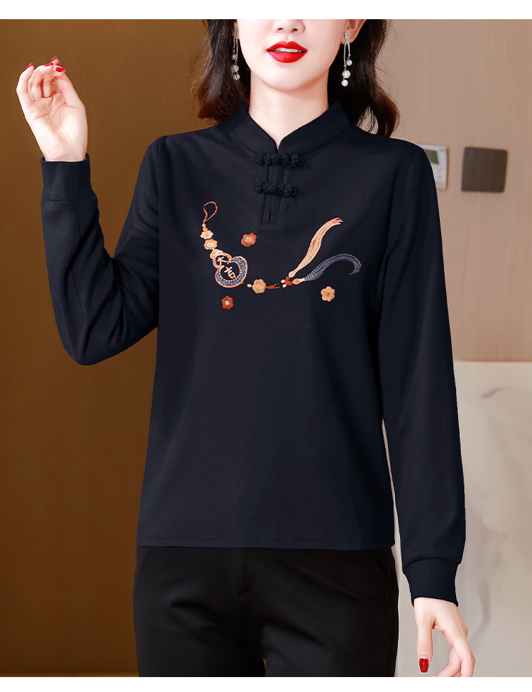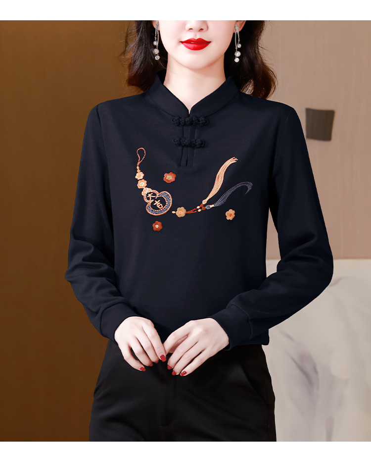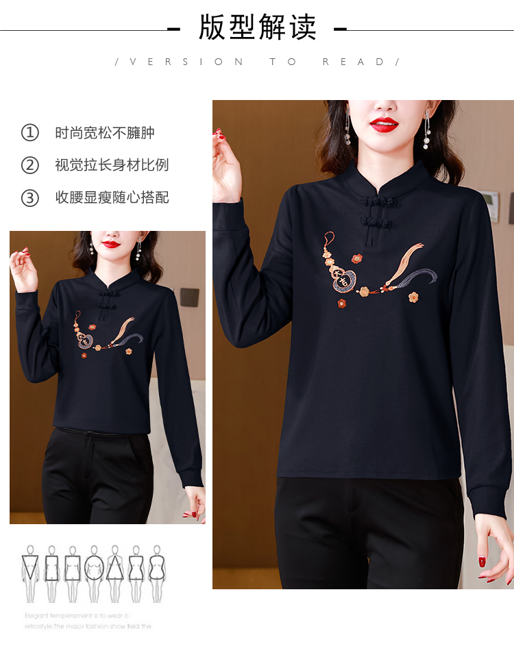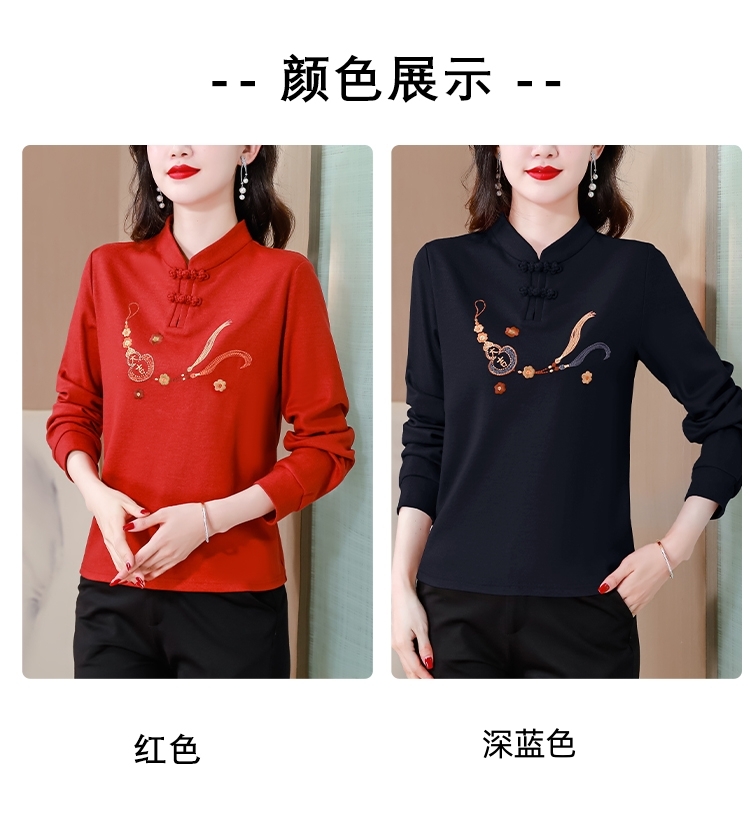 RM30954#文艺复古盘扣刺绣长袖打底衫女冬装2023新款大码宽松显瘦长袖T恤