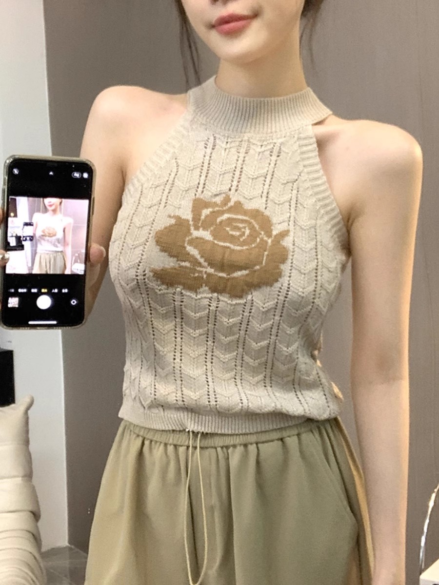 RM33092#纯欲辣妹性感提花挂脖吊带背心女内搭打底无袖针织衫女夏短款上衣