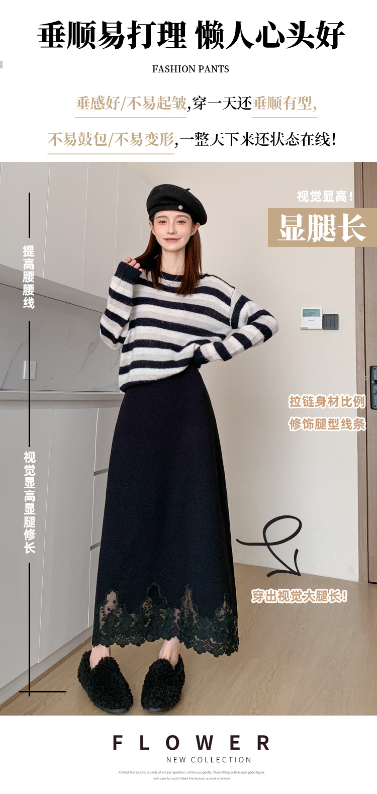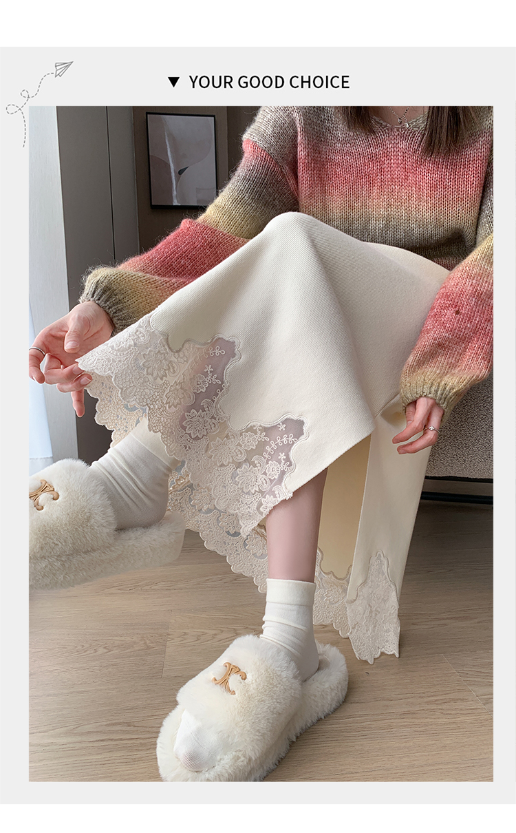 RM33259#加厚花边针织半身裙女冬季长裙新款高腰开叉A字裙修身包臀裙