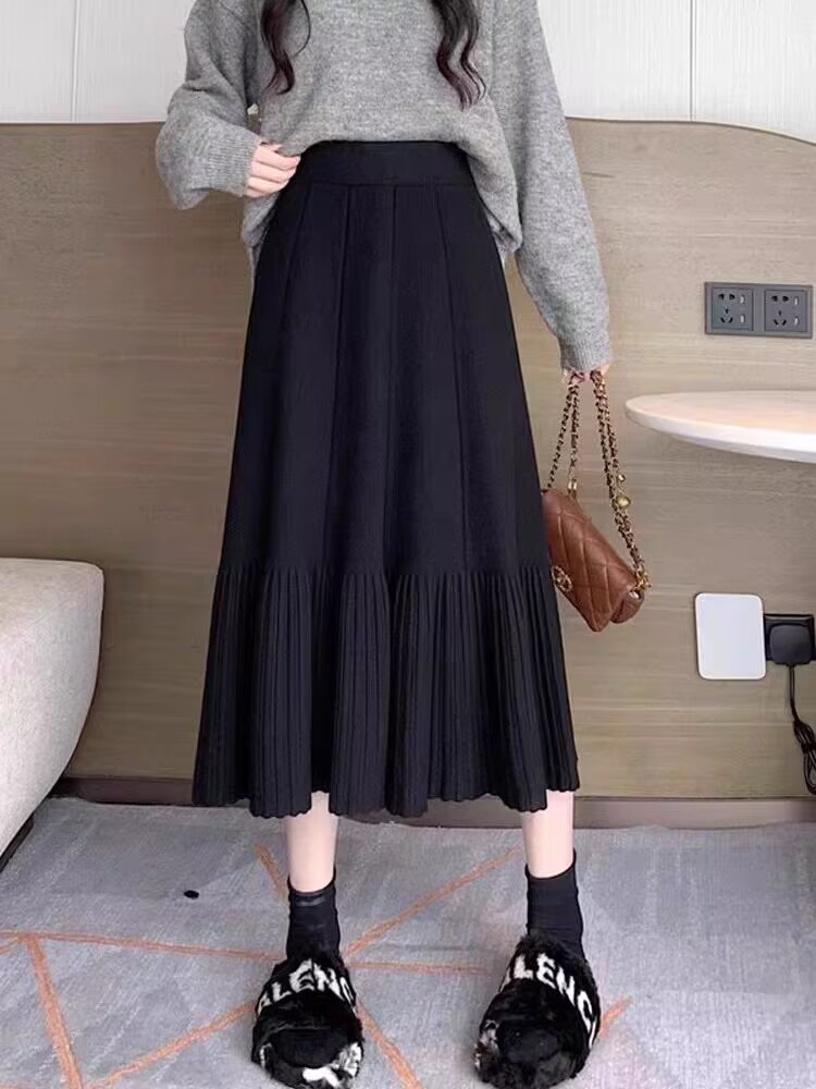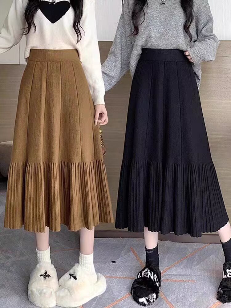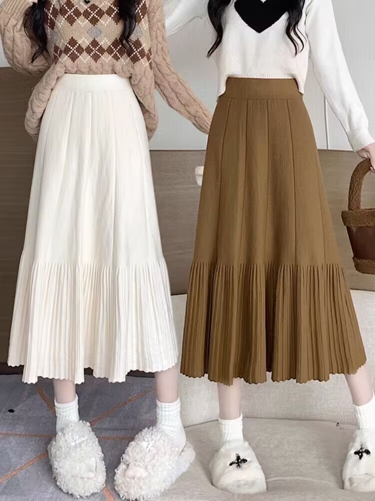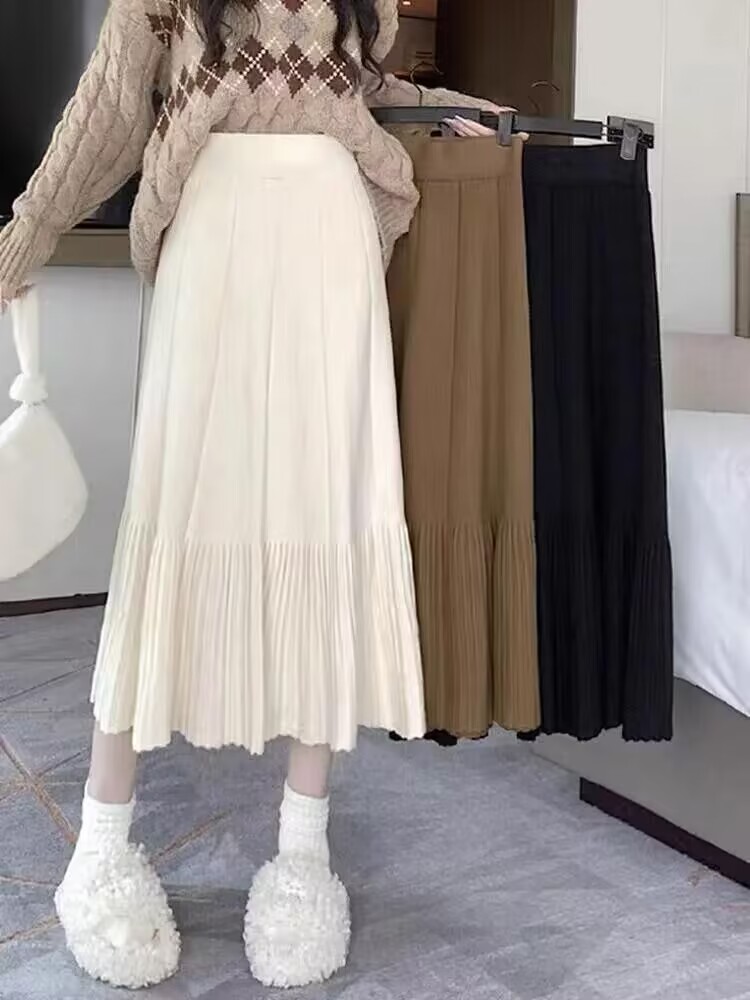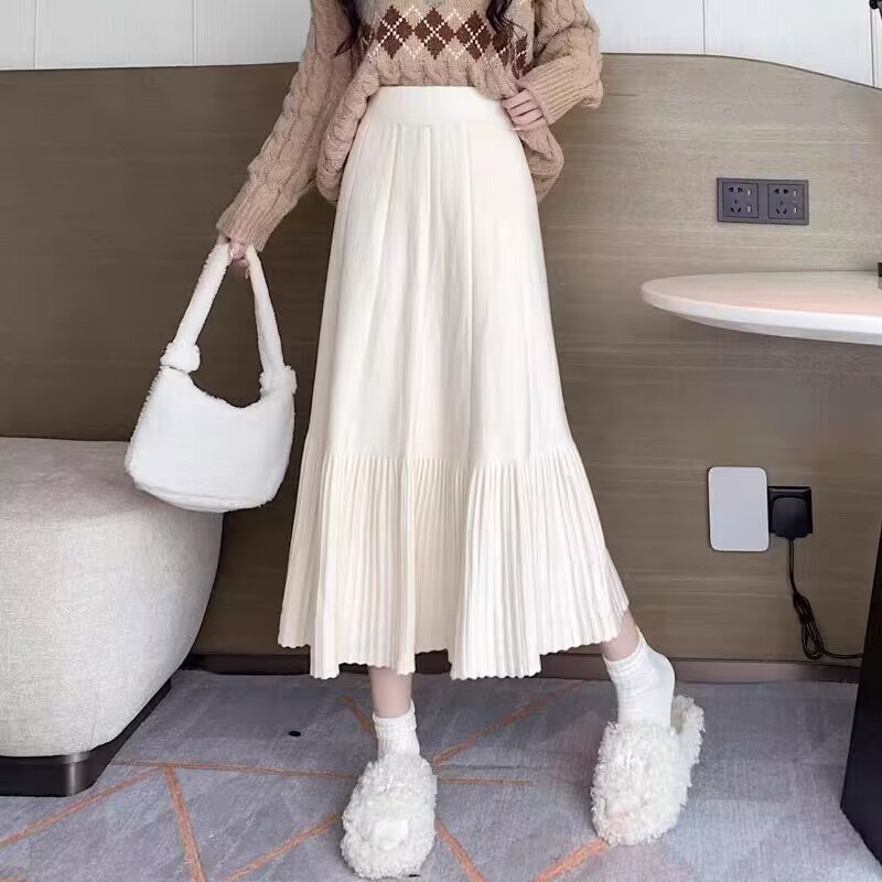 RM33331#针织白色荷叶边半身裙女2024春秋显瘦百褶大摆裙减龄中长款a字裙