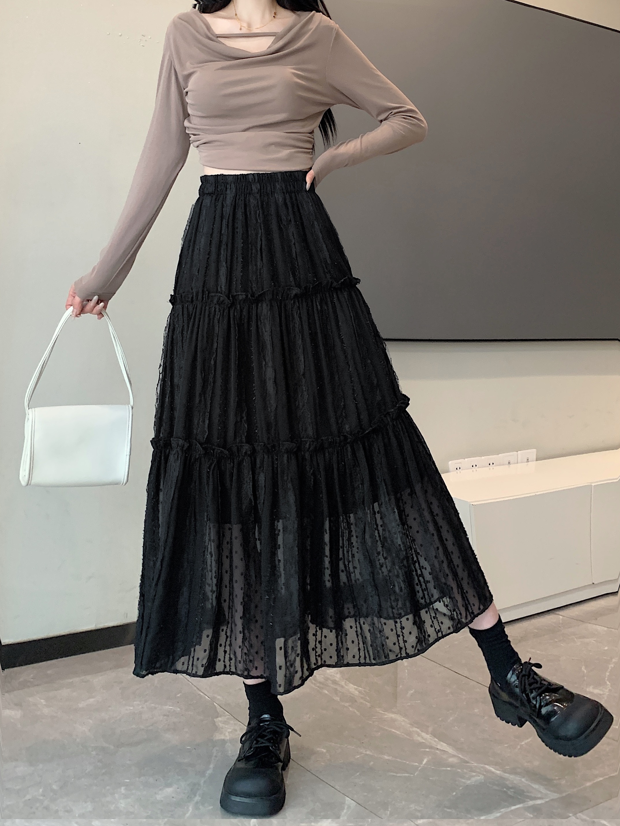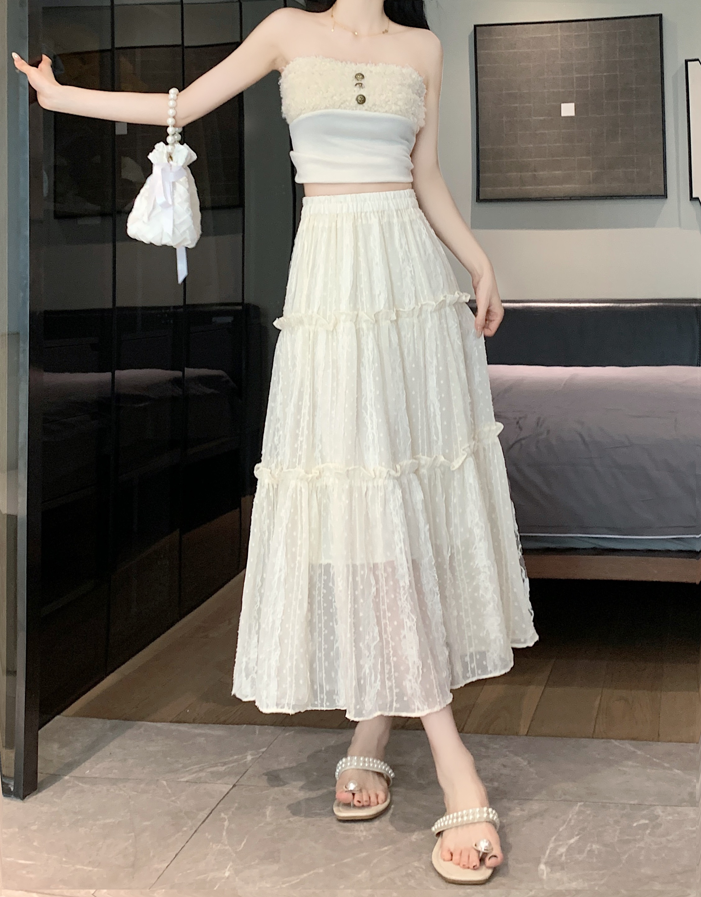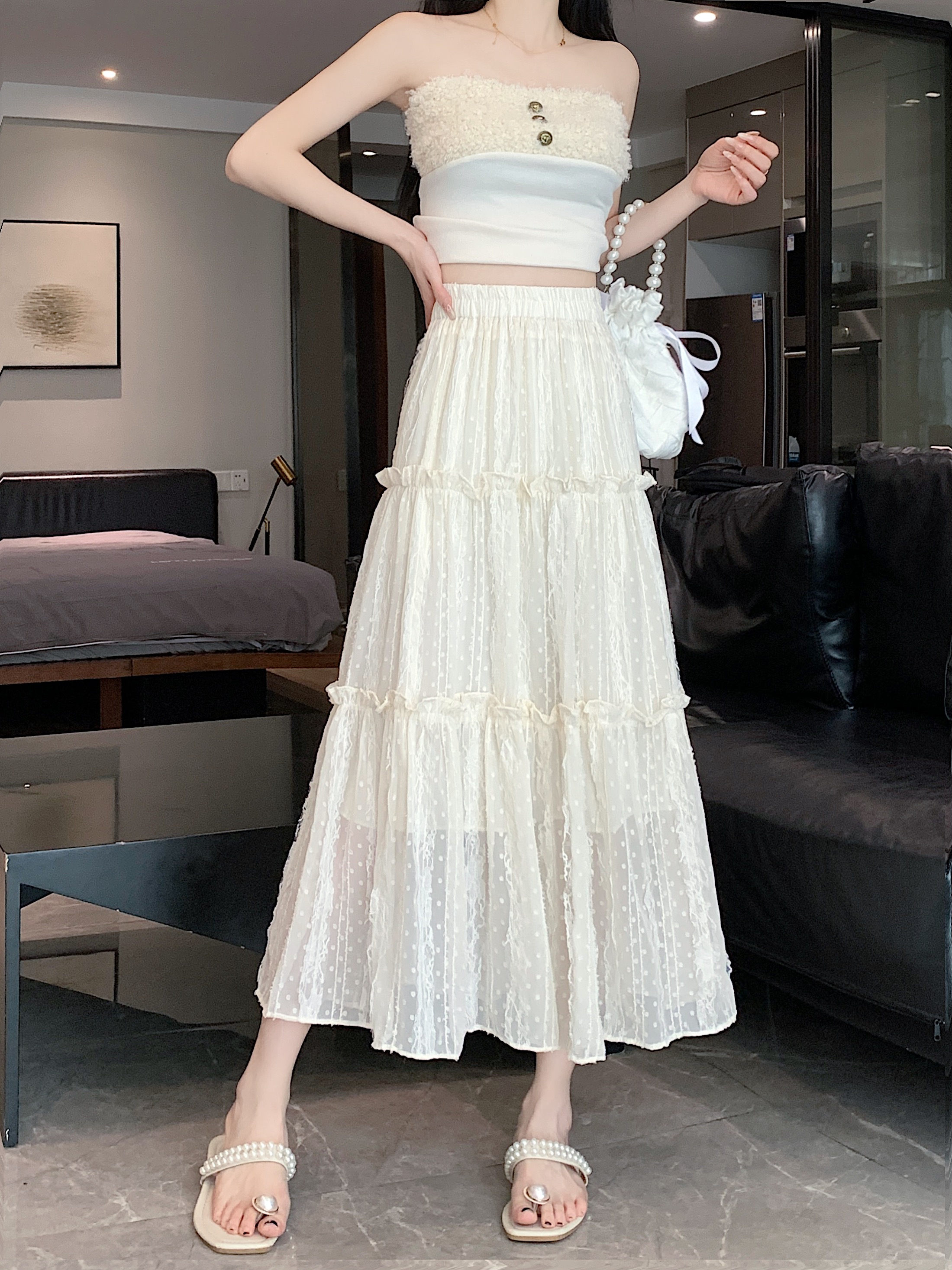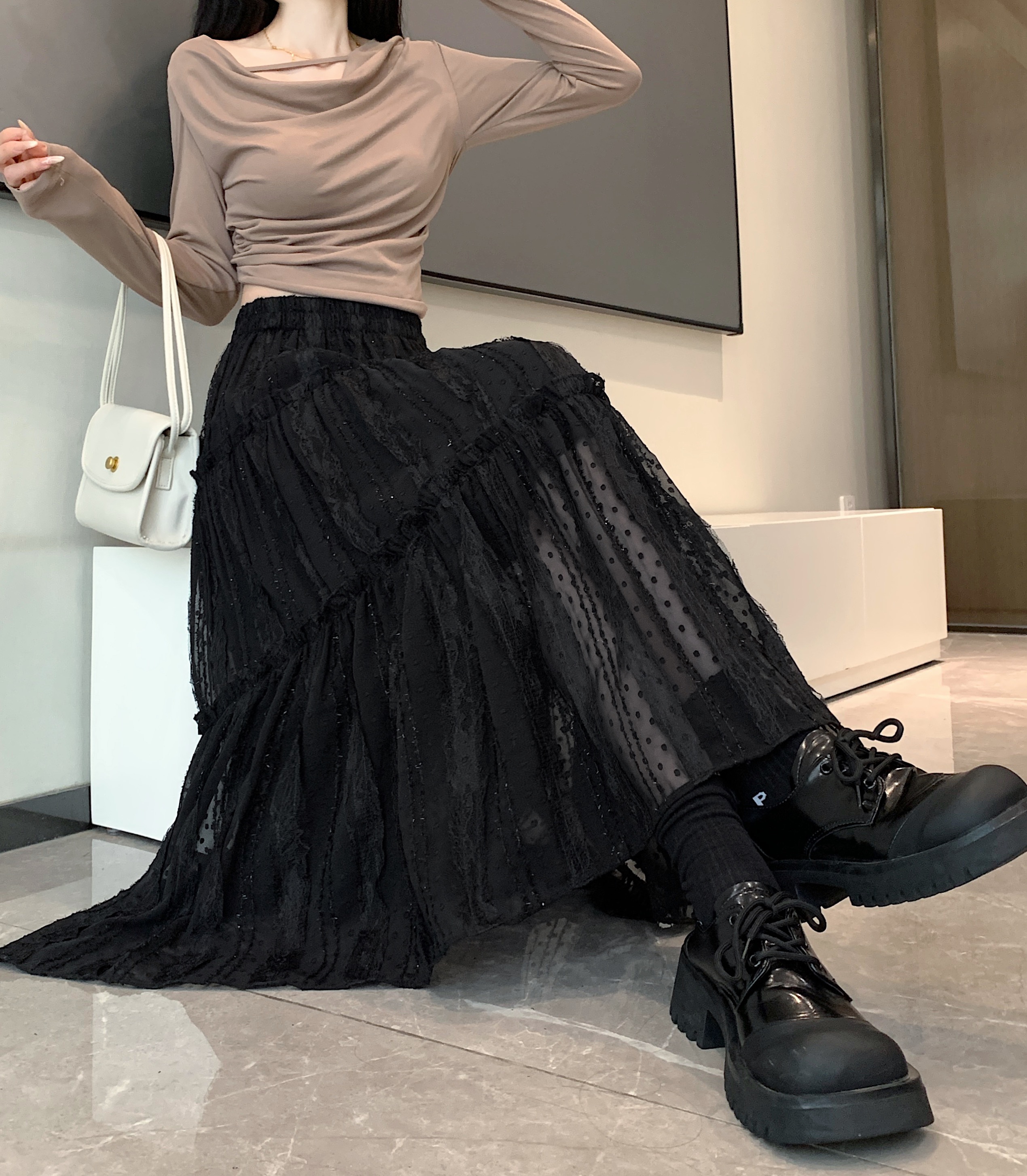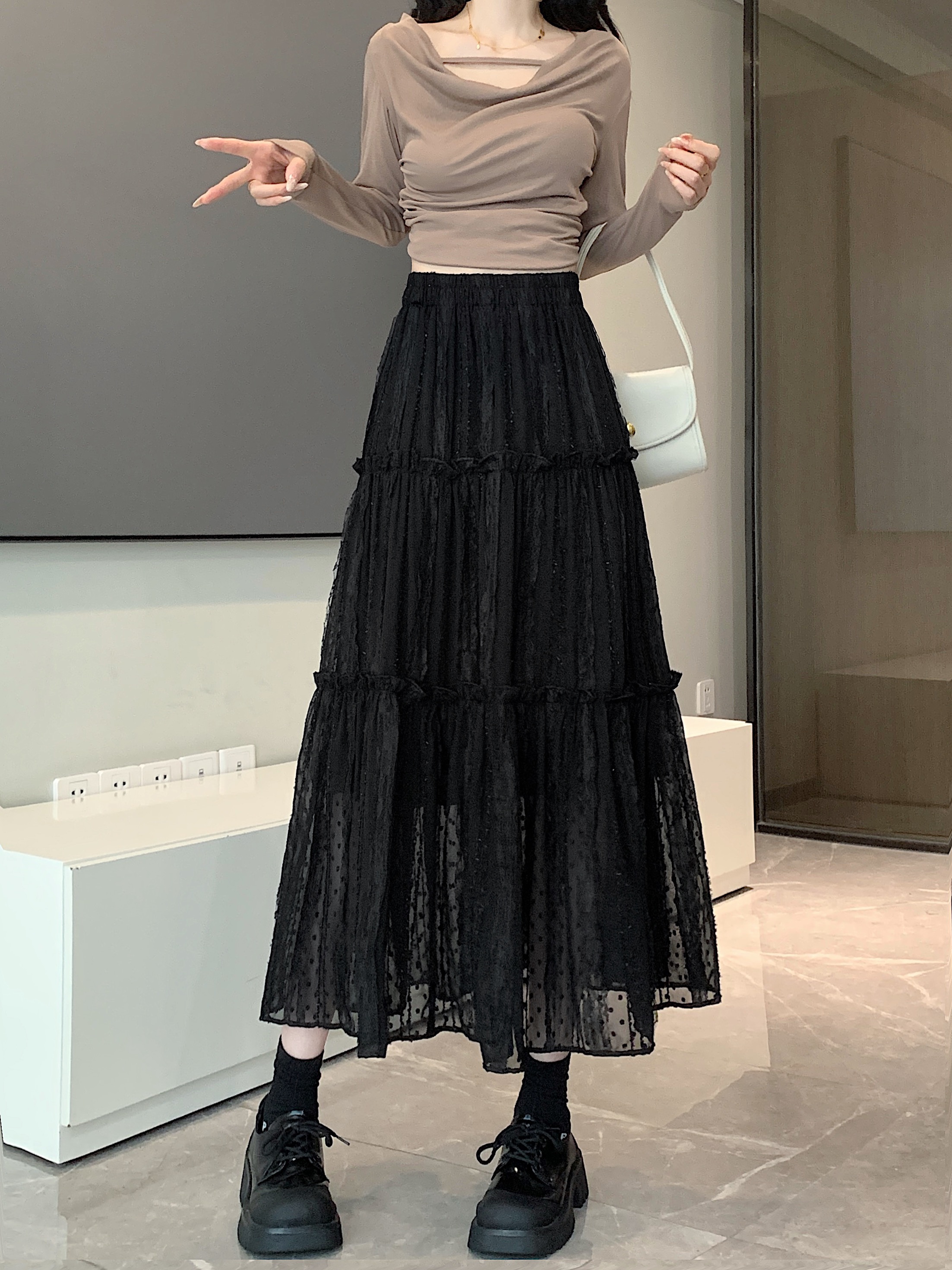 RM33448#新款法式甜美立体网纱拼接半身裙女高腰木耳边A字蛋糕裙