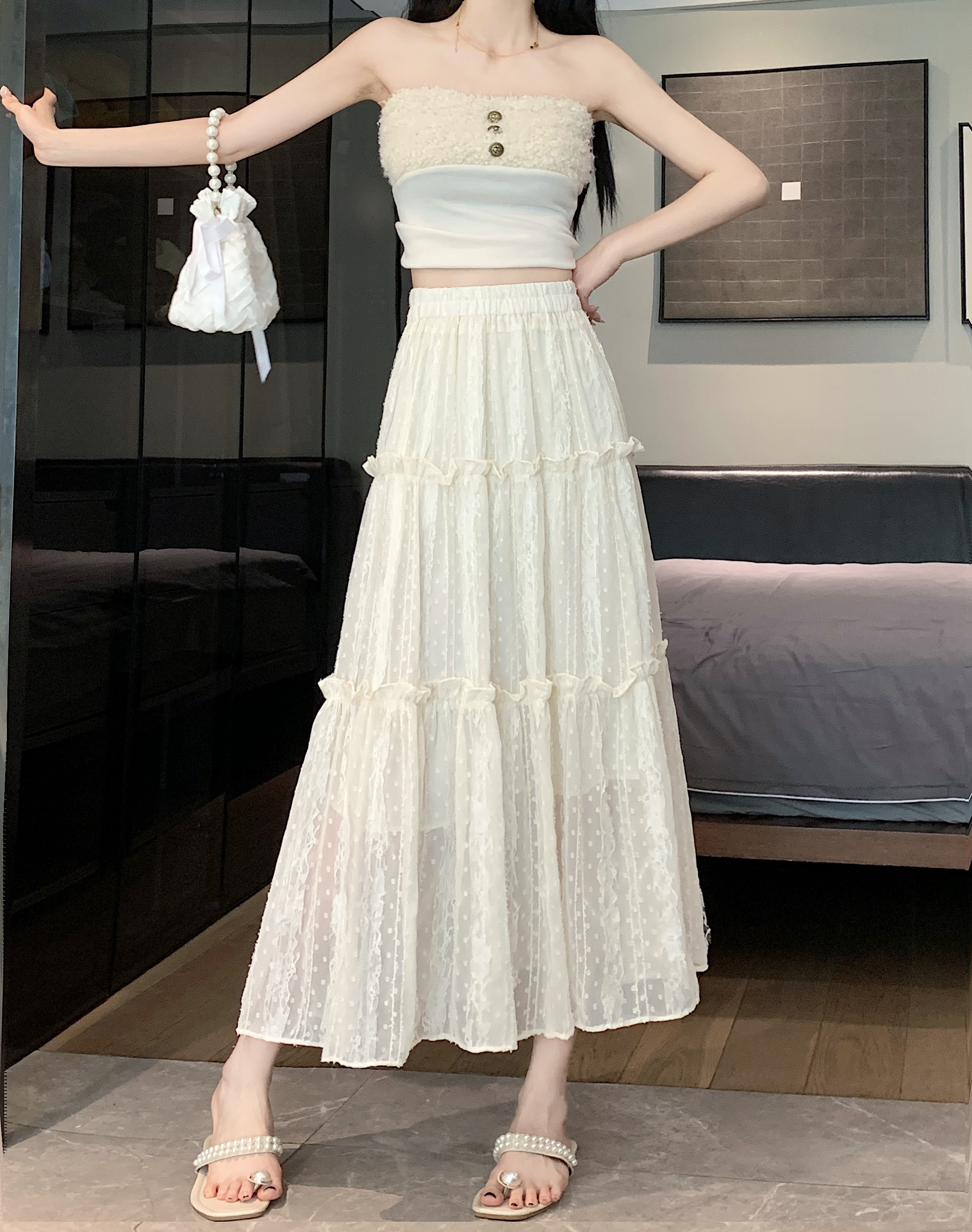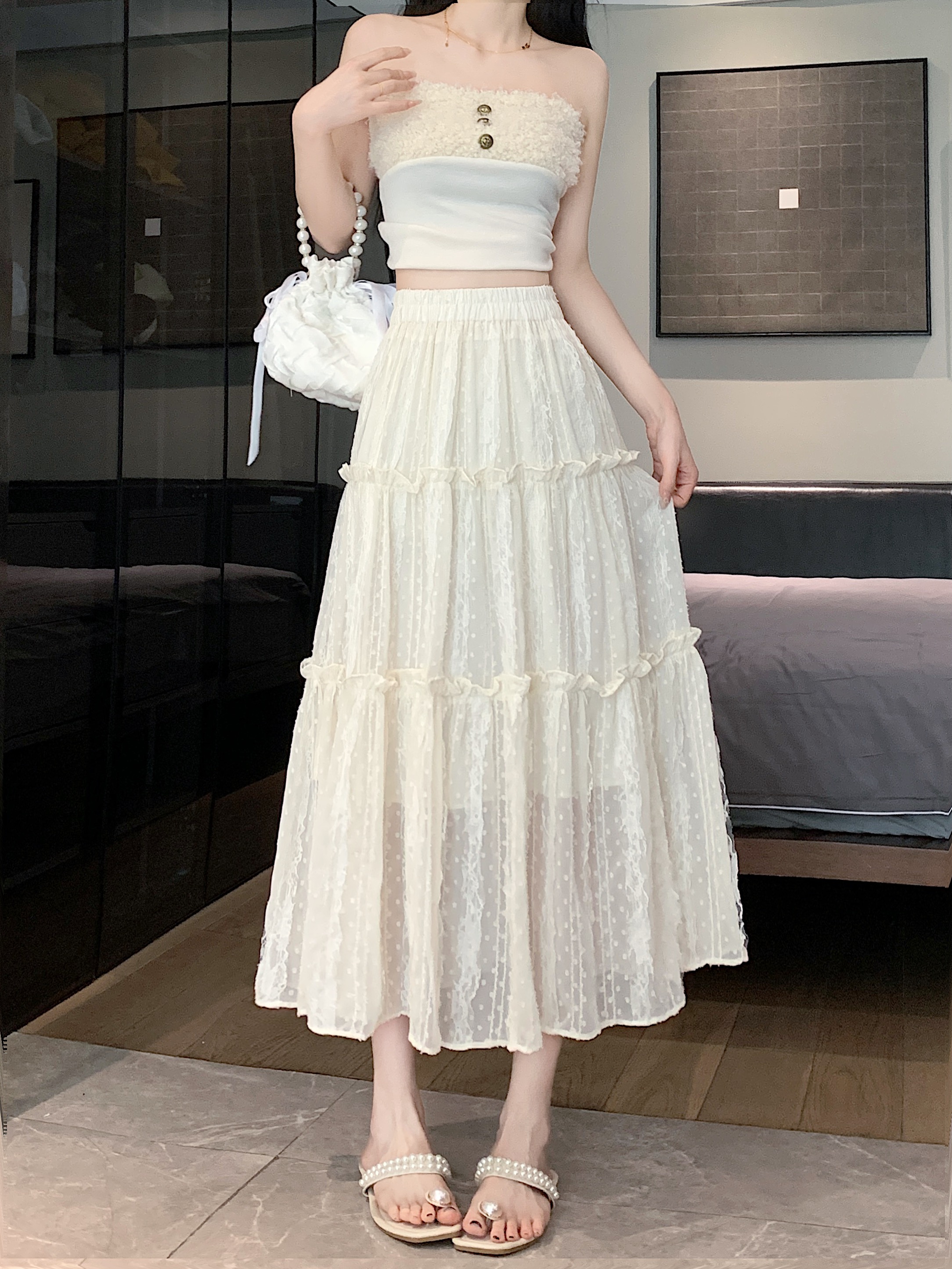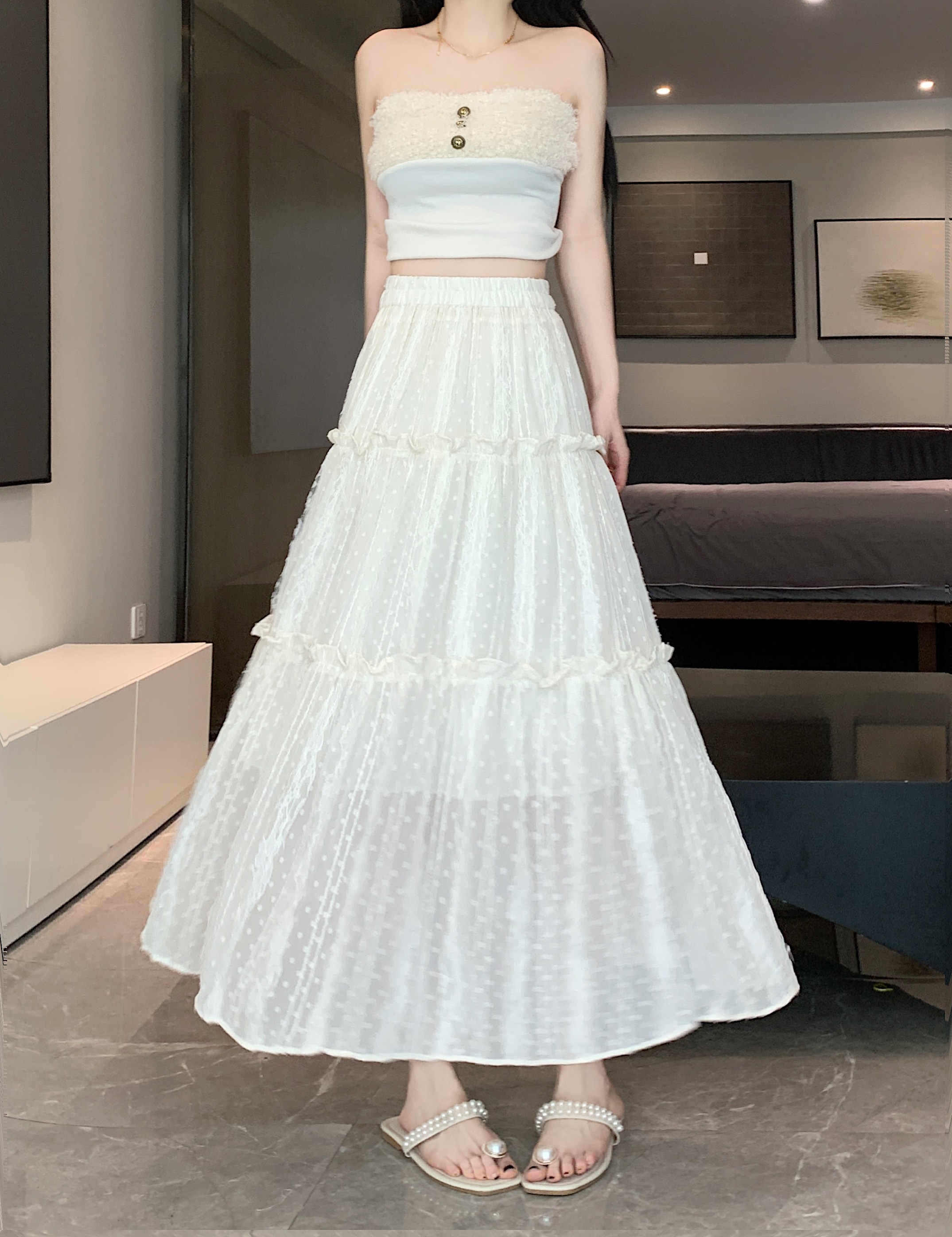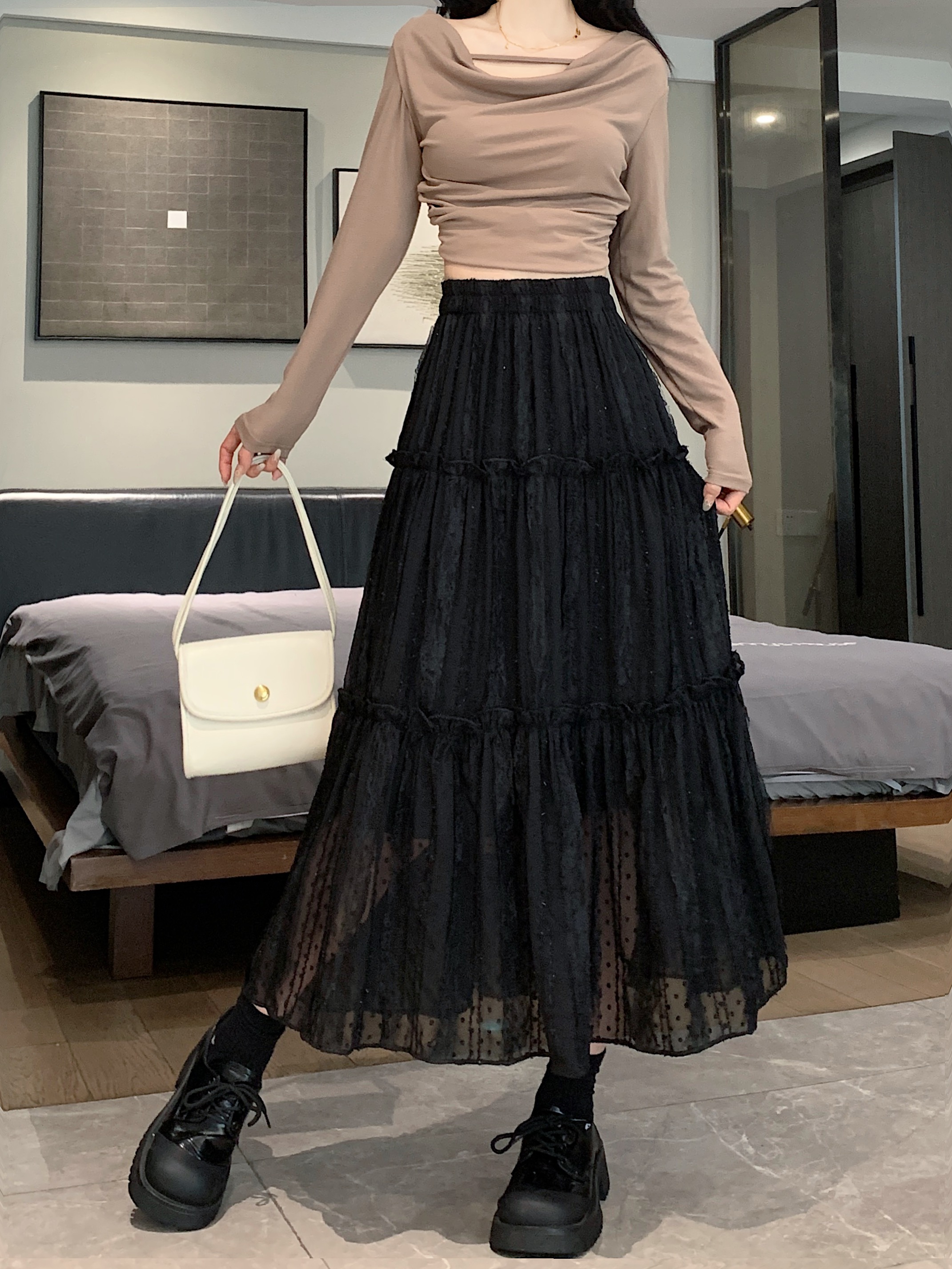 RM33448#新款法式甜美立体网纱拼接半身裙女高腰木耳边A字蛋糕裙
