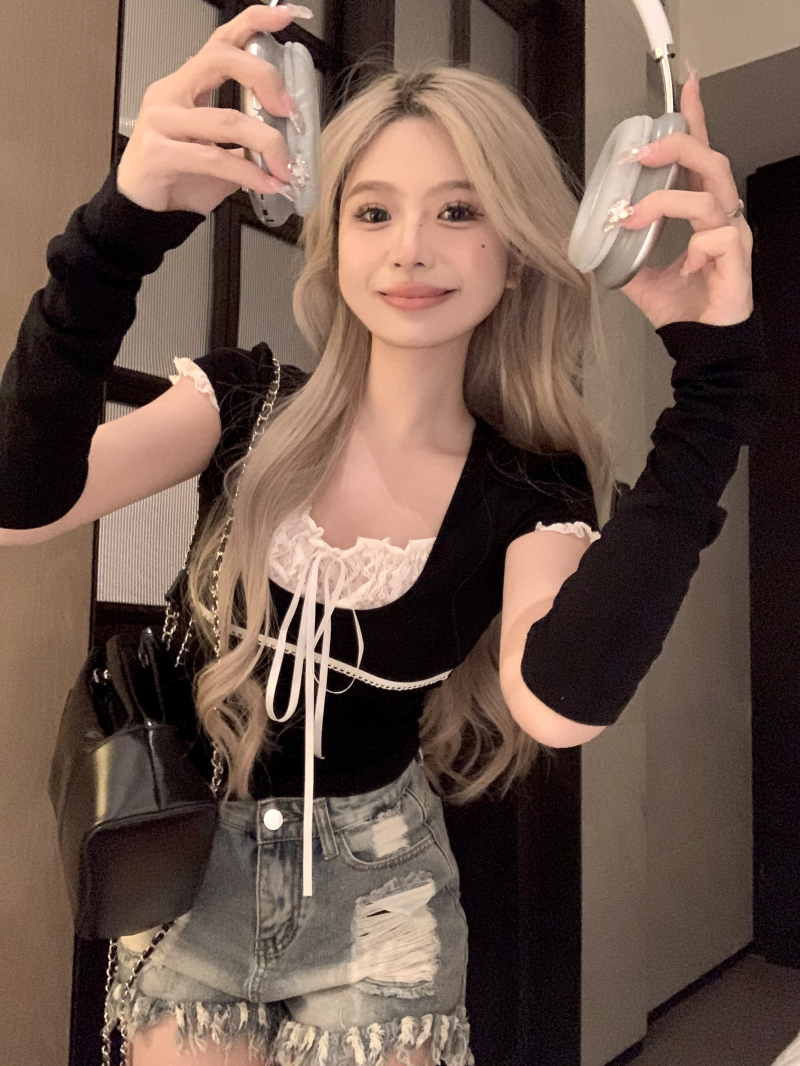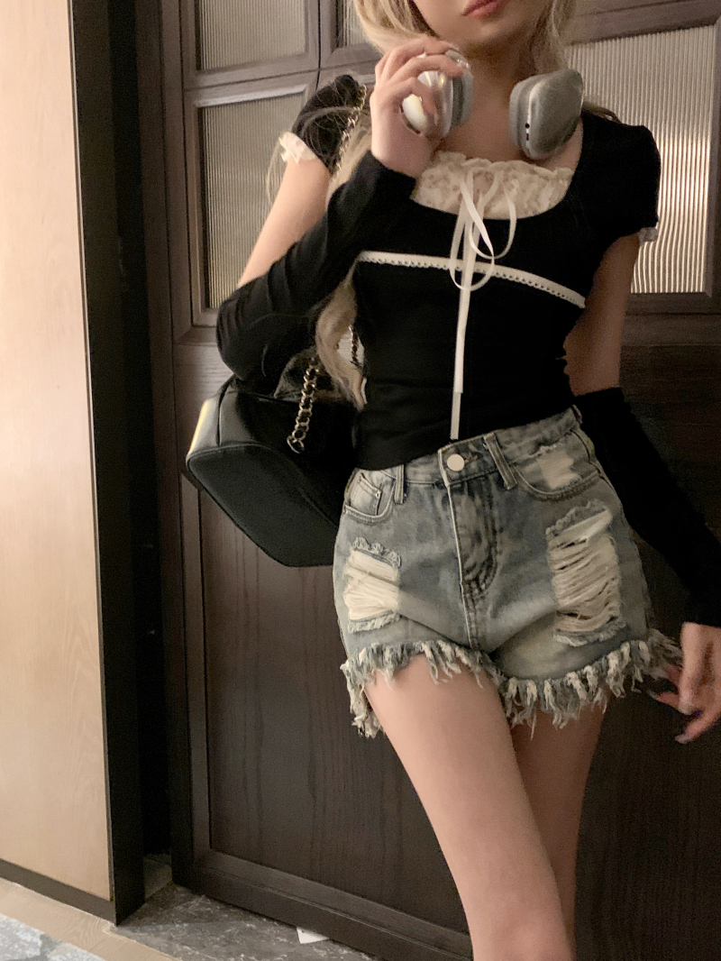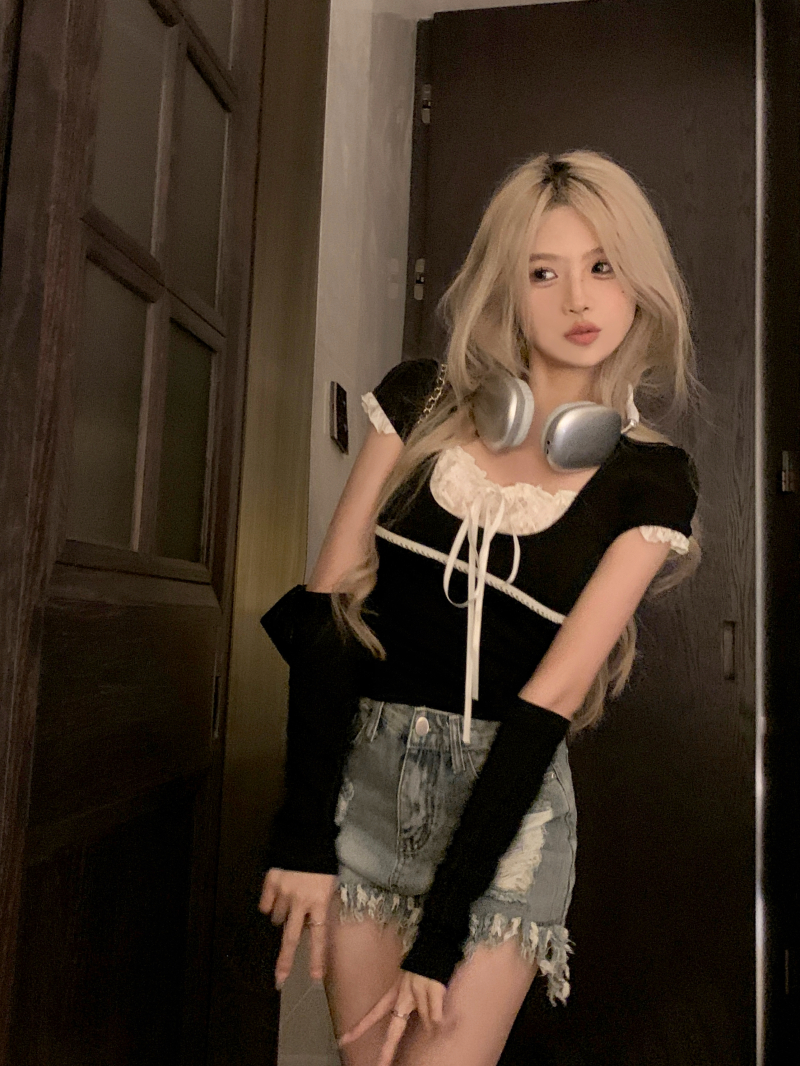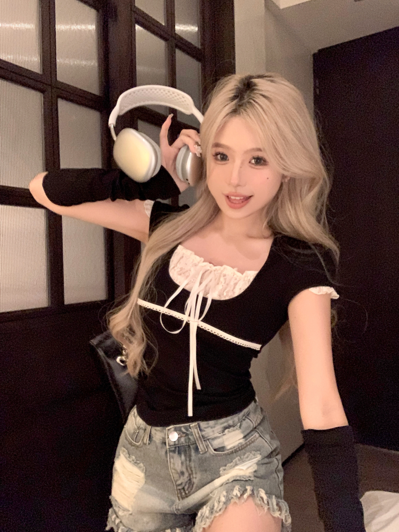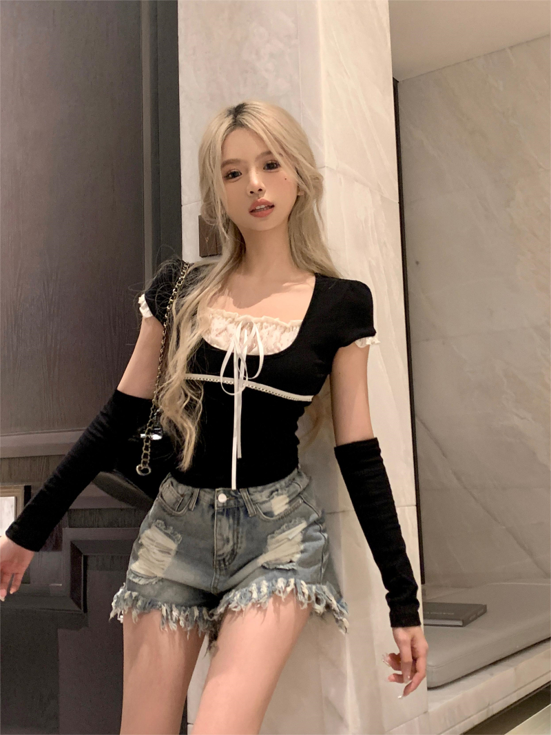 RM33689#辣欲doll感 黑色修身蕾丝显瘦t恤设计感U领短袖夏