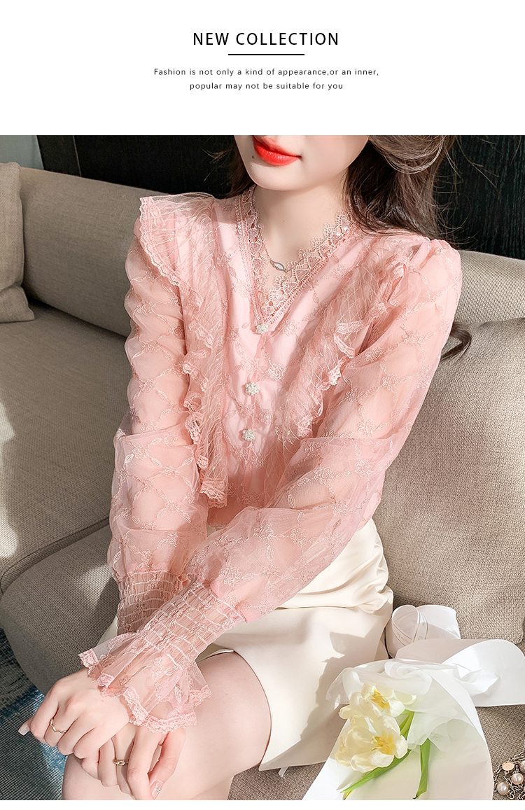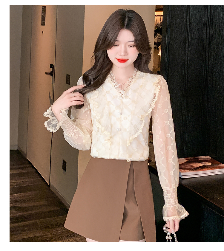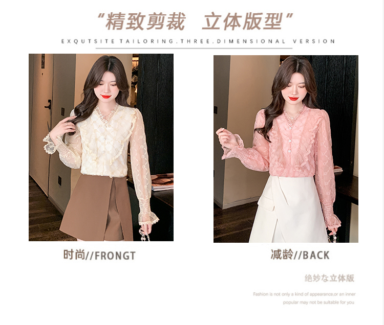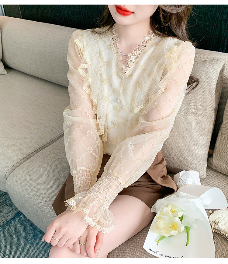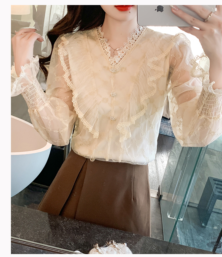 RM33917#新款重工刺绣蕾丝雪纺衫女荷叶边时尚气质上衣