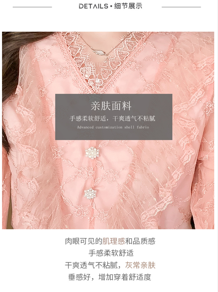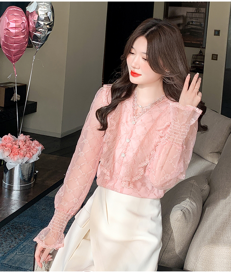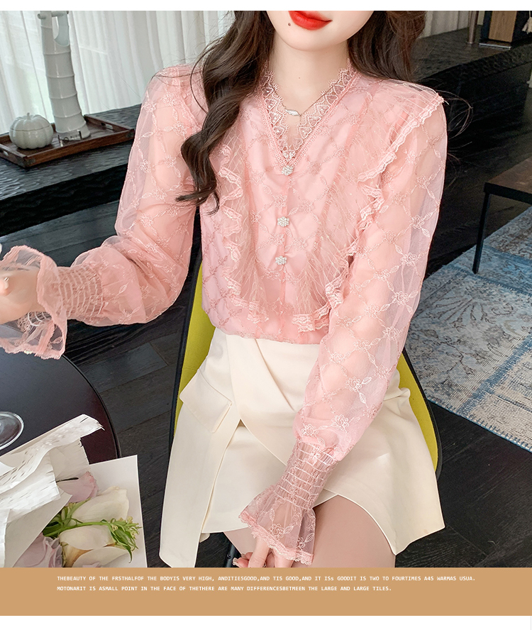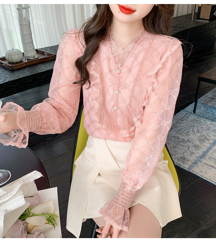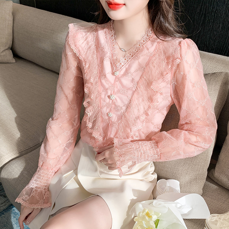 RM33917#新款重工刺绣蕾丝雪纺衫女荷叶边时尚气质上衣
