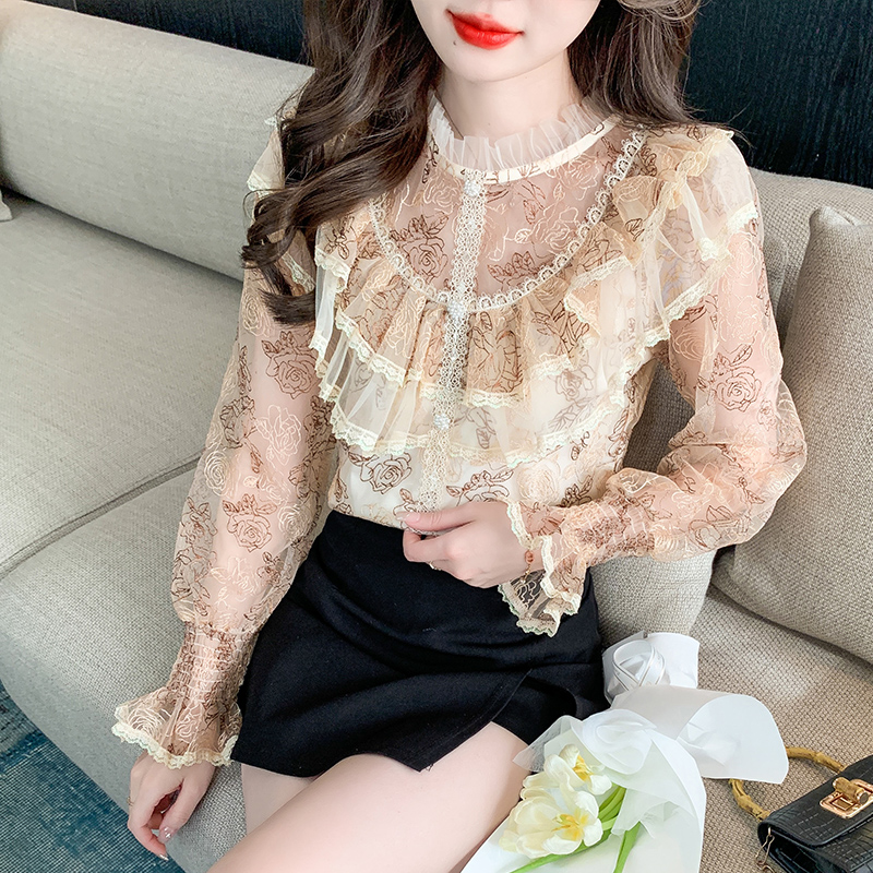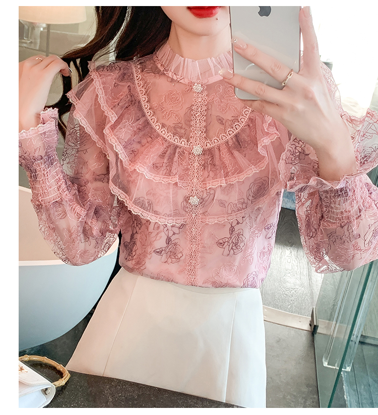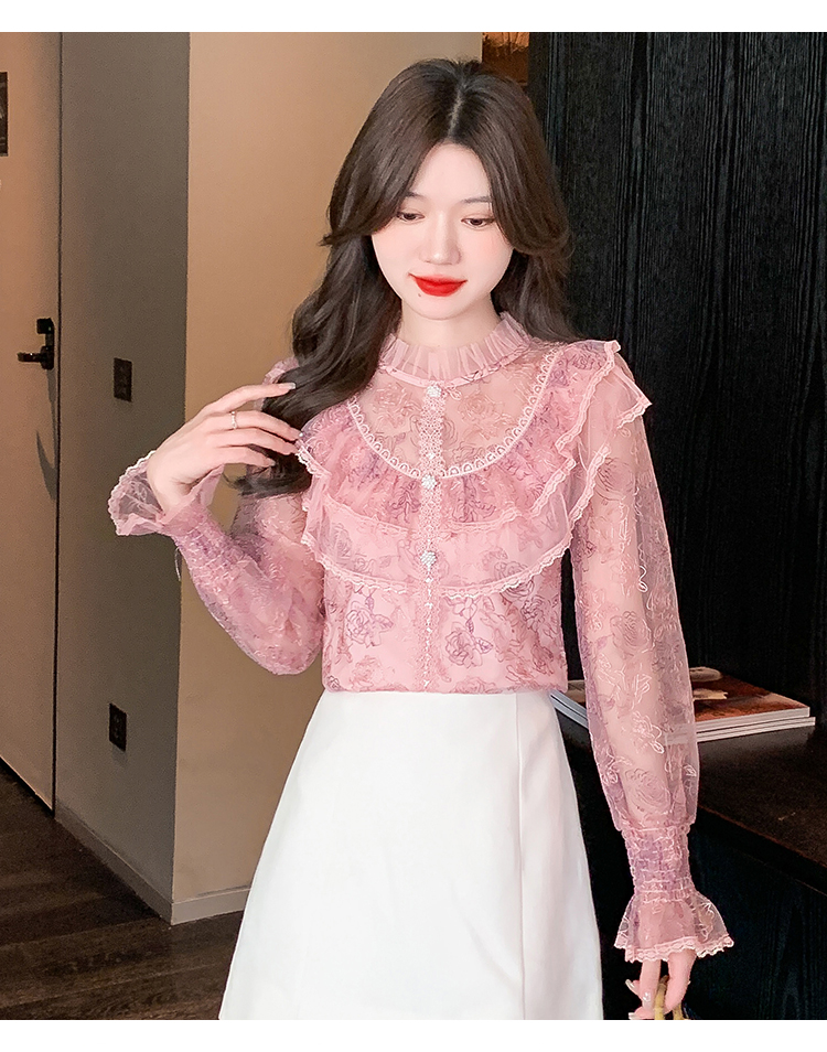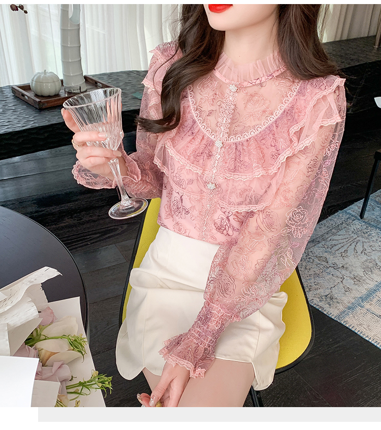 RM33918#新款重工刺绣蕾丝雪纺衫女荷叶边时尚气质上衣
