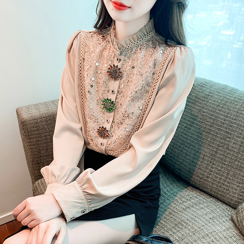 RM33921#新款复古亮片钉钻长袖百塔雪纺衬衫上衣女