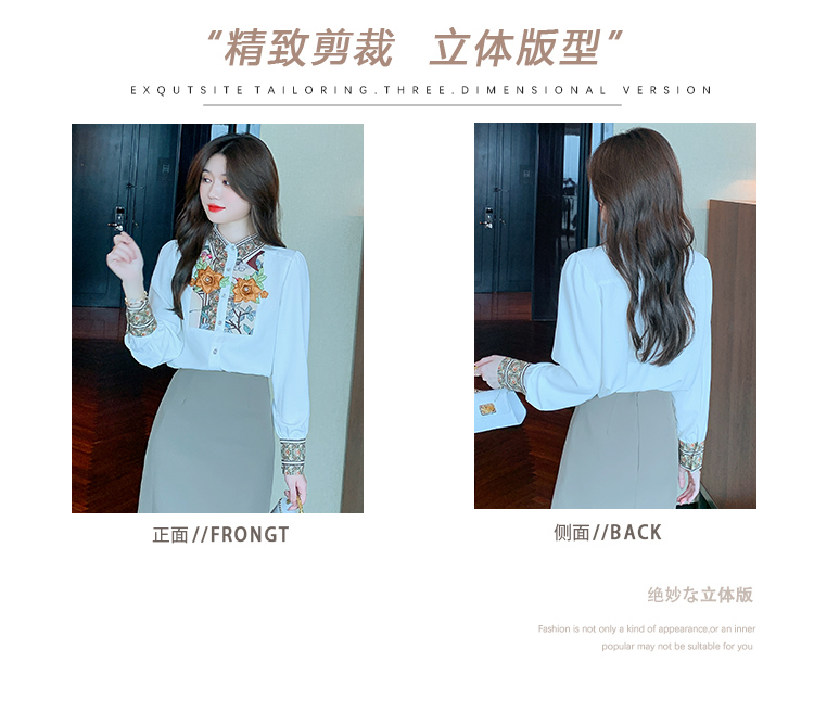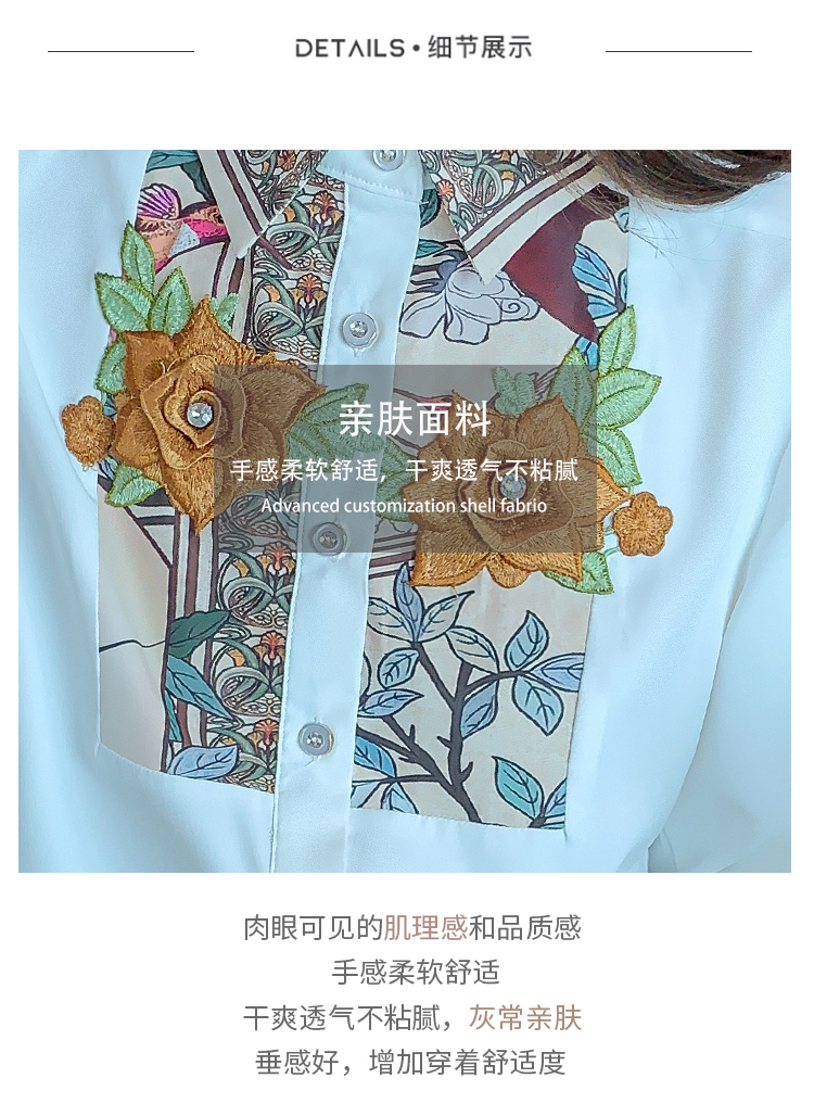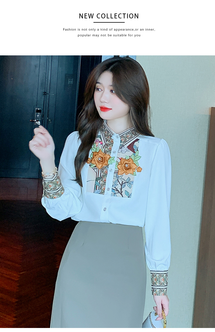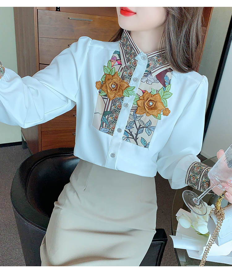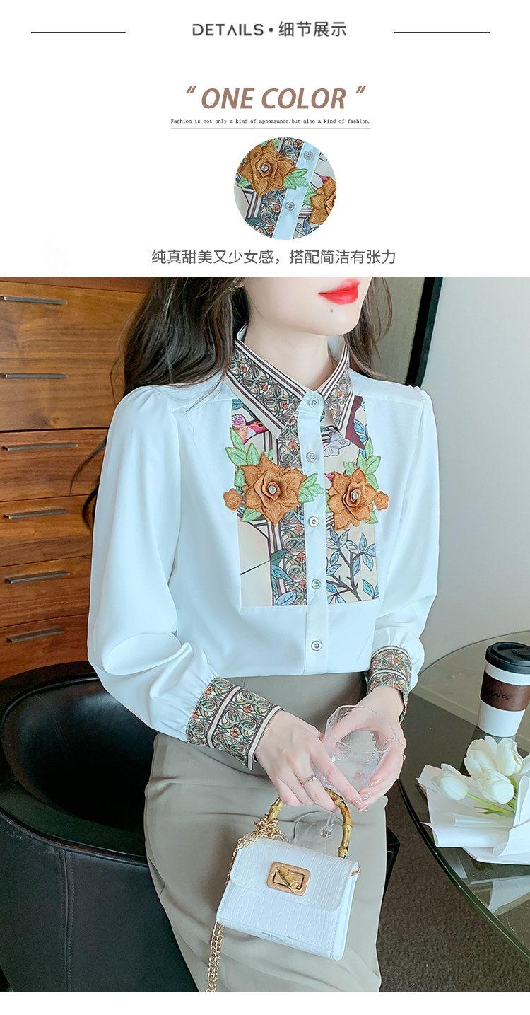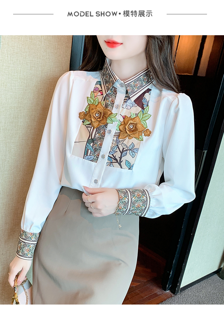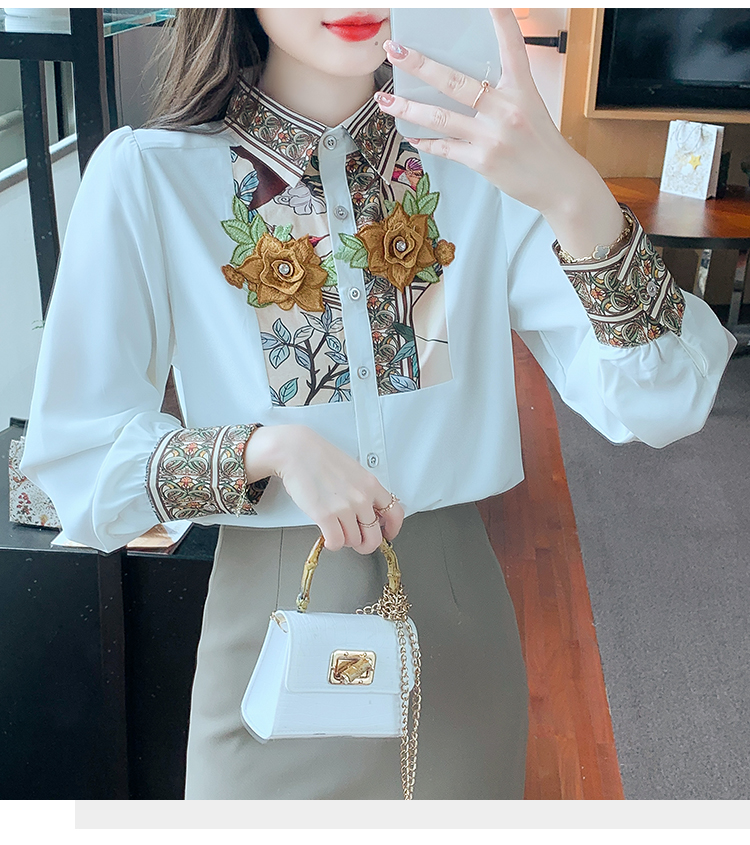 RM33923#新款韩版长袖重工花朵雪纺印花衬衣女