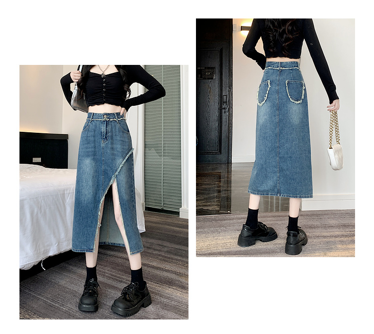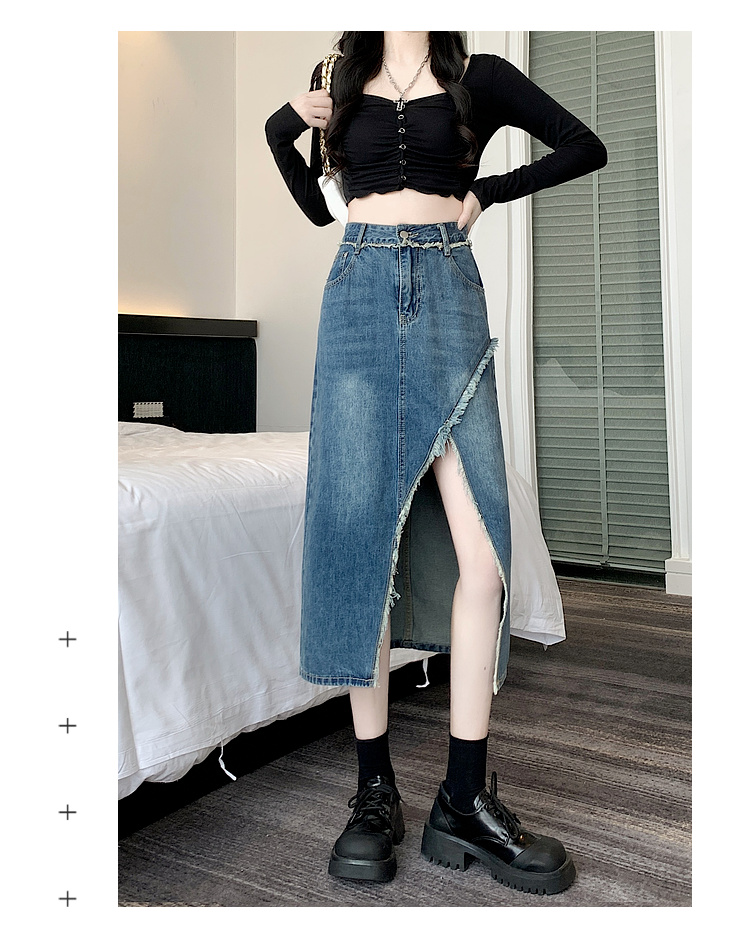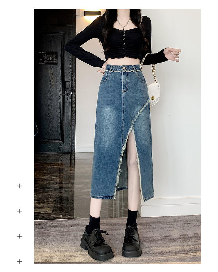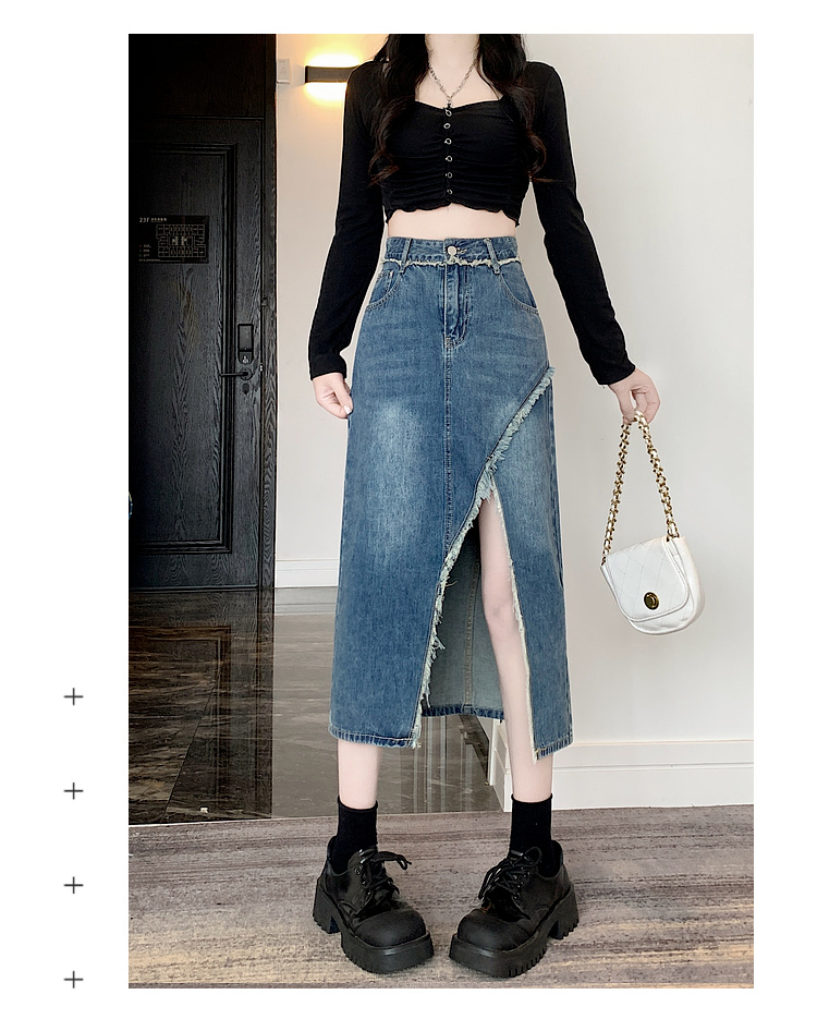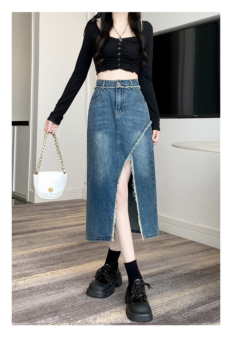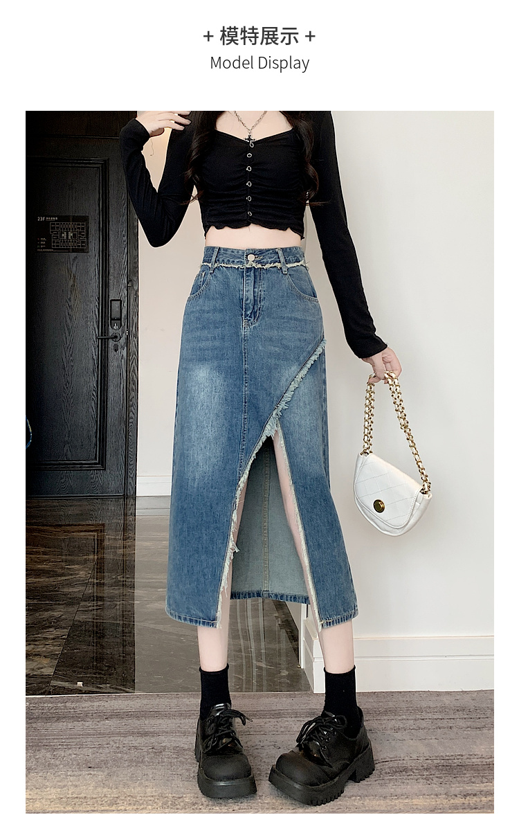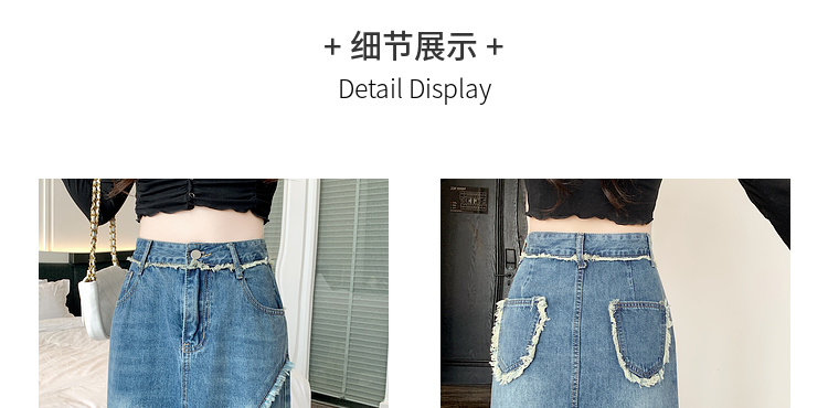 RM33929#性感辣妹水洗毛须显瘦高腰牛仔中长裙半身裙女