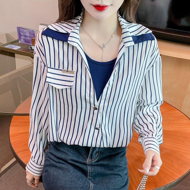 RM33935#新款百搭条纹衬衫2024设计感拼接针织内搭背心POIO领上衣