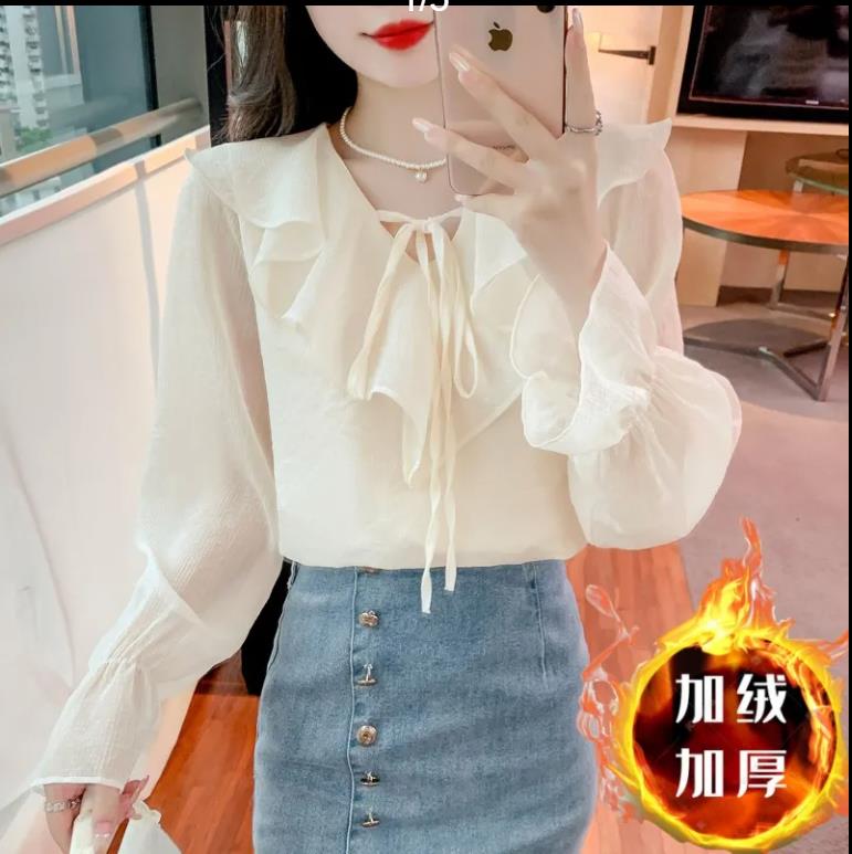 RM33966#新款法式温柔风荷叶边喇叭长袖加绒衬衫女小清新衬衣上衣