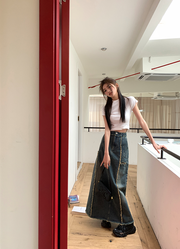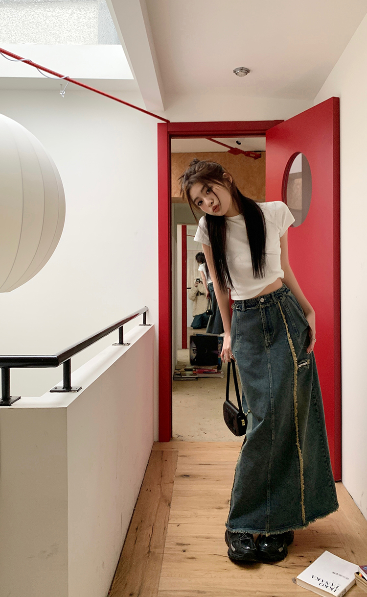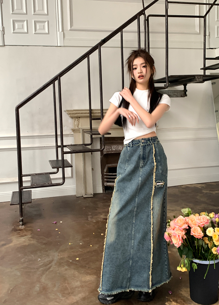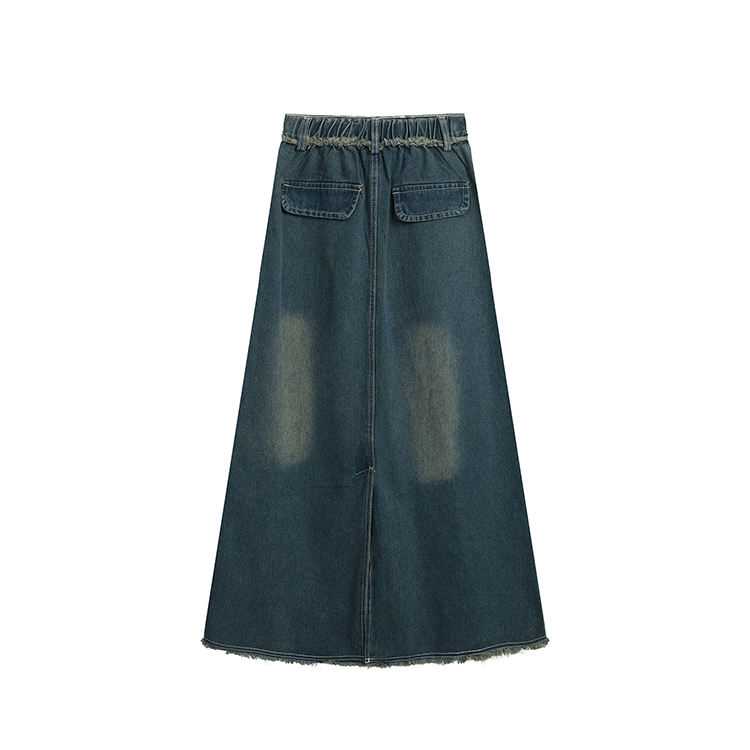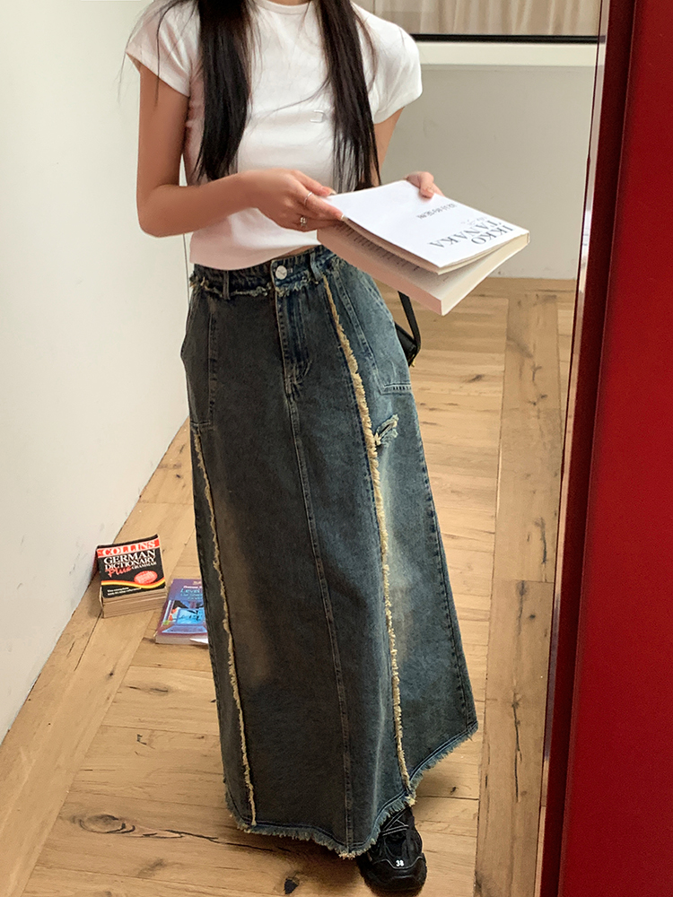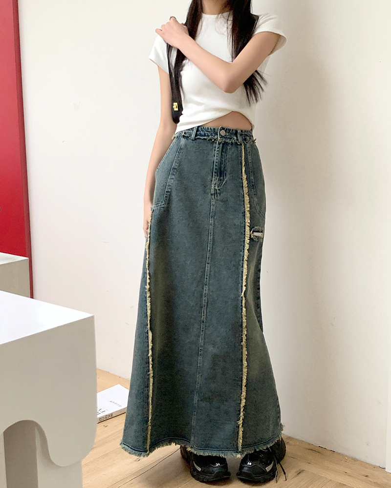 RM34057#春夏新款显高瘦设计感复古毛边开叉牛仔裙子半身裙长裙女