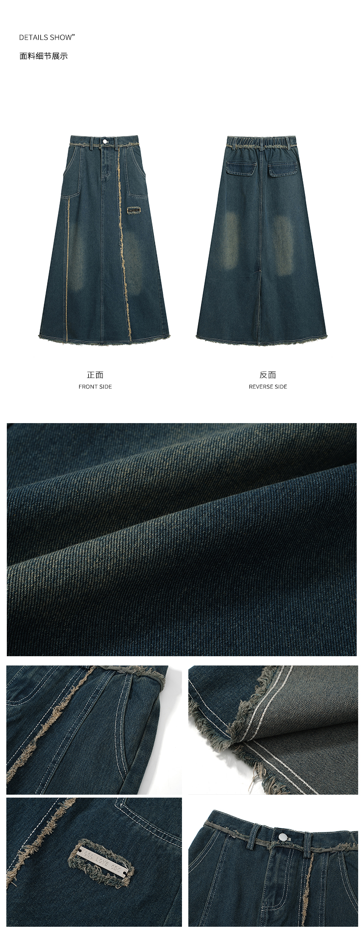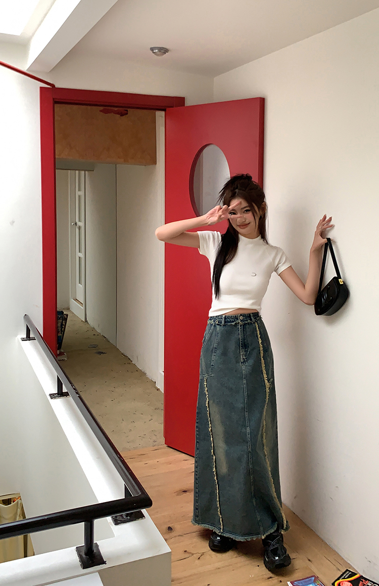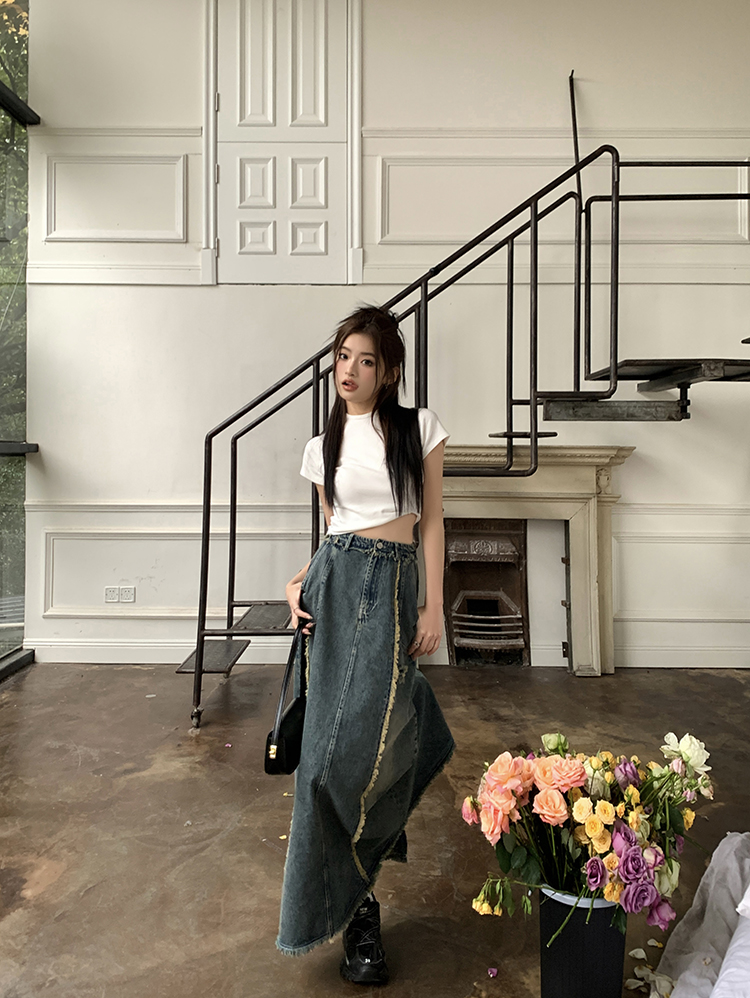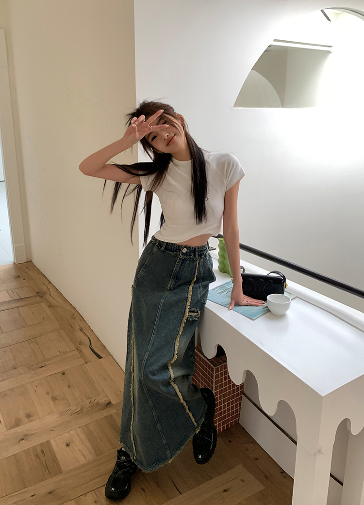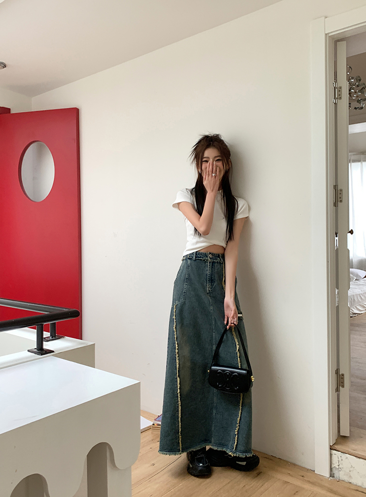 RM34057#春夏新款显高瘦设计感复古毛边开叉牛仔裙子半身裙长裙女