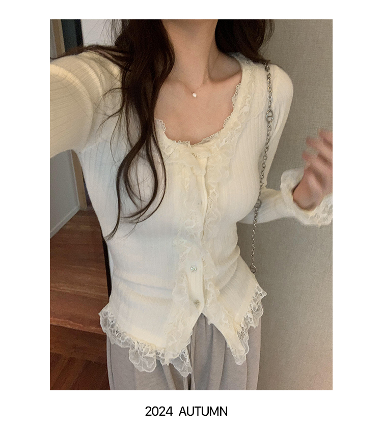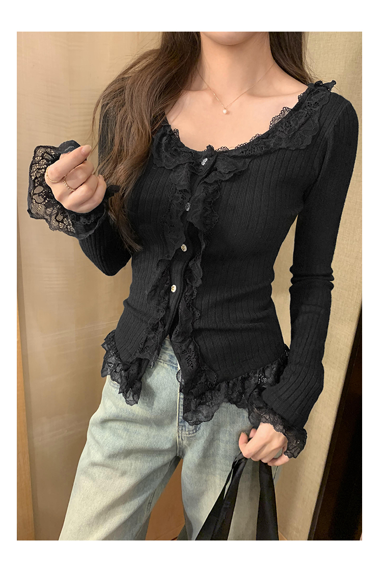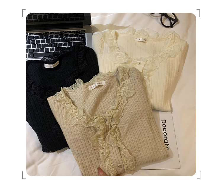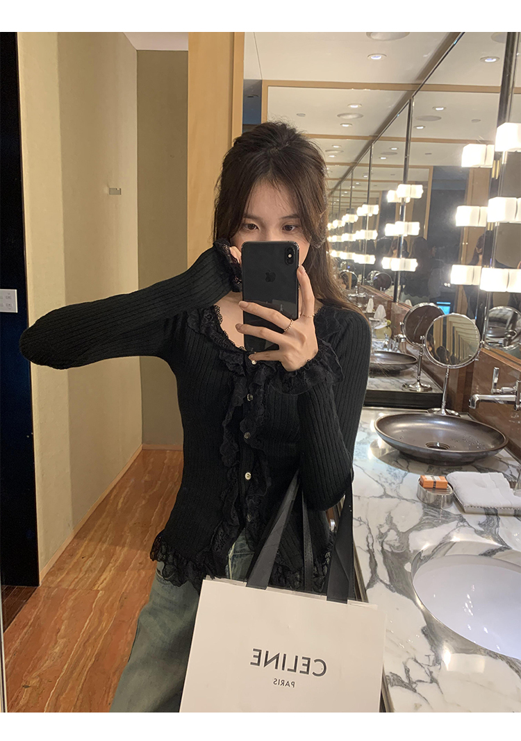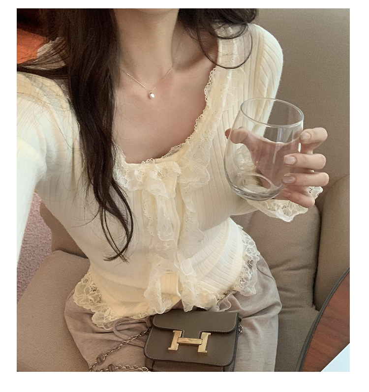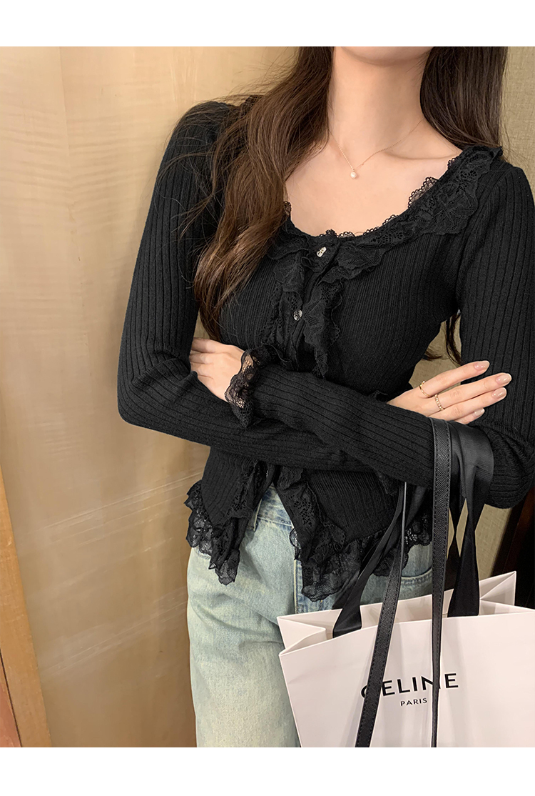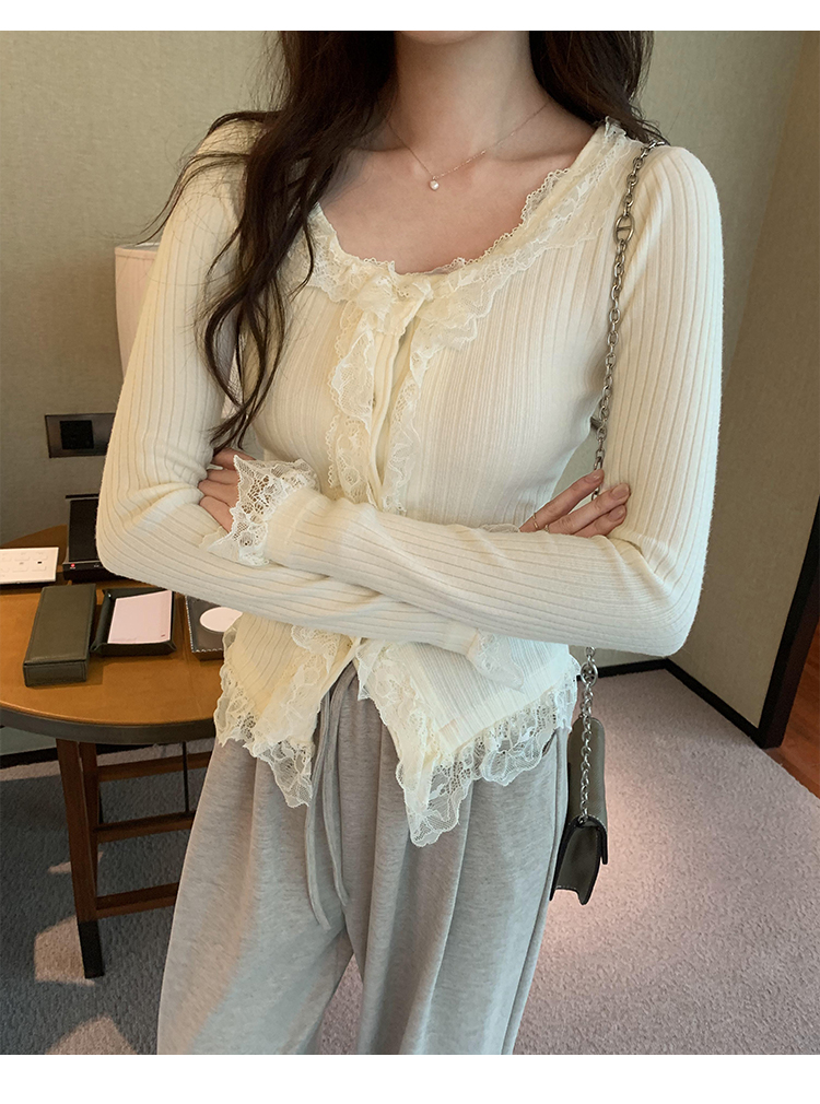 PF05#蕾丝花边长袖开衫针织衫女 新款法式内搭正肩上衣