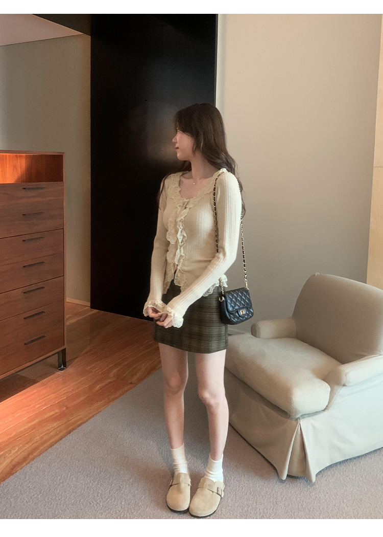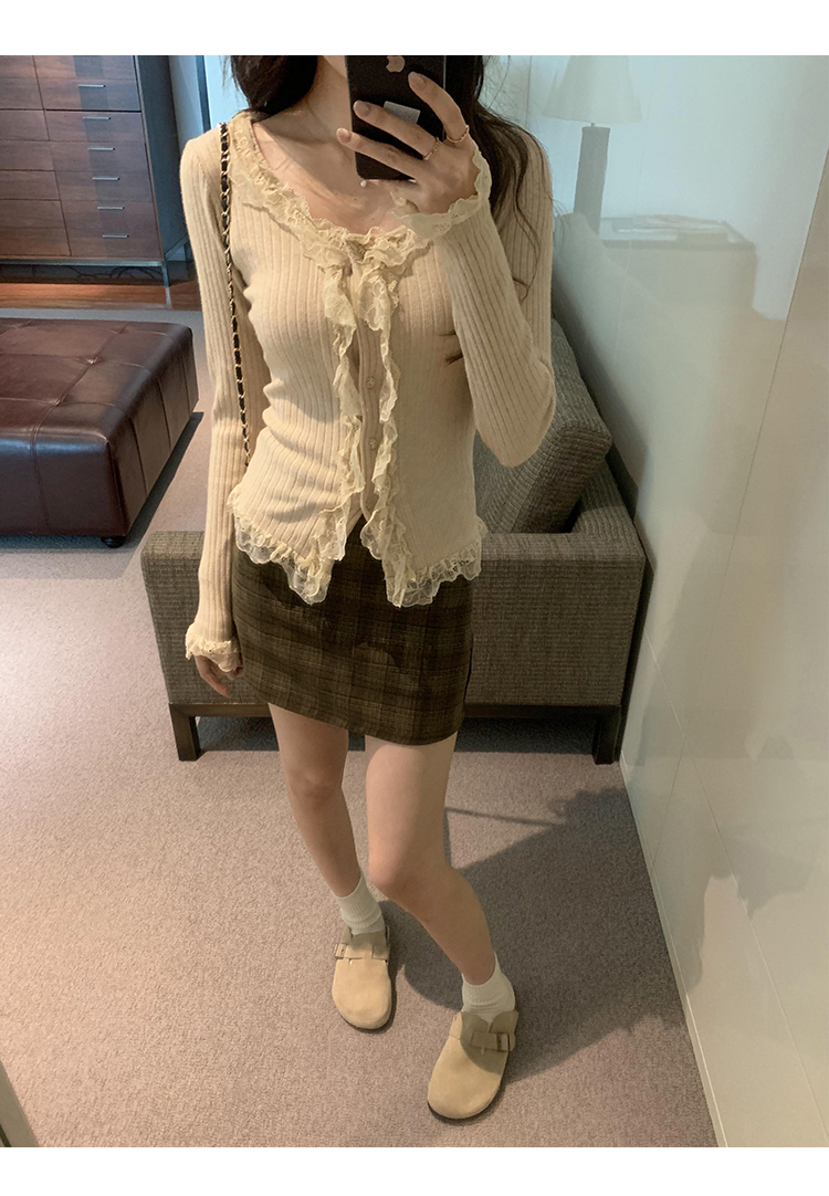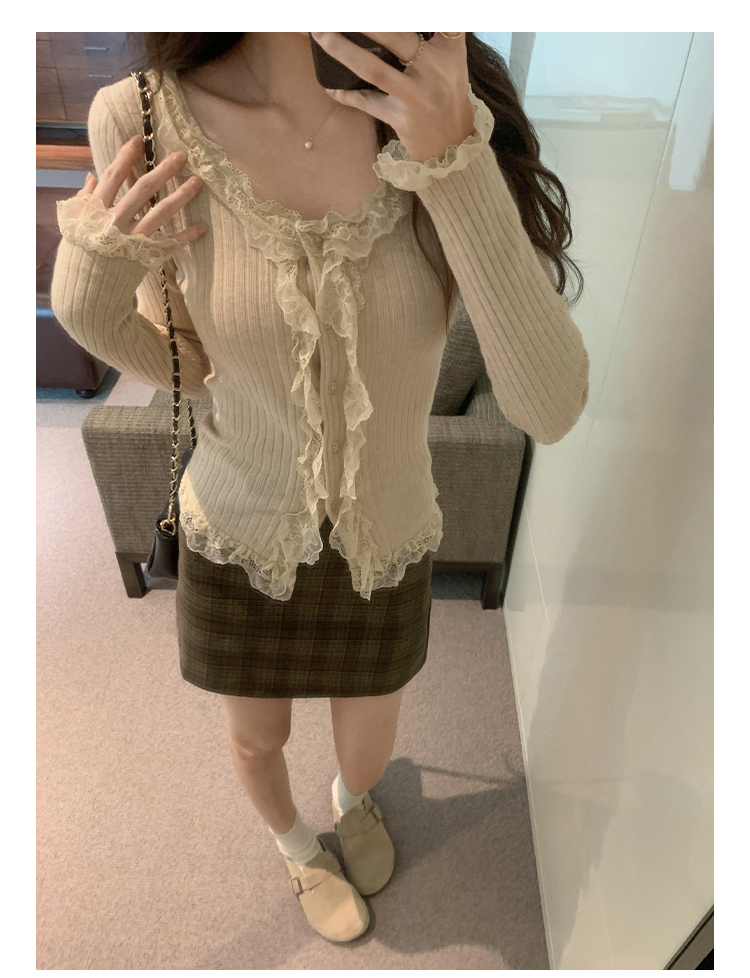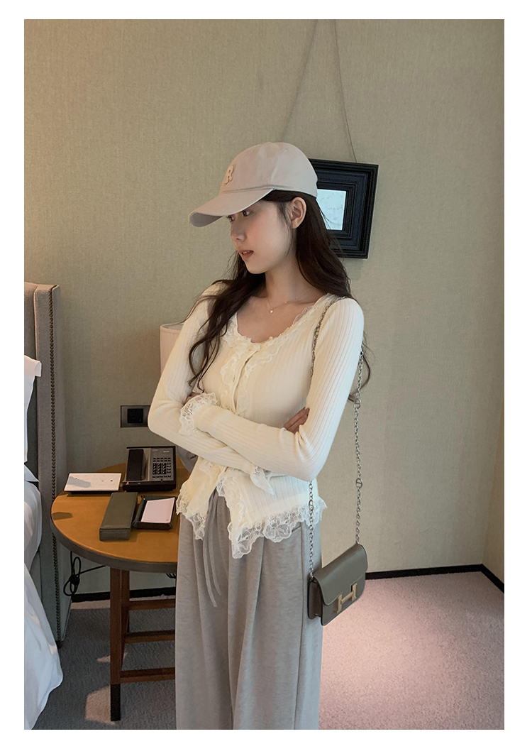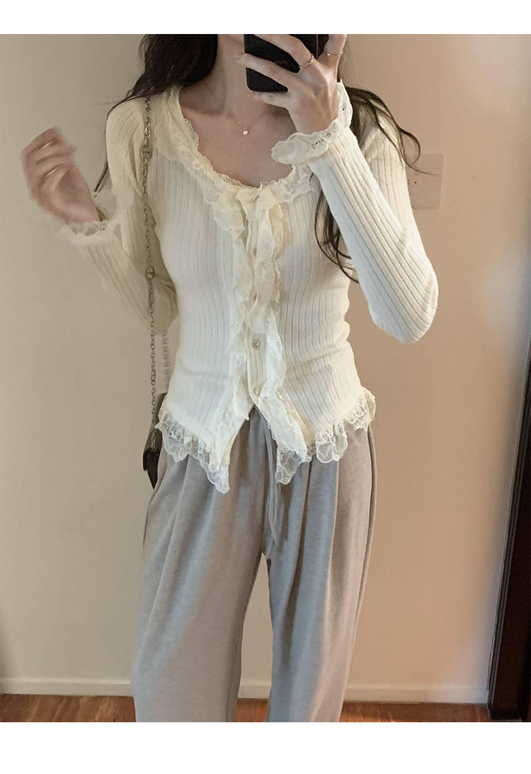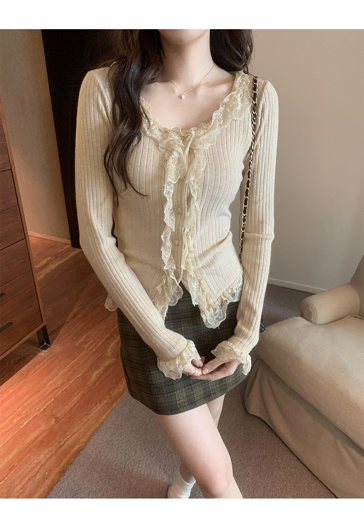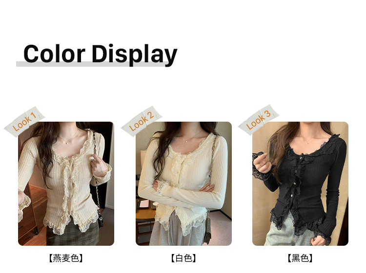 PF05#蕾丝花边长袖开衫针织衫女 新款法式内搭正肩上衣