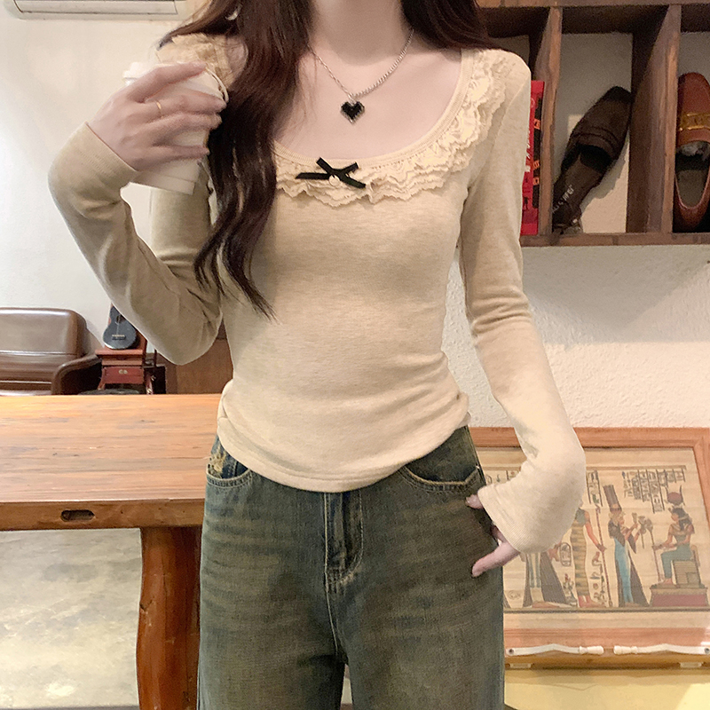 PF32#甜美风蕾丝拼接圆领打底衫女春季别致蝴蝶结内搭气质上衣
