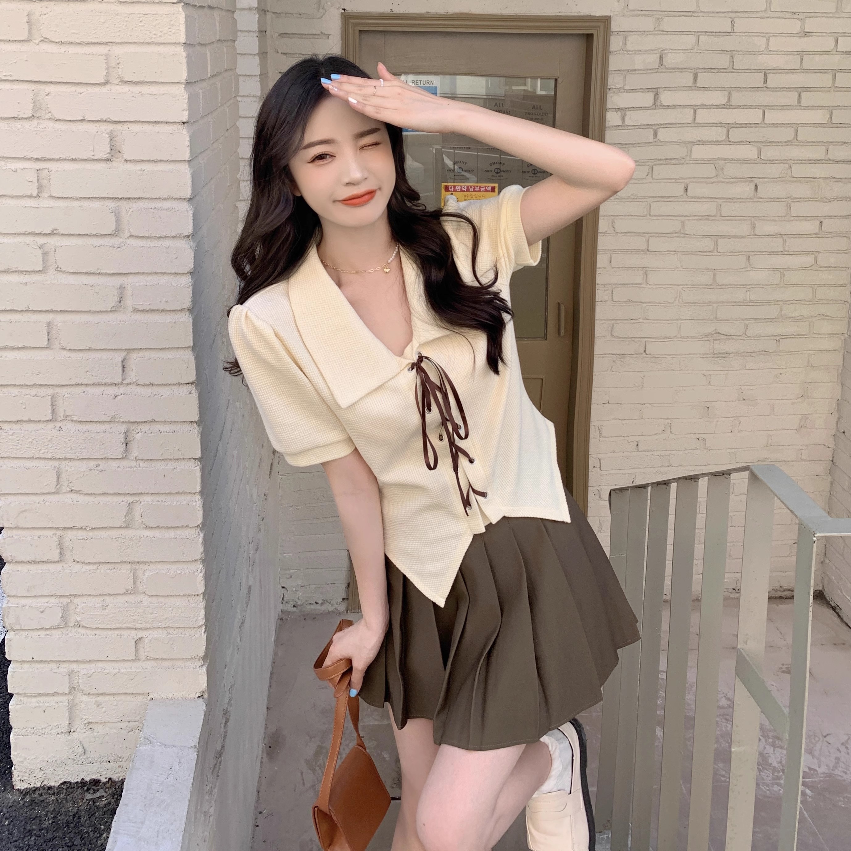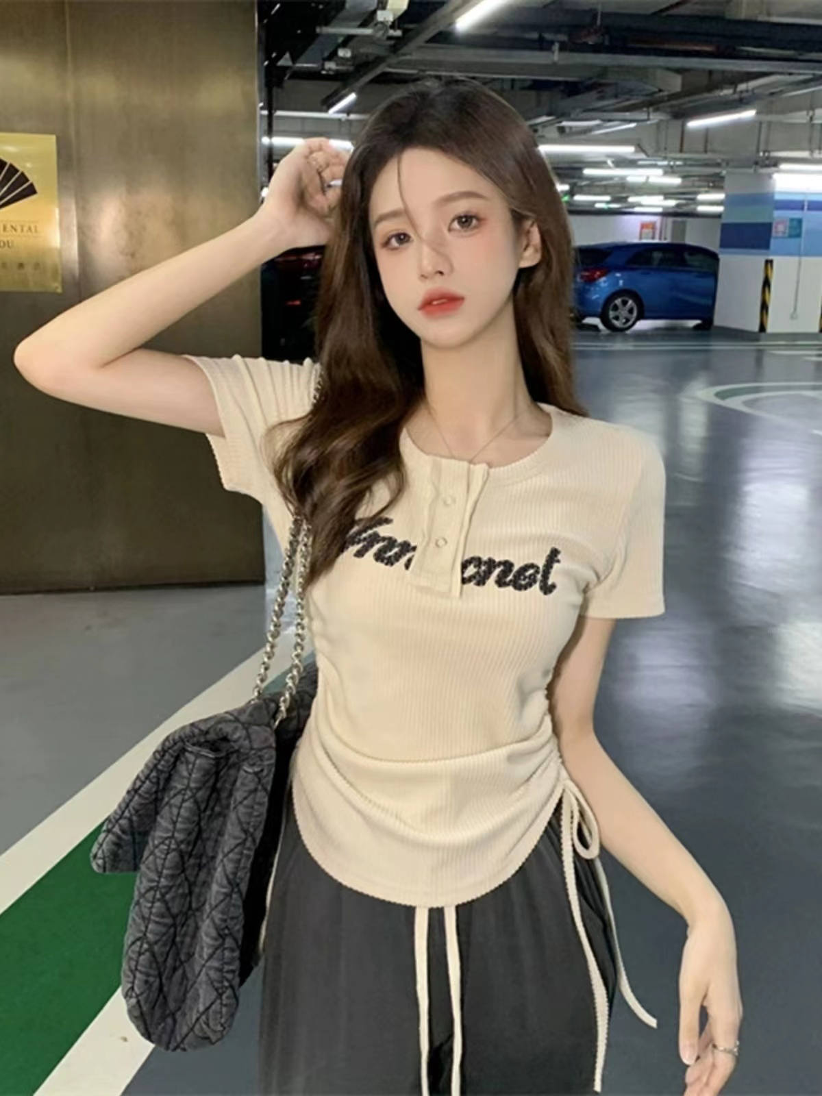 PF83#美式复古甜辣上衣设计感小众 正肩t恤短袖法式抽绳短款女