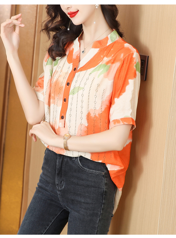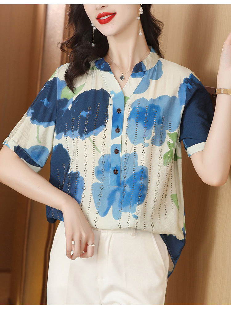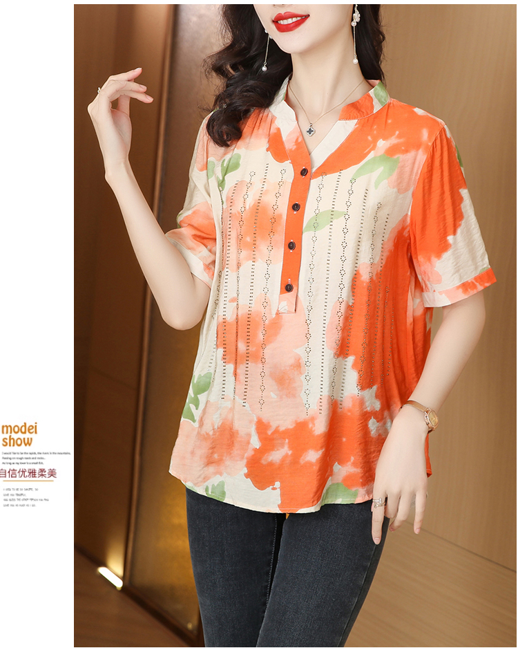 PF104#夏季时尚花色印花烫钻短袖上衣显瘦减龄气质休闲女T恤小衫