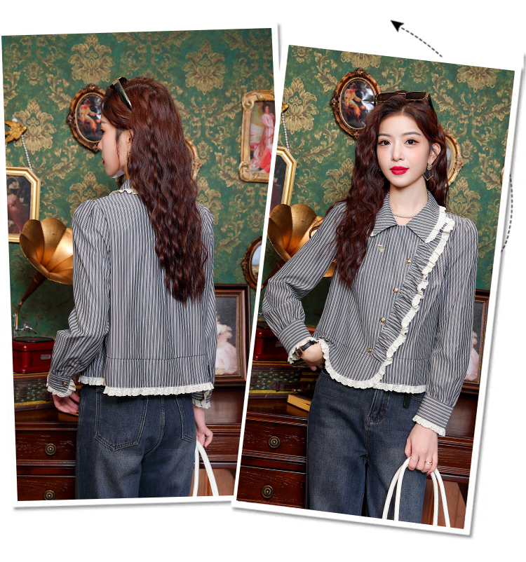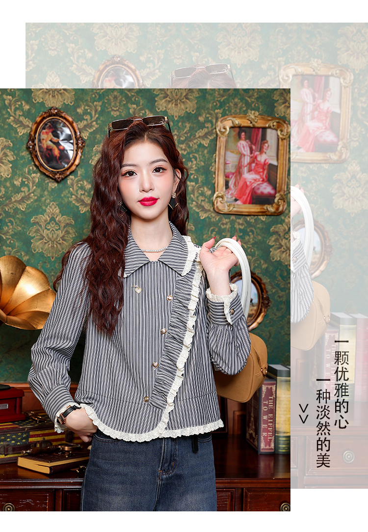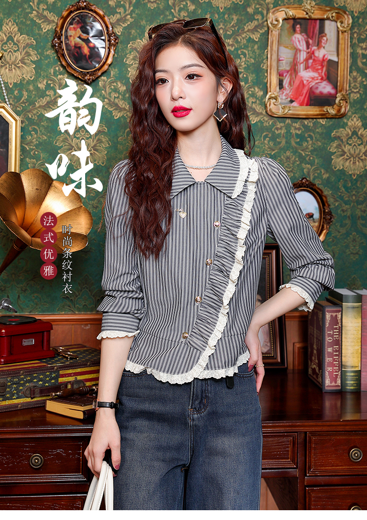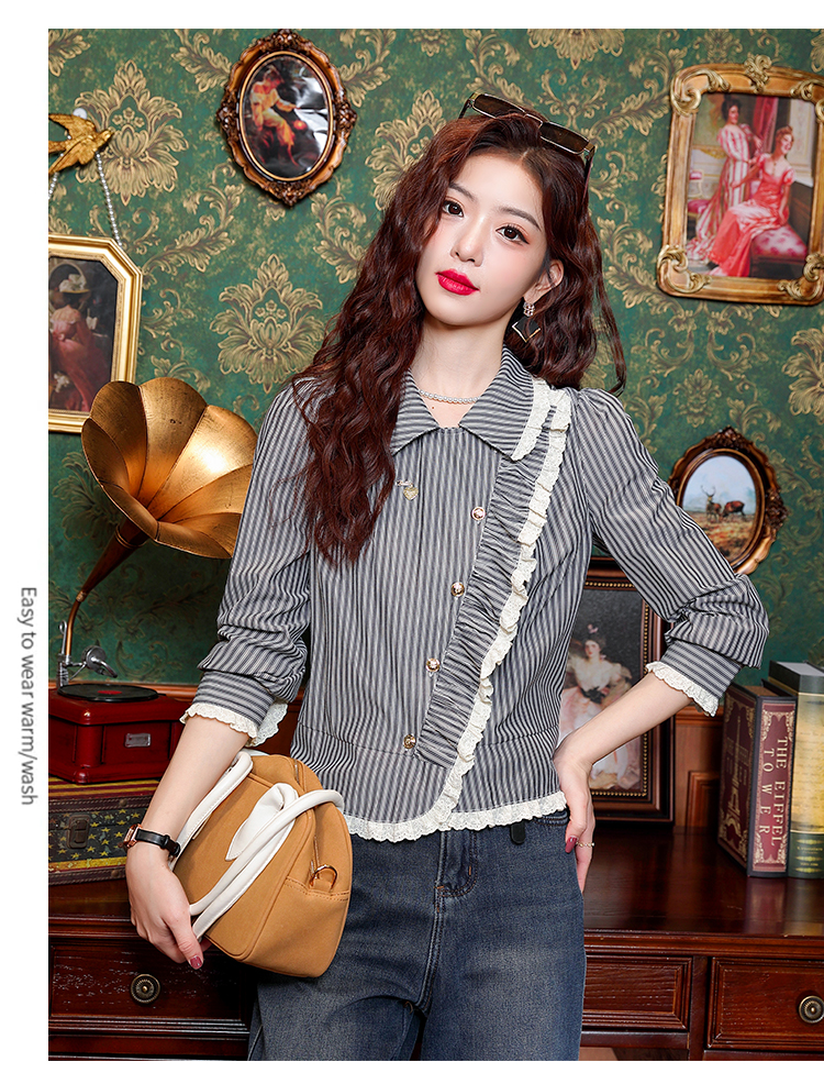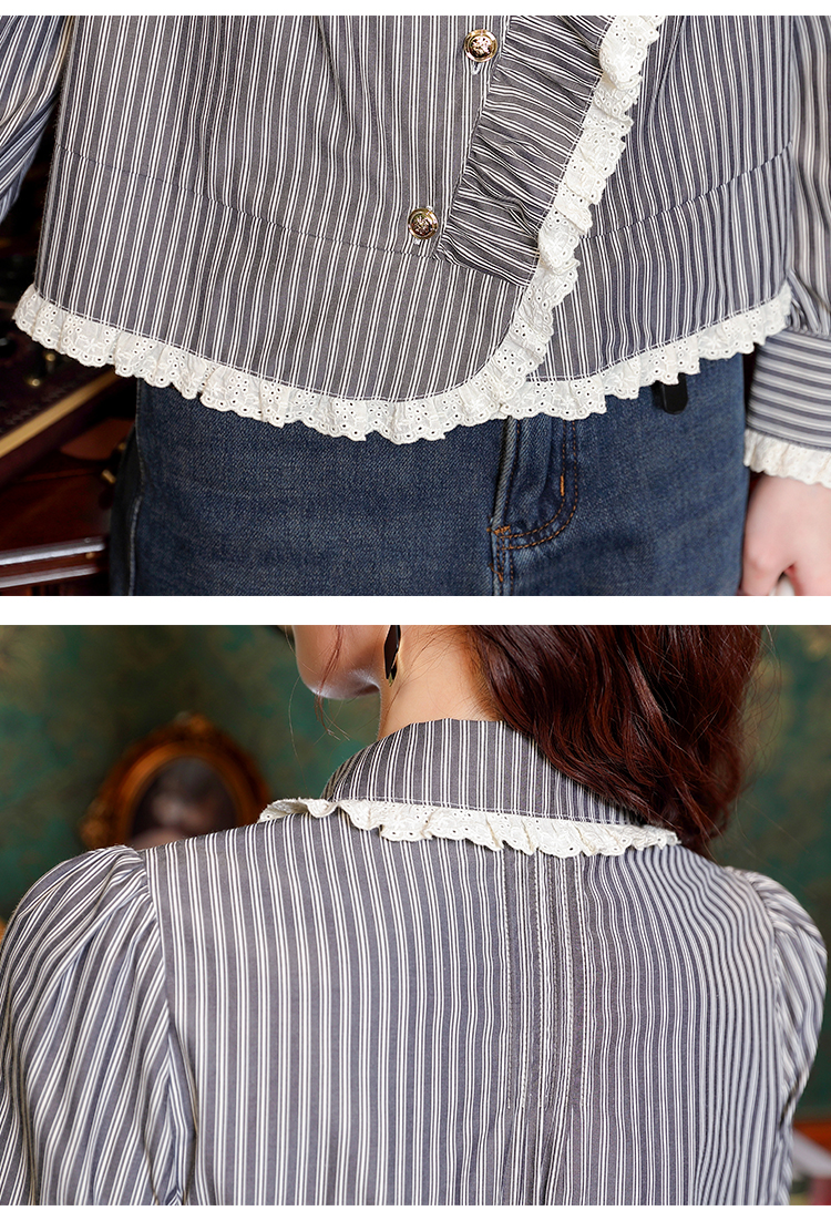PF109#新款复古荷叶边条纹斜扣衬衫女设计感百搭气质上衣