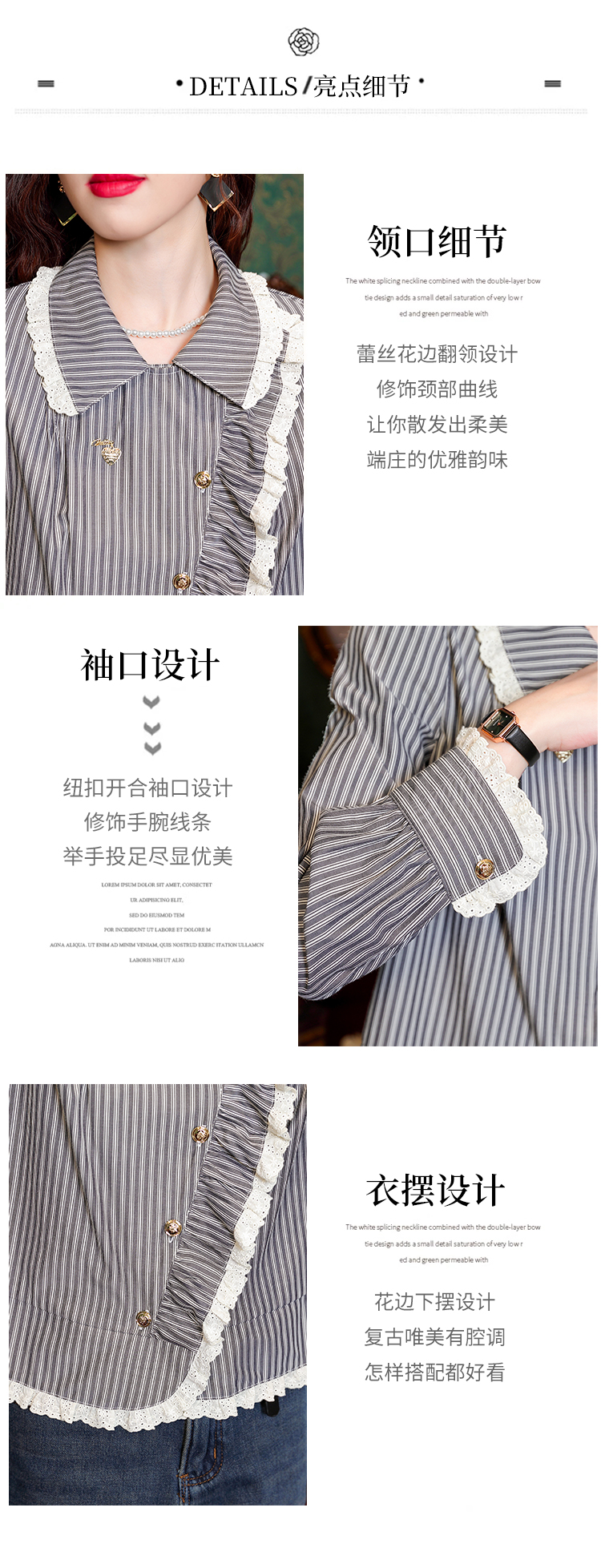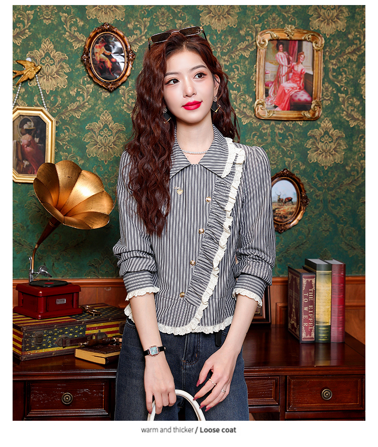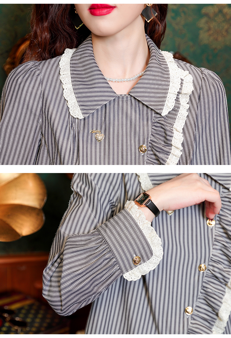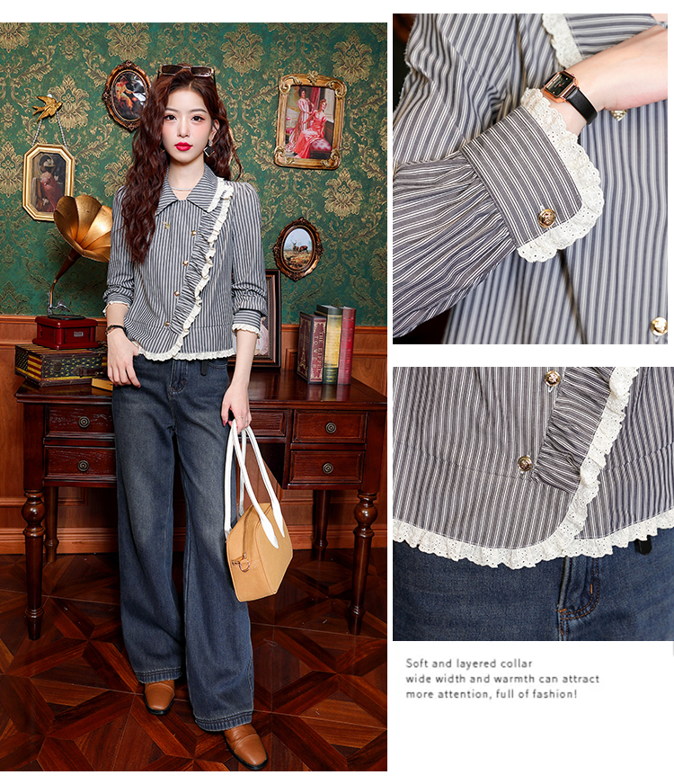 PF109#新款复古荷叶边条纹斜扣衬衫女设计感百搭气质上衣