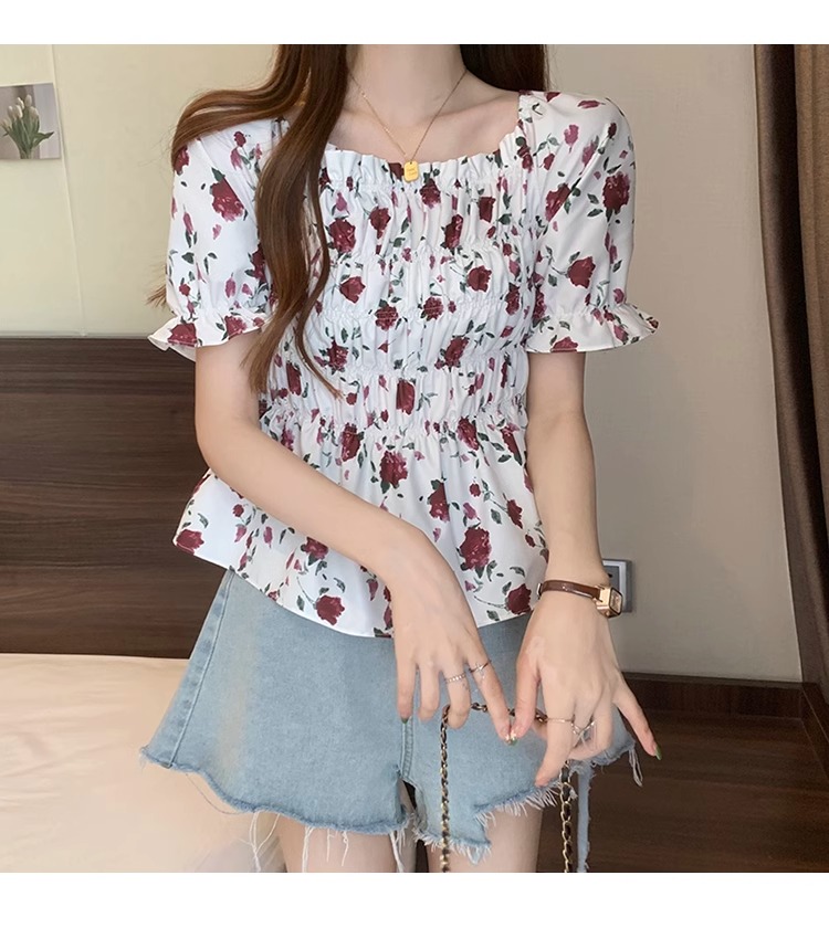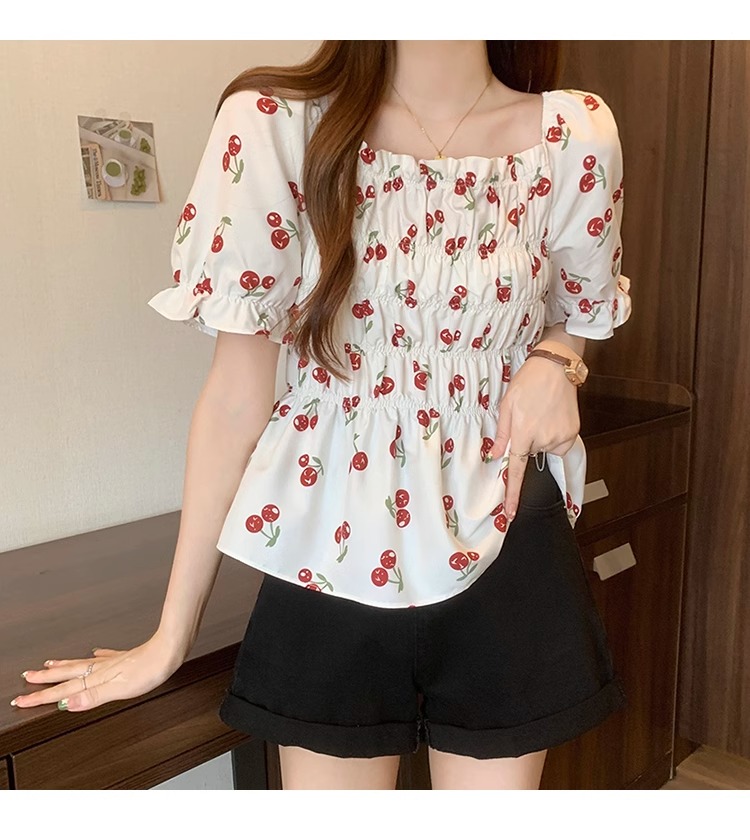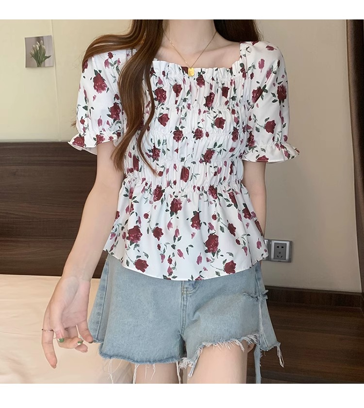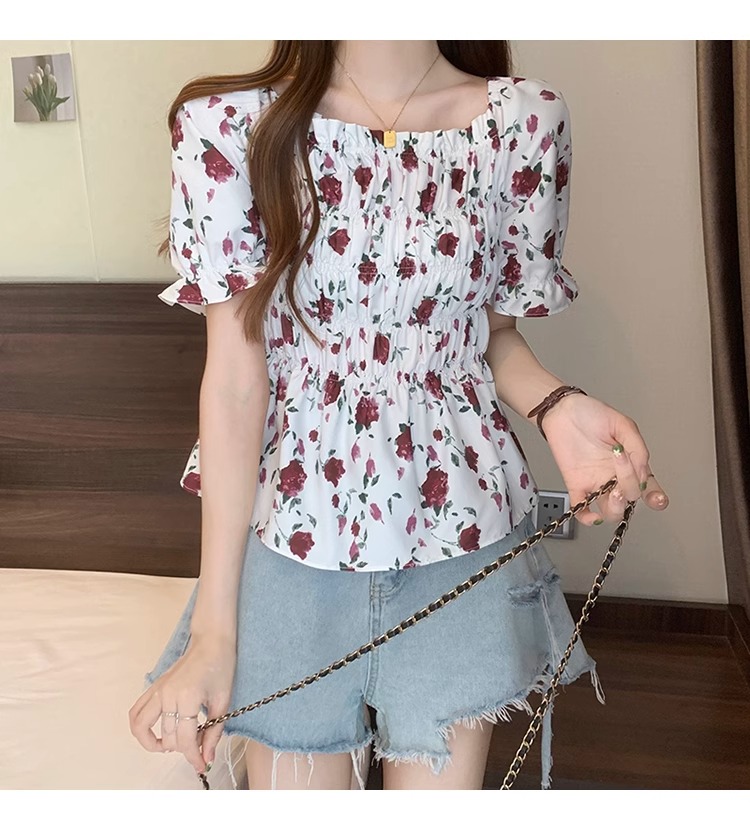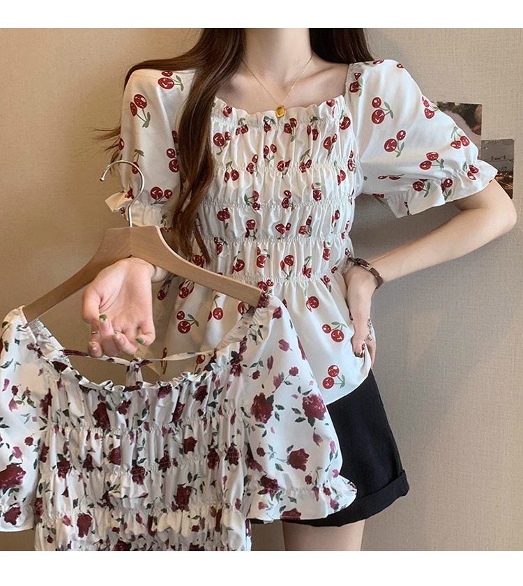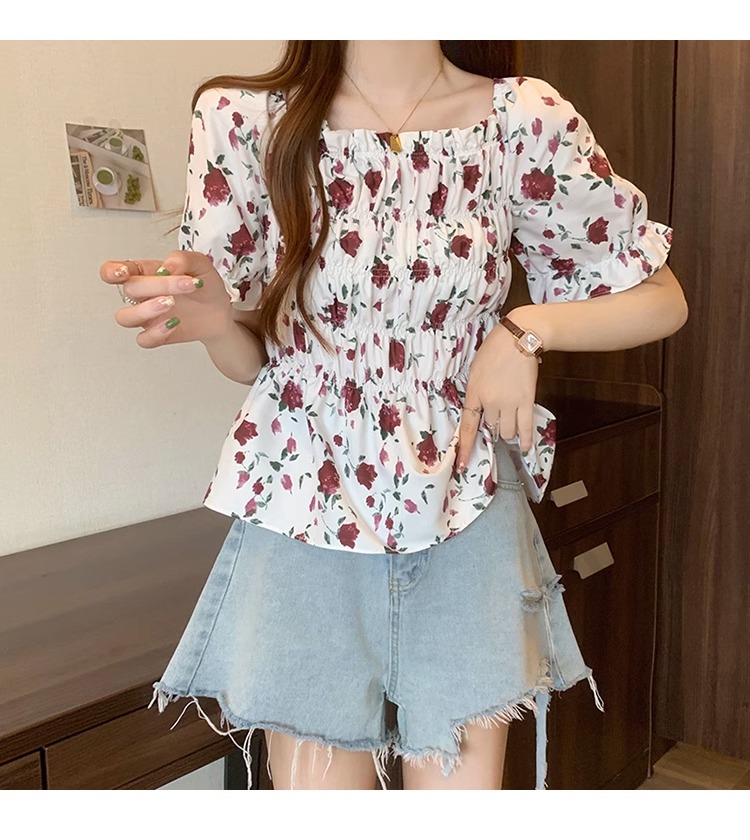 PF168#夏季新款大码显瘦洋气遮肉法式碎花方领泡泡短袖衬衫小清新