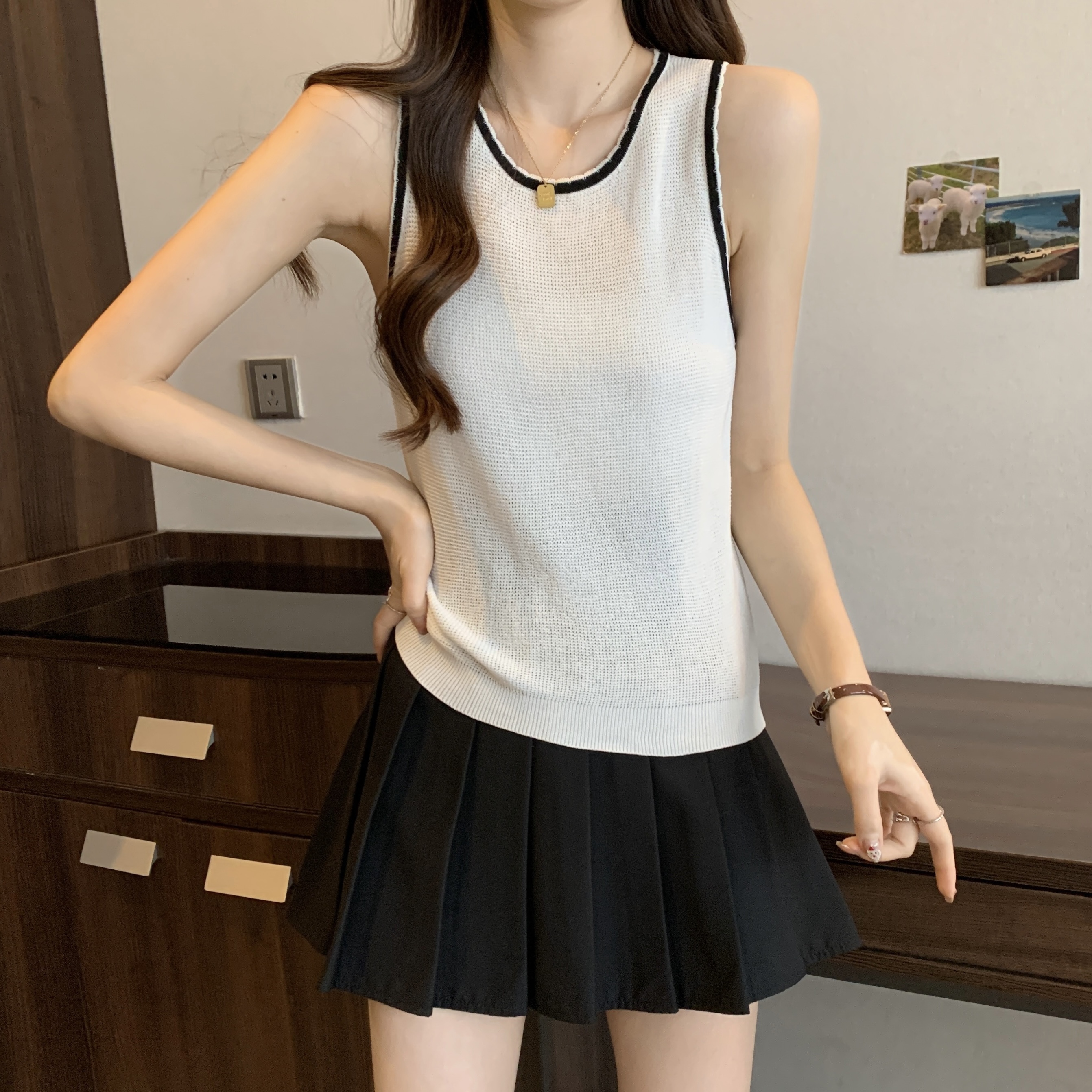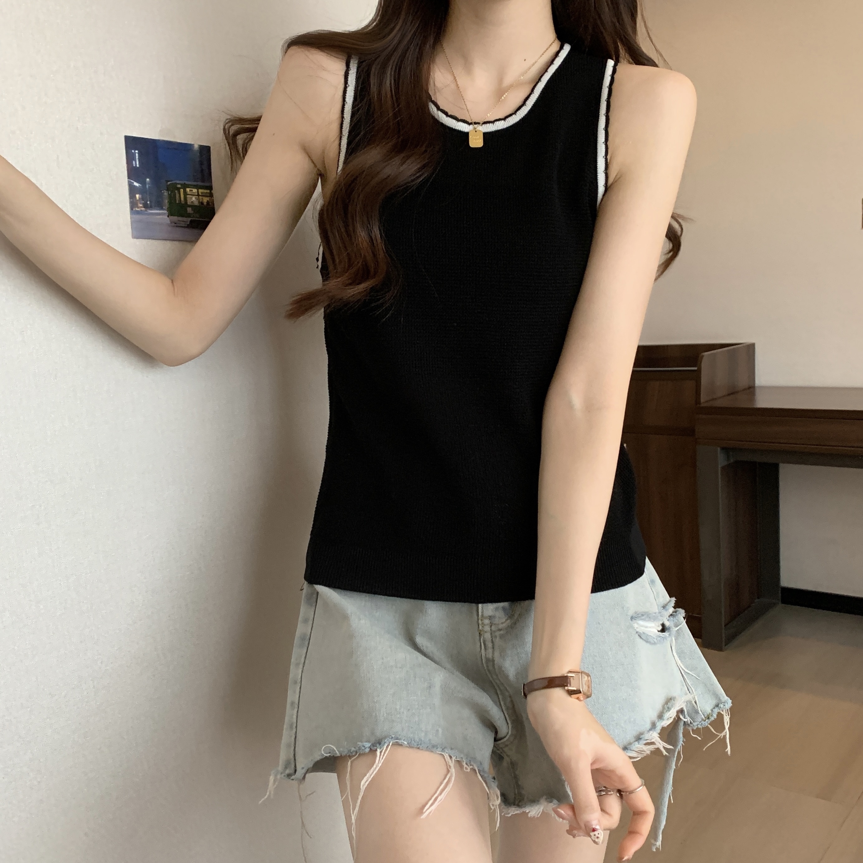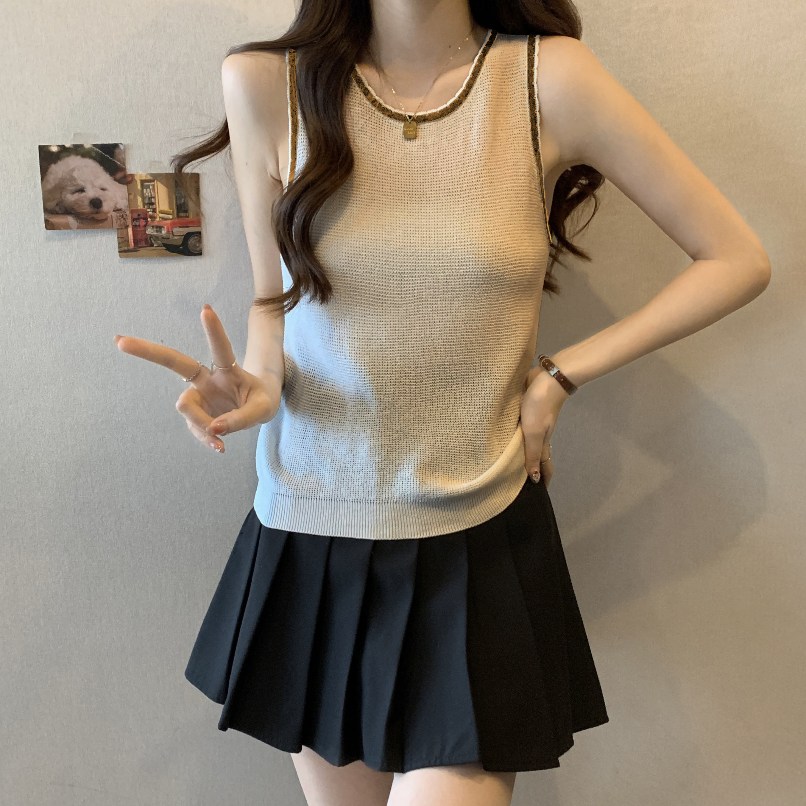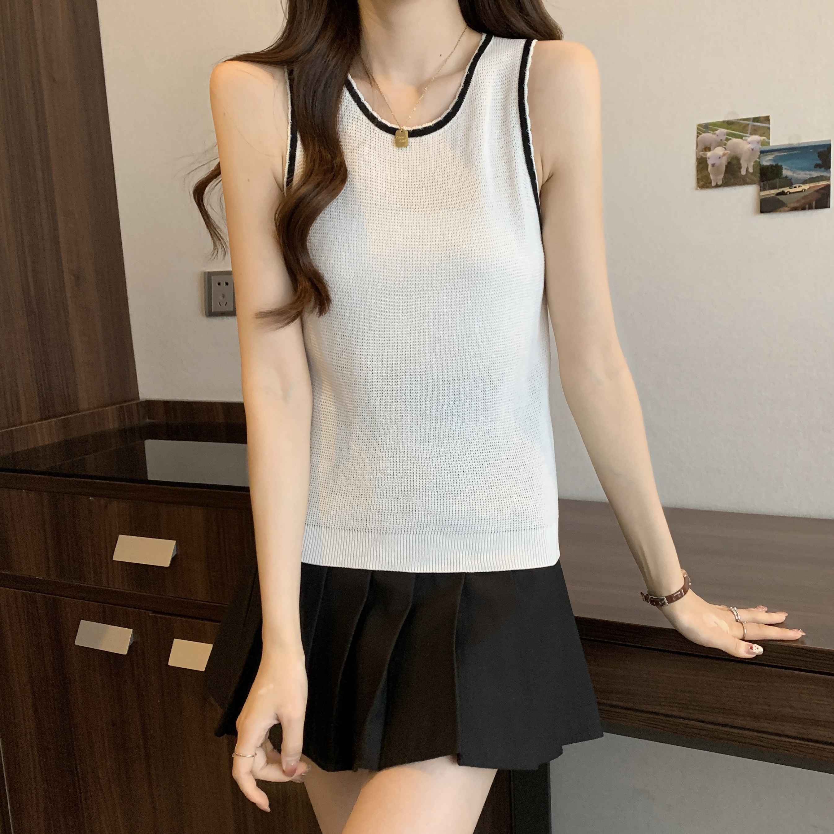 PF200#宽肩带背心女夏设计感小众宽松外穿2024新款针织吊带无袖上衣