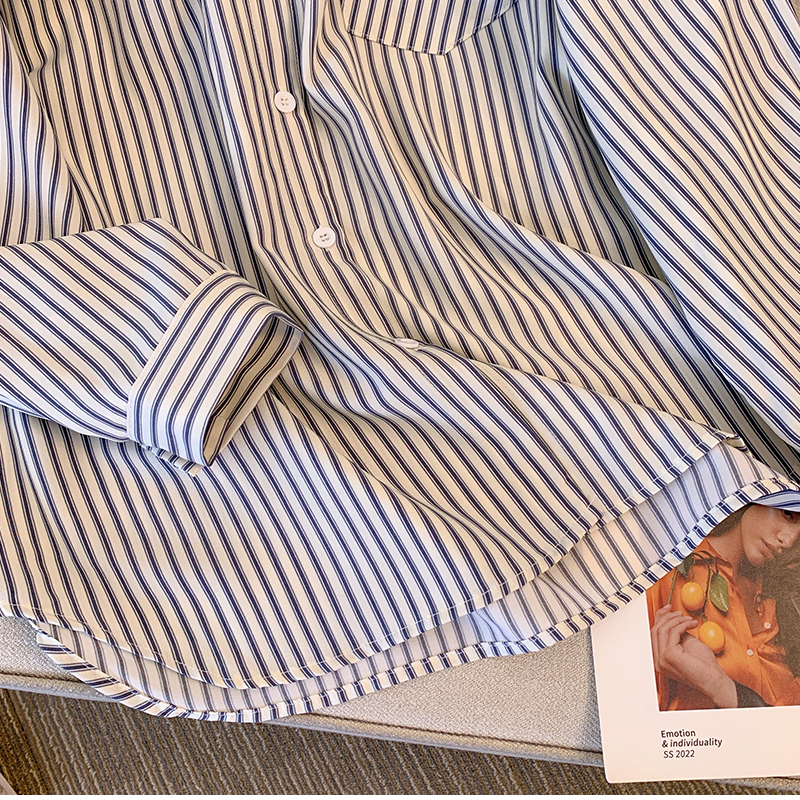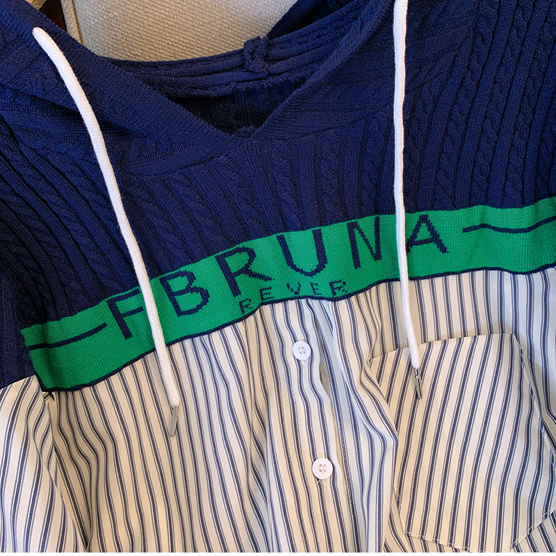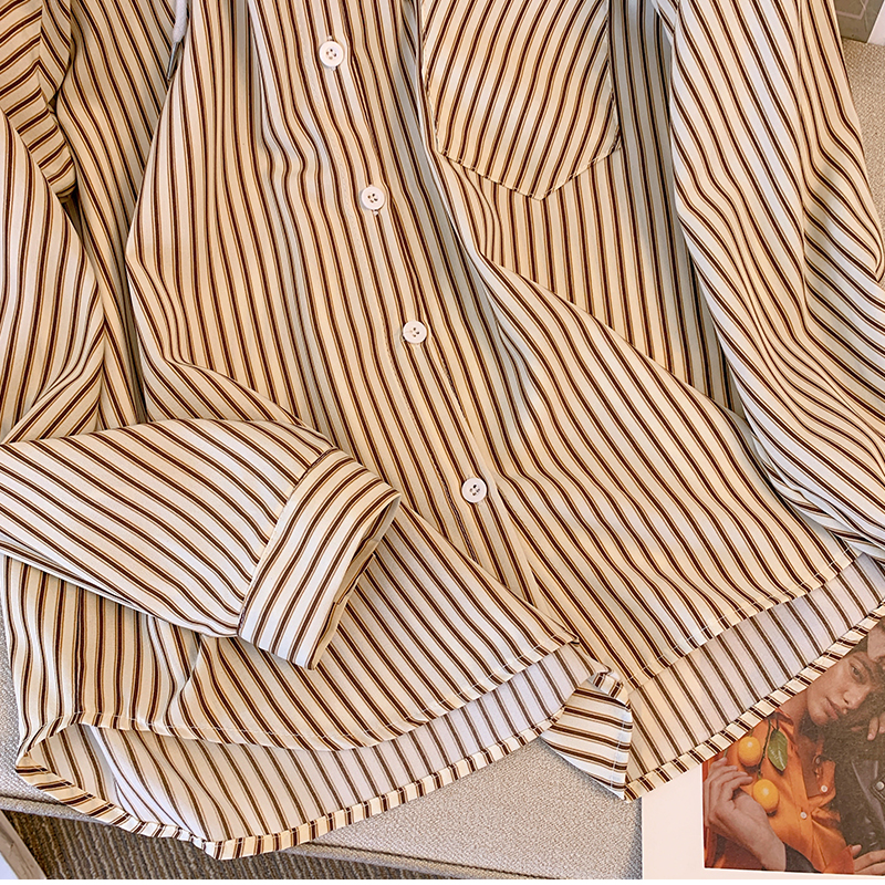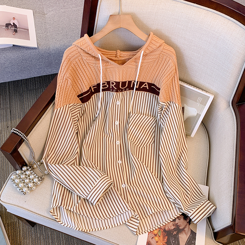 PF203#休闲连帽条纹衬衫春季新款宽松时尚洋气长袖假两件上衣