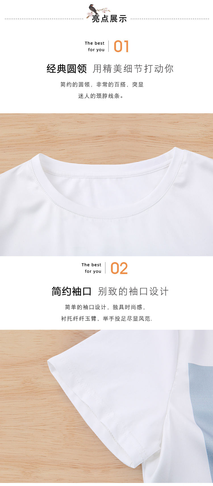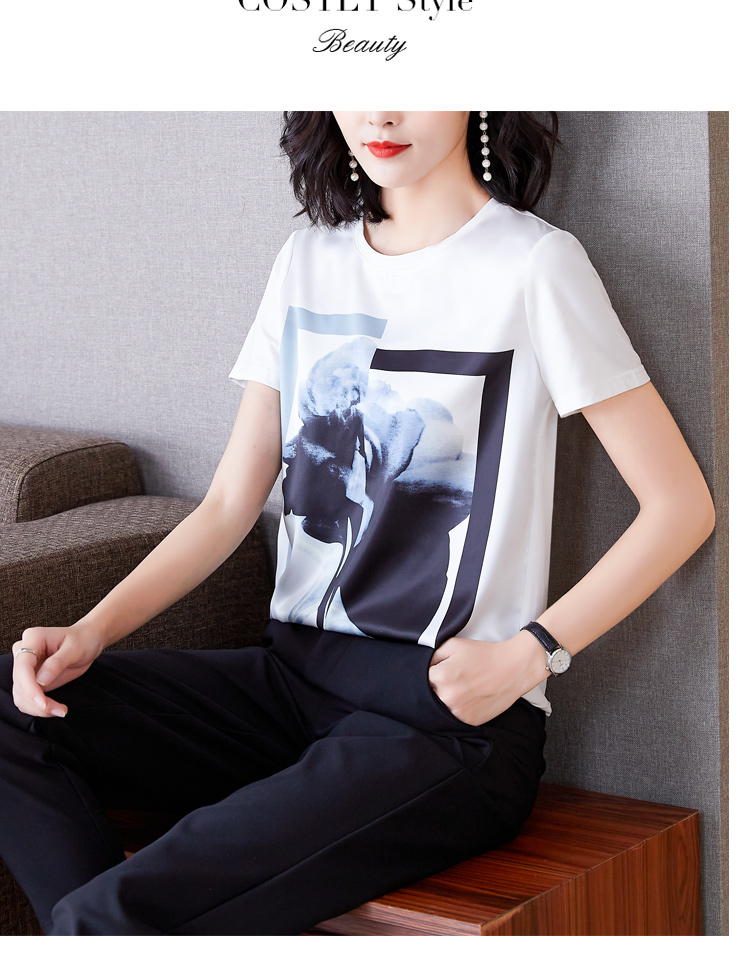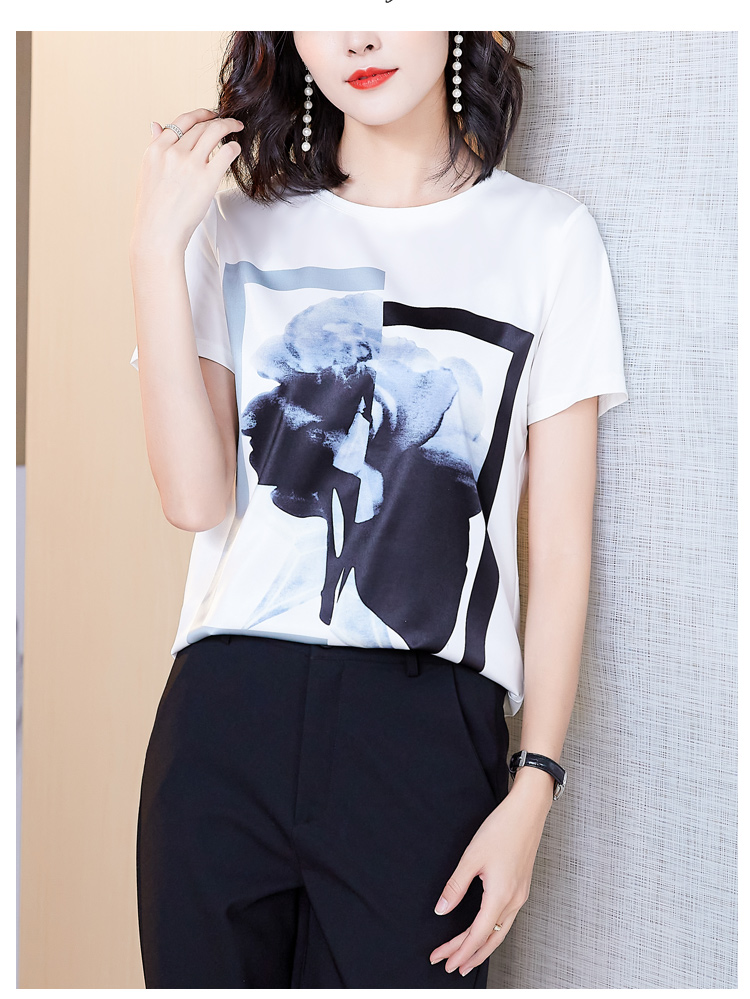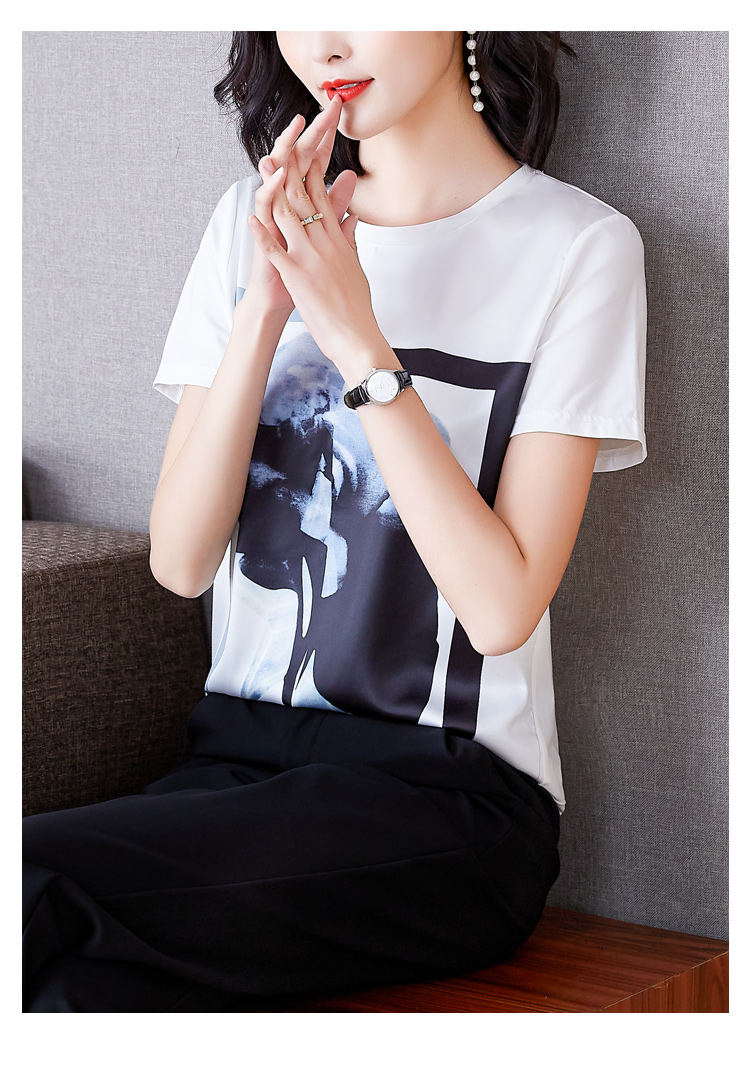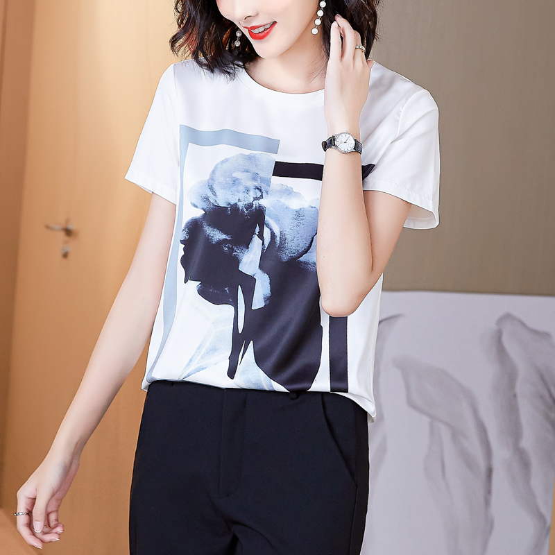PF235#新款重磅真丝T恤宽松女短袖印花白色圆领小衫半袖上衣