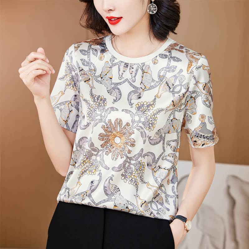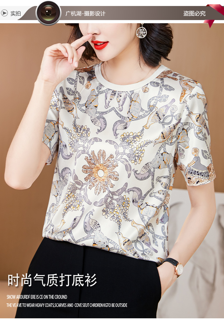 PF237#夏季新款高端真丝印花圆领洋气短袖女T恤上衣