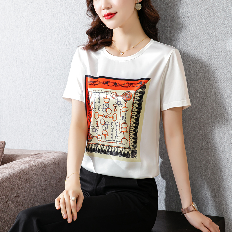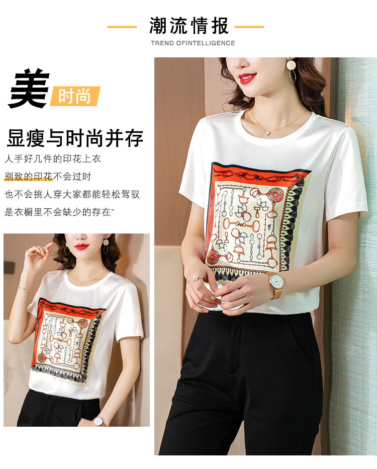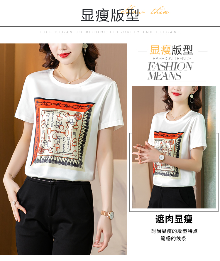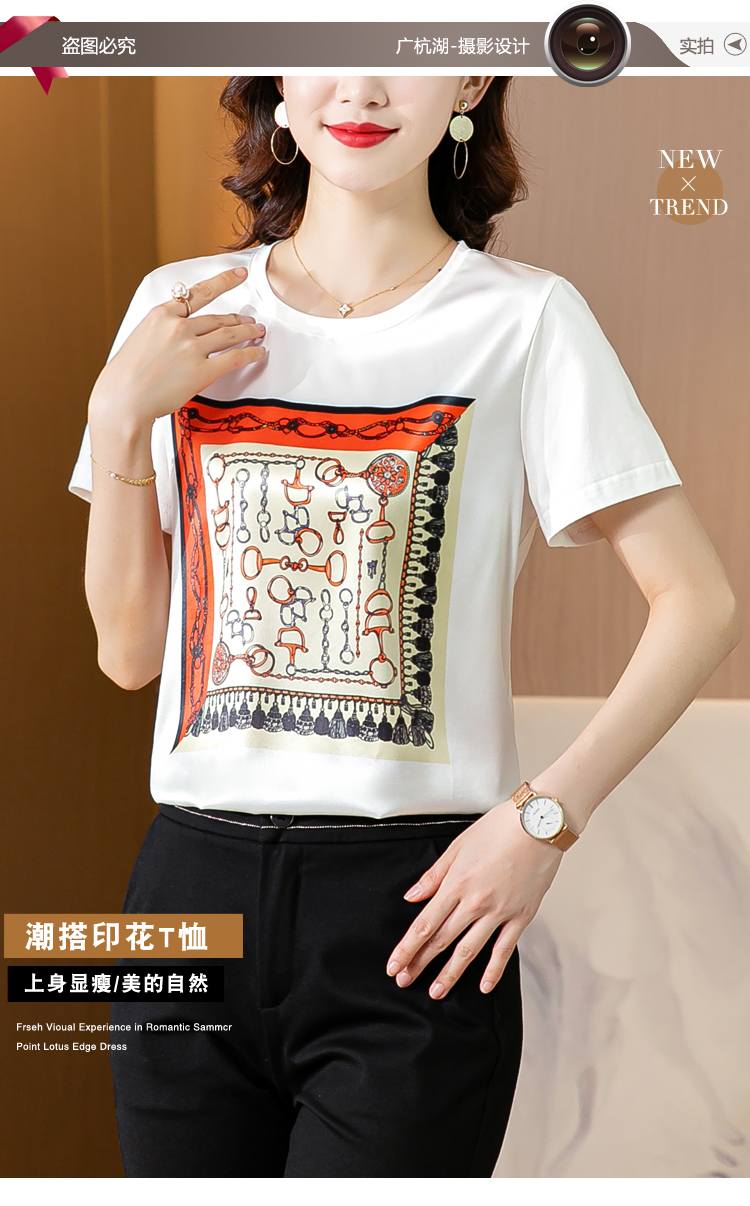 PF239#新款重磅真丝T恤宽松女短袖印花白色圆领小衫半袖上衣