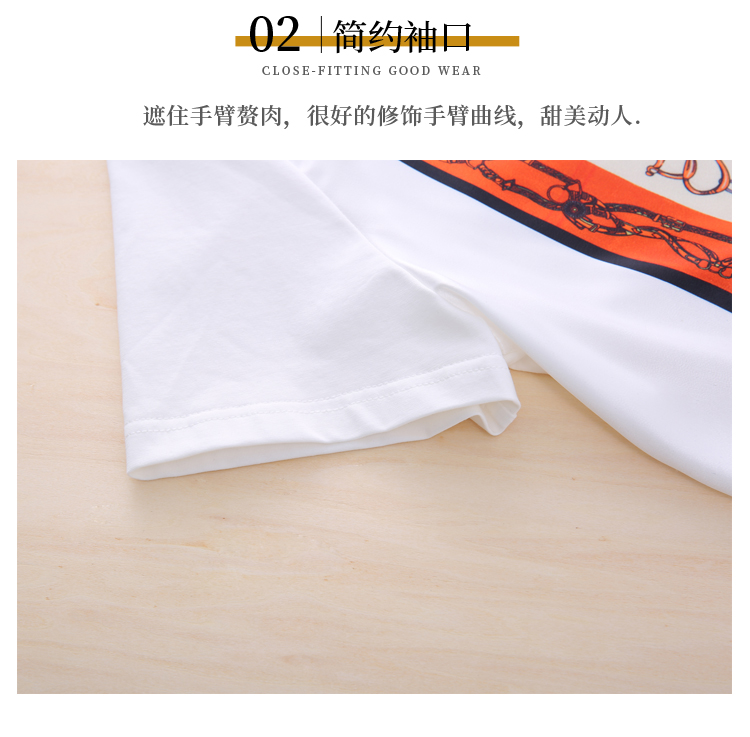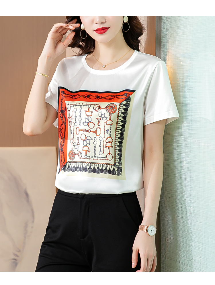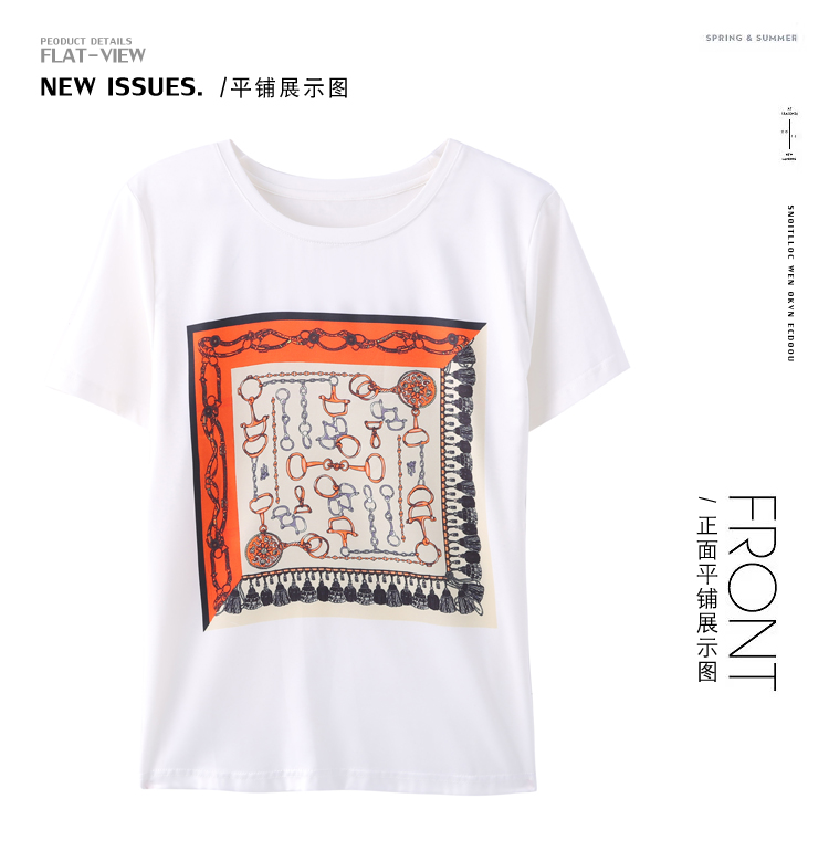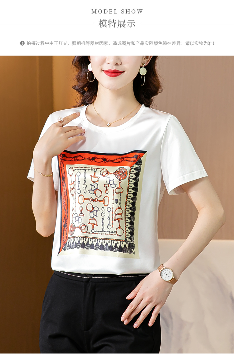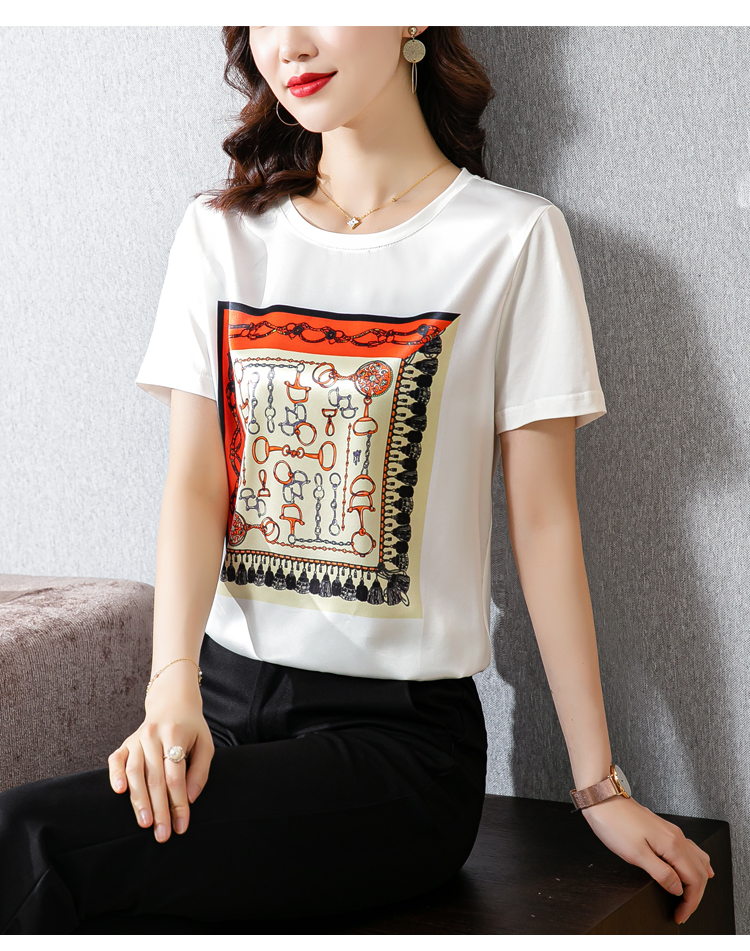 PF239#新款重磅真丝T恤宽松女短袖印花白色圆领小衫半袖上衣