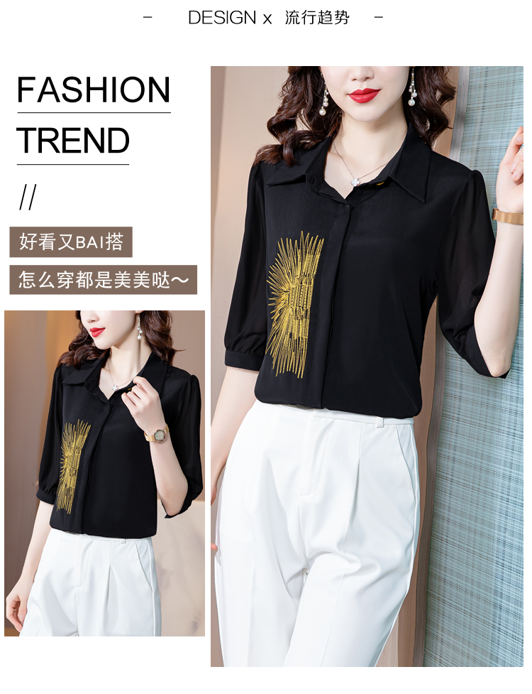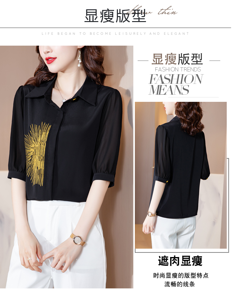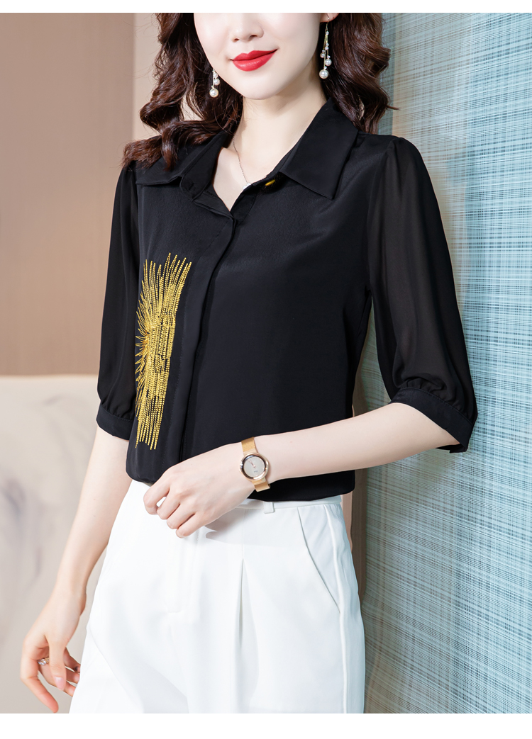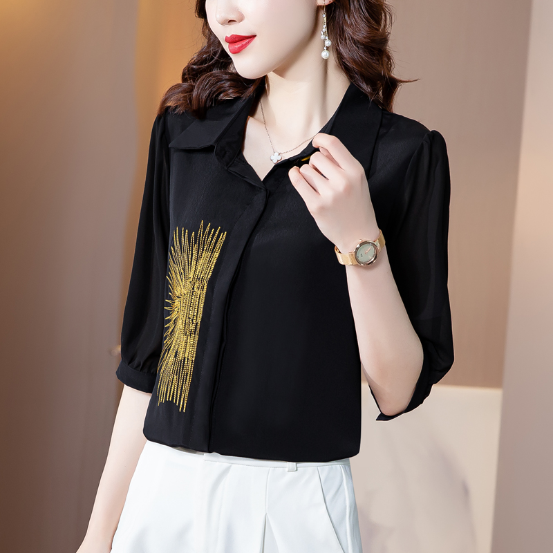 PF242#高端缎面仿真丝衬衫2024新款五分袖黑色绣花时尚职业上衣