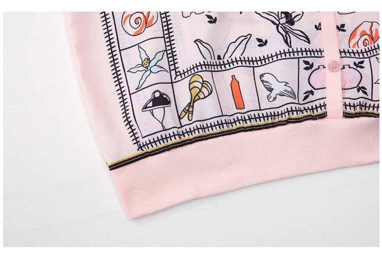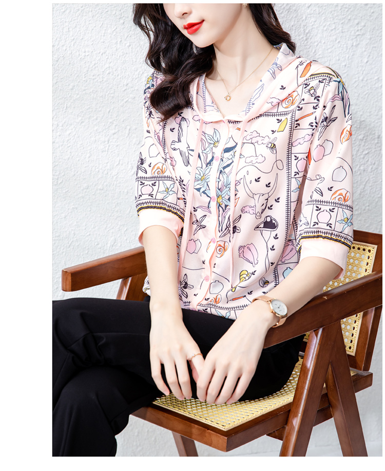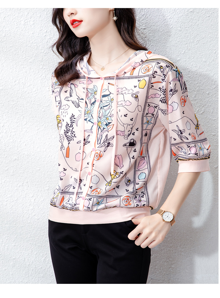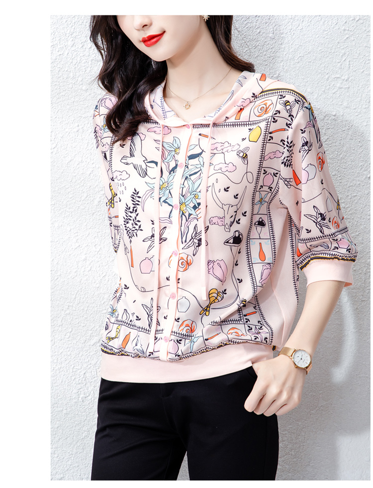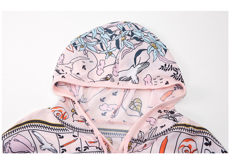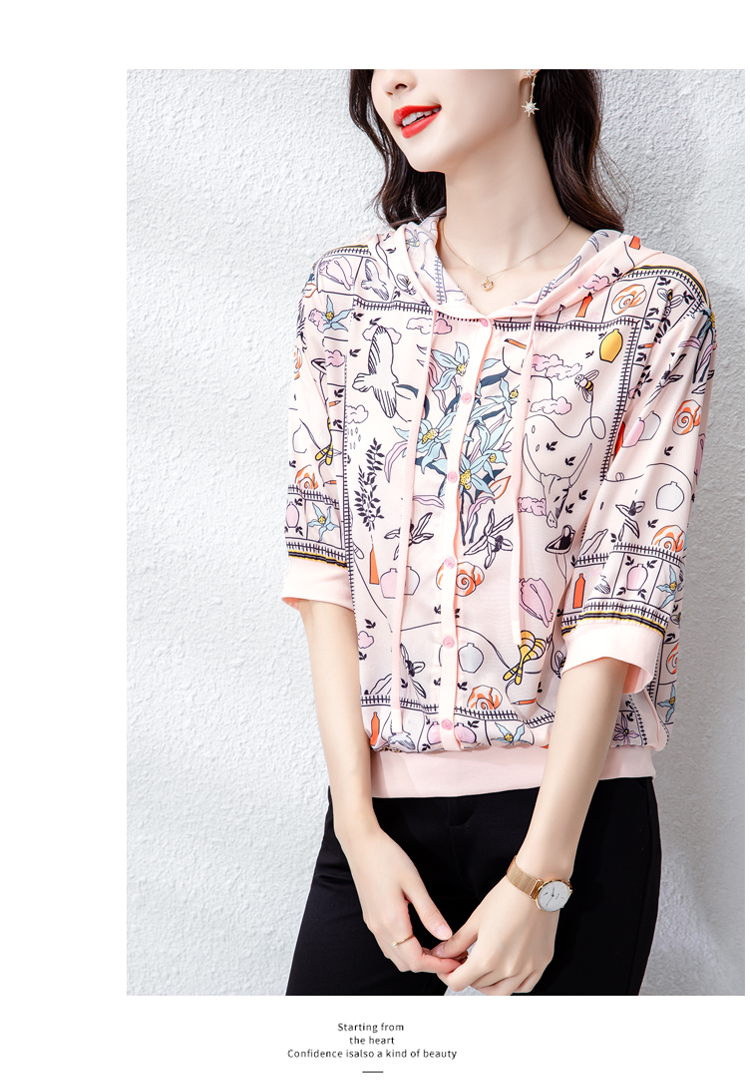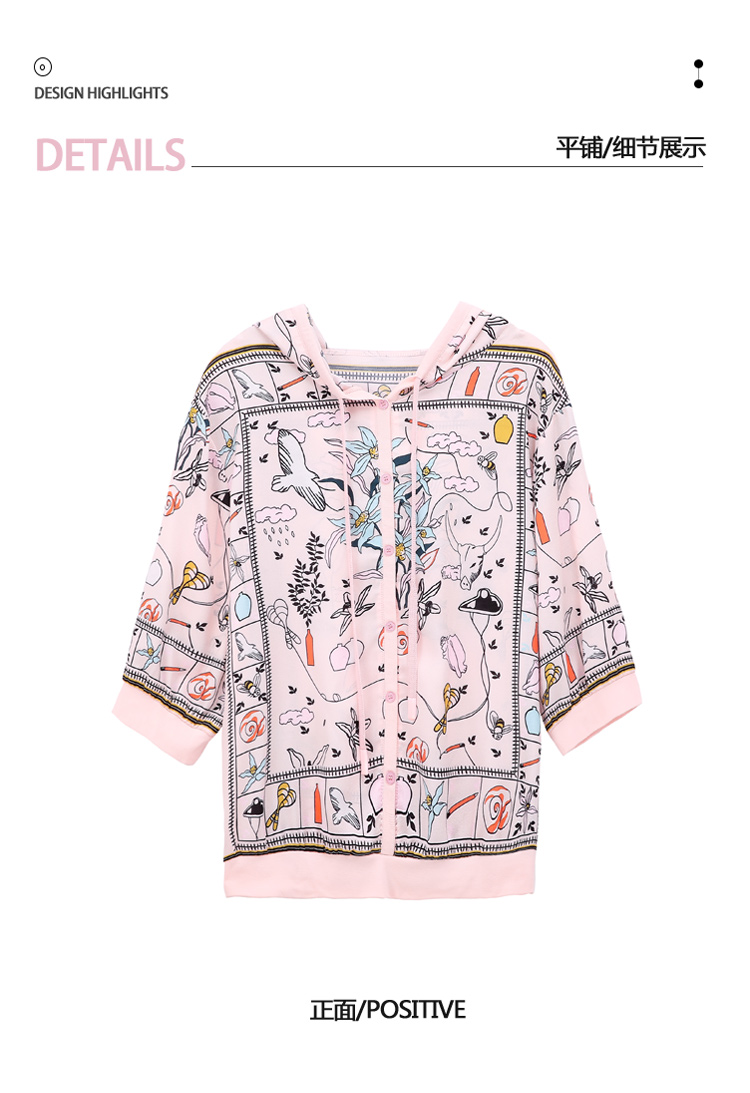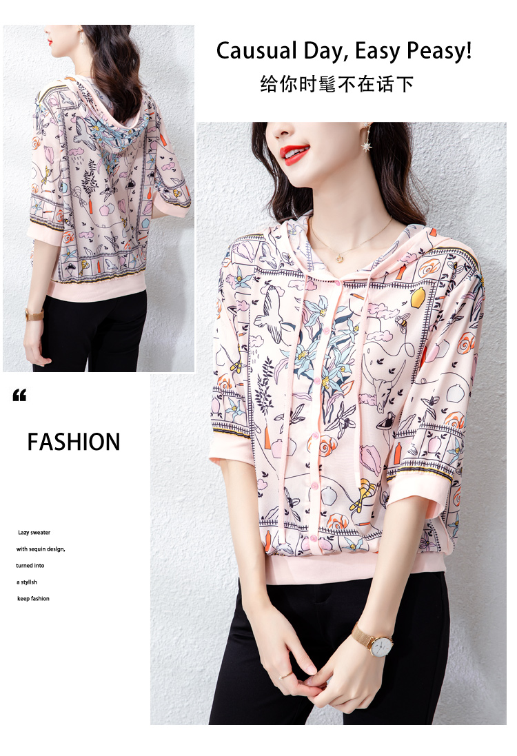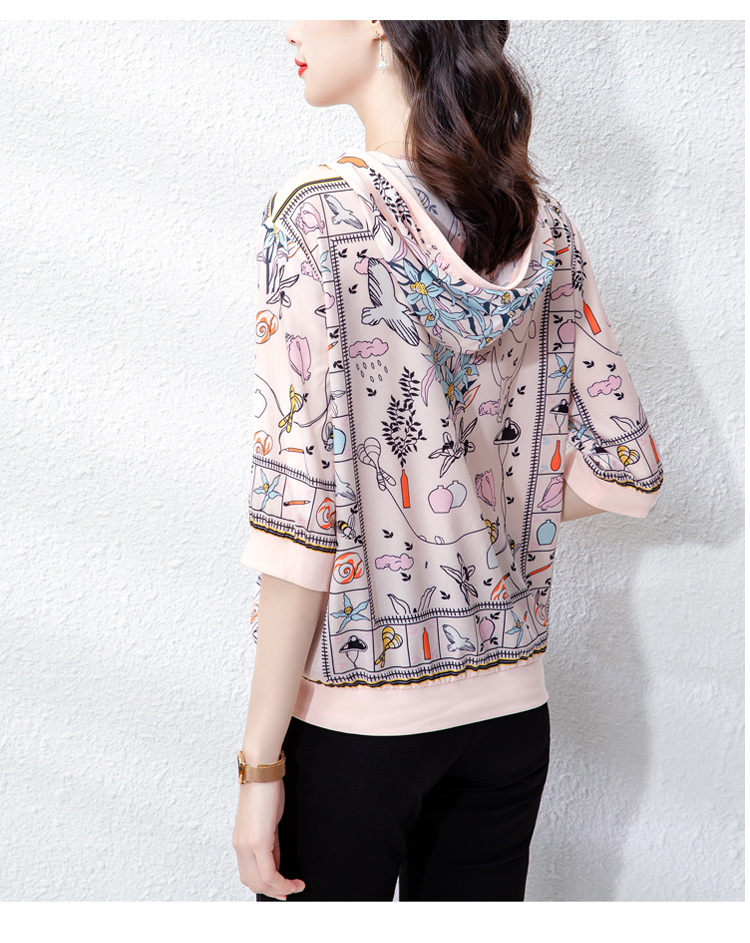 PF243#高端仿真丝印花女秋2024新款连帽卫衣半袖外搭上衣