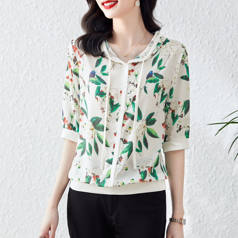 PF244#高端仿真丝印花女夏2024新款连帽卫衣防嗮半袖外搭上衣