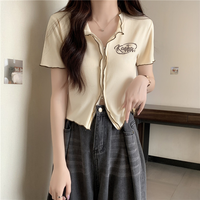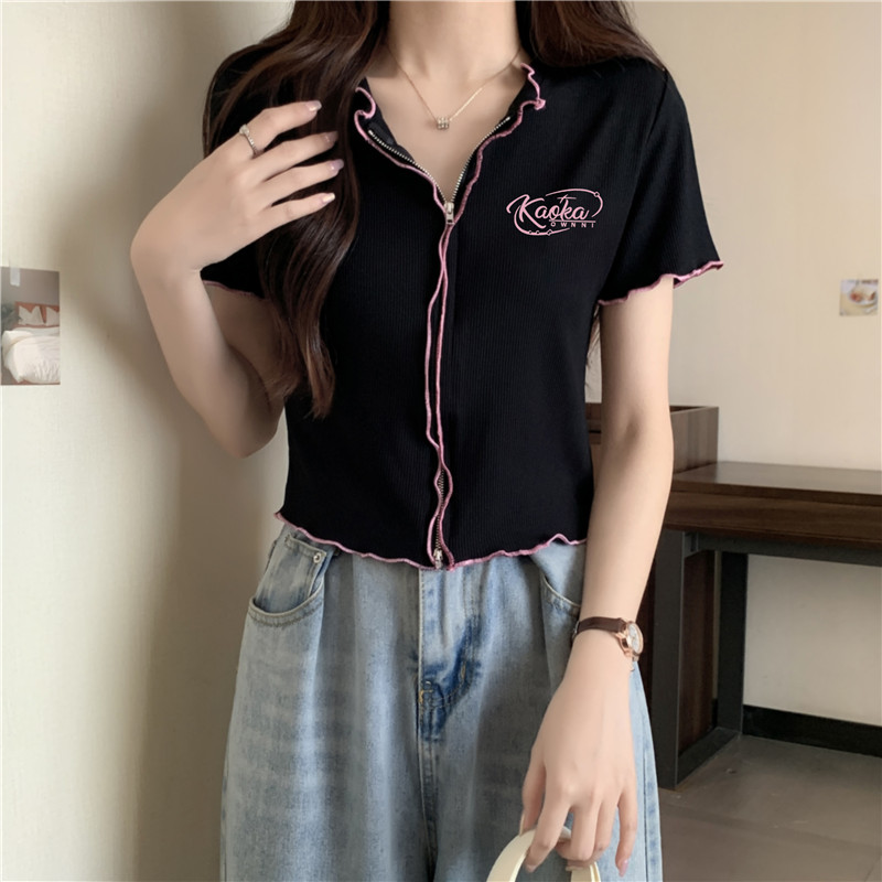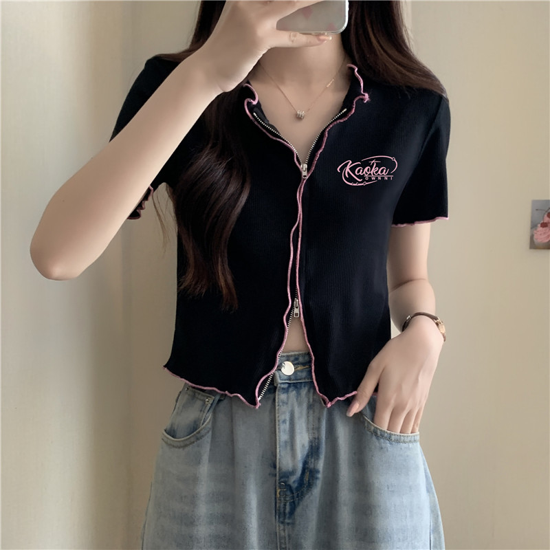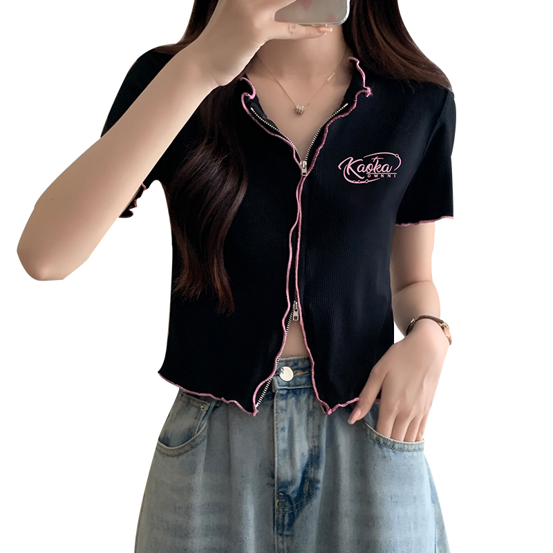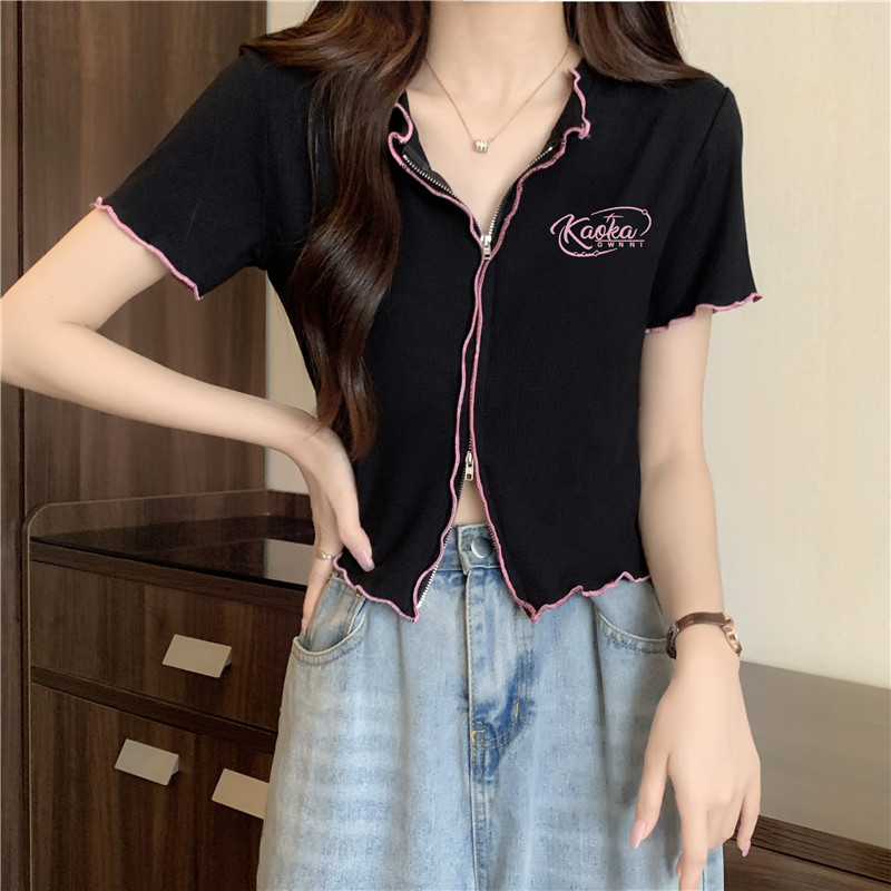 PF259#人棉莫代尔修身缴边别致设计短款开衫双拉链短袖T恤女