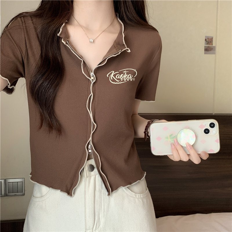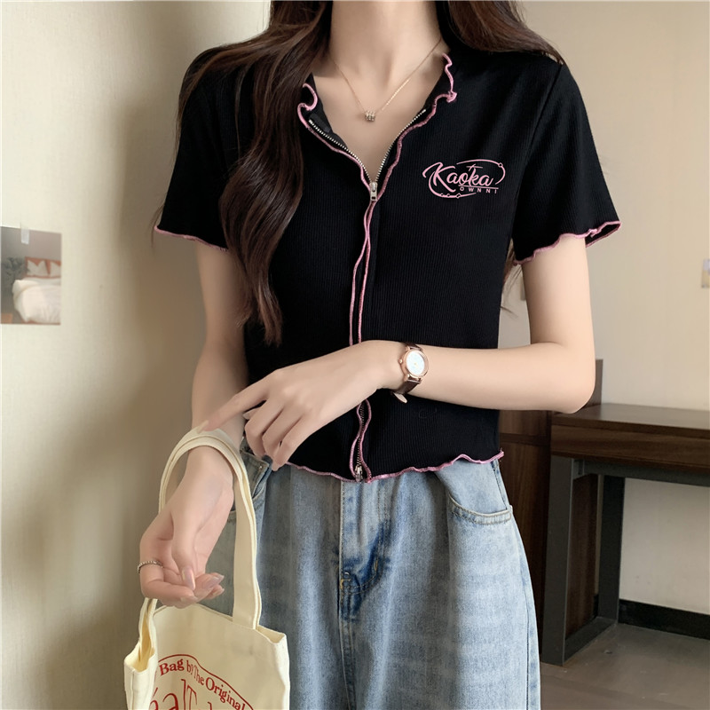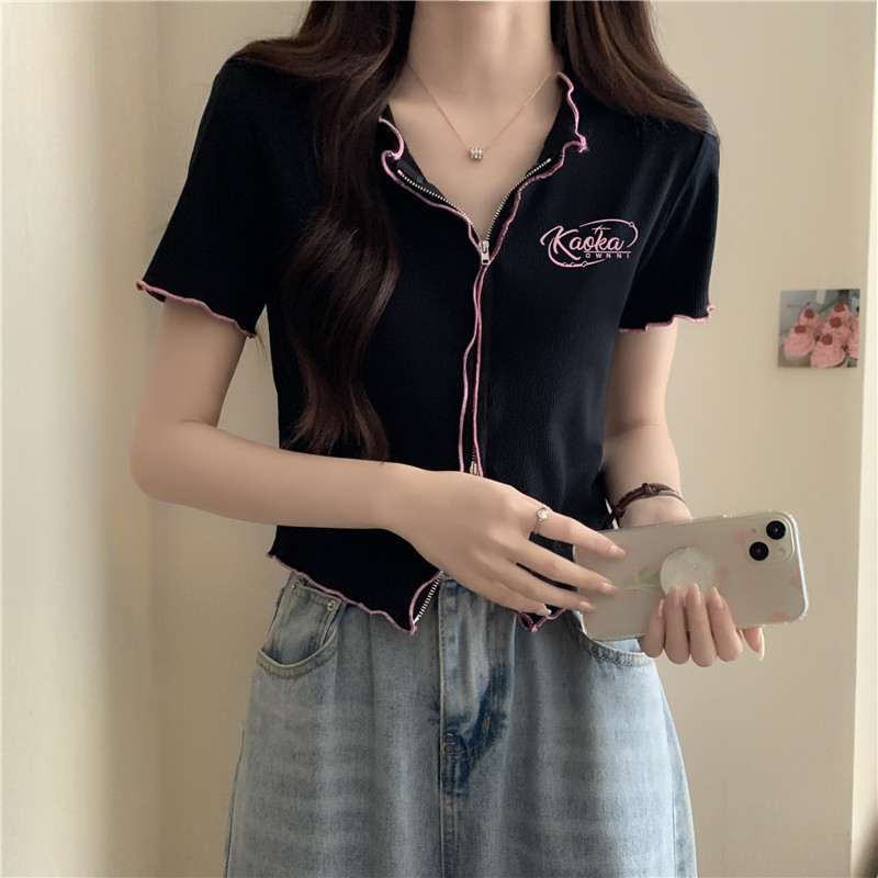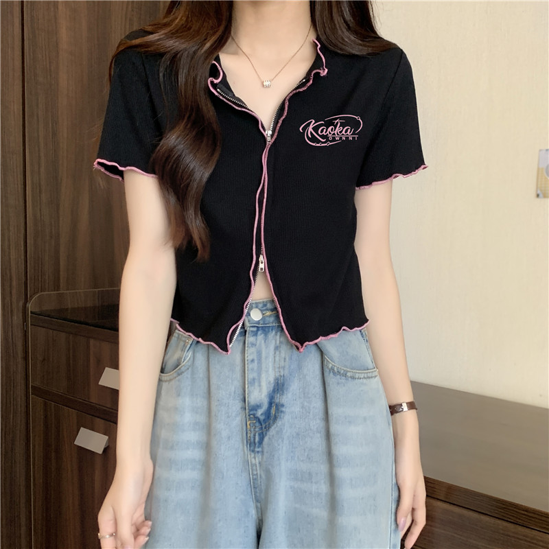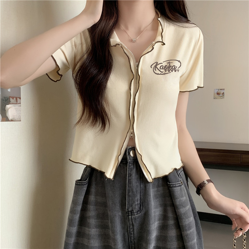 PF259#人棉莫代尔修身缴边别致设计短款开衫双拉链短袖T恤女