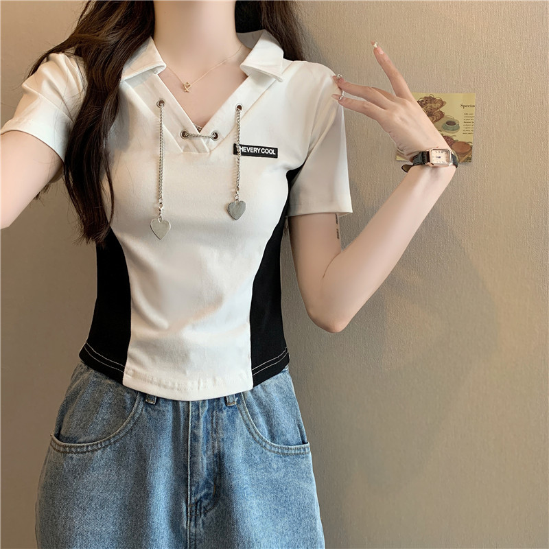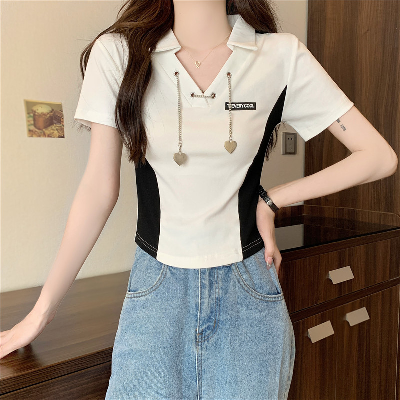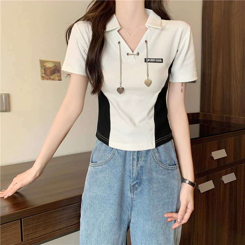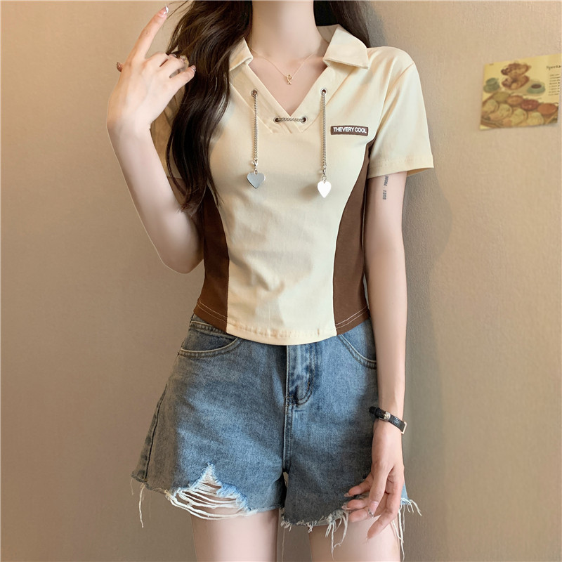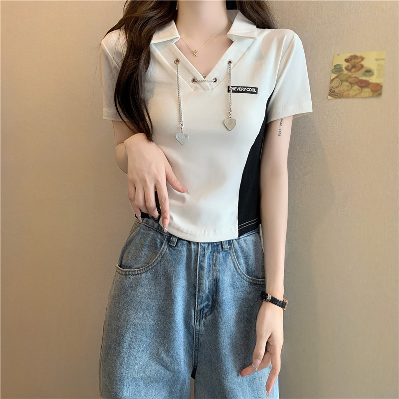 PF260#纯棉高弹夏季新款设计感小众别致性感V领短款短袖T恤女潮