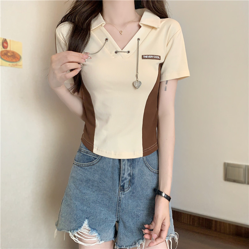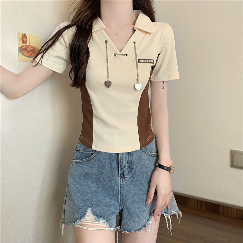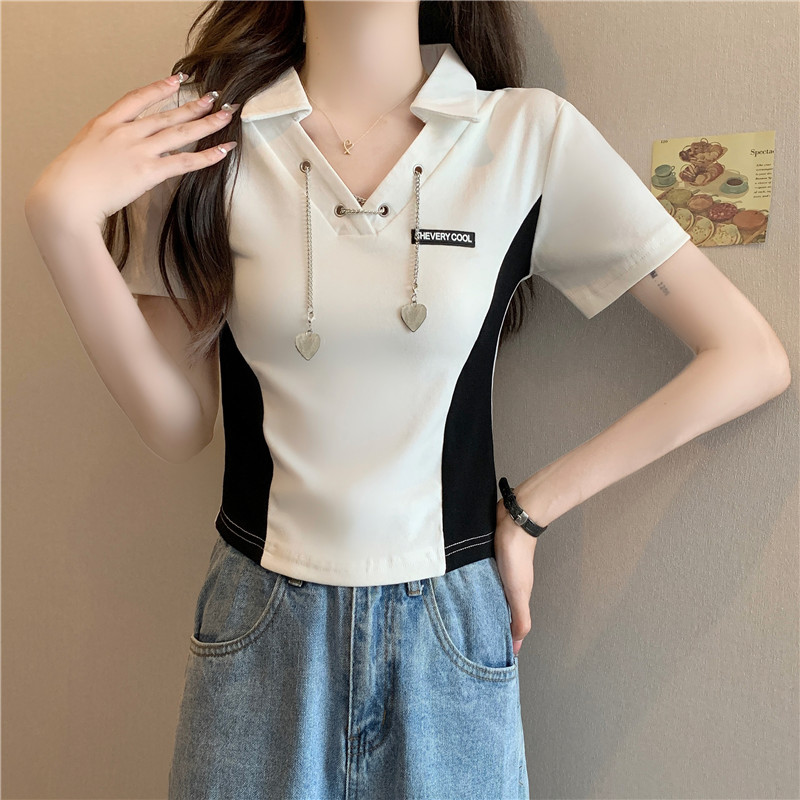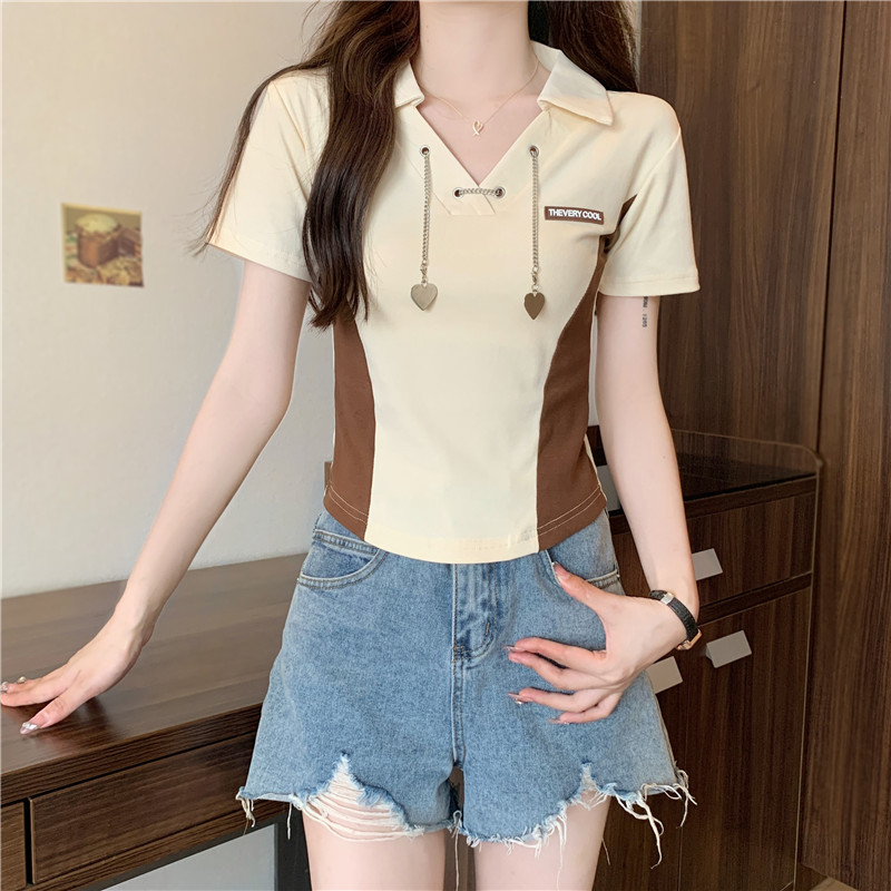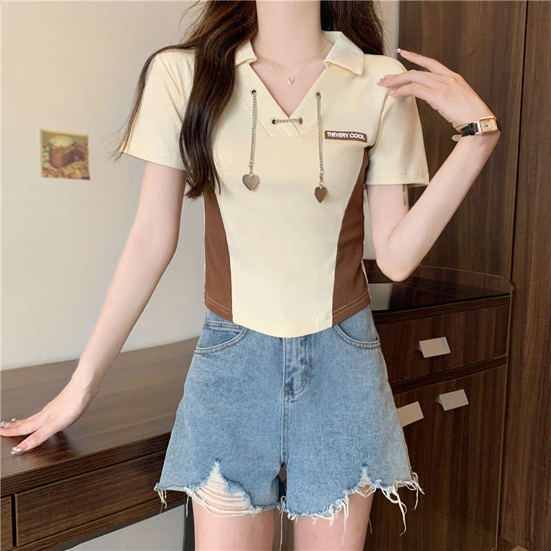 PF260#纯棉高弹夏季新款设计感小众别致性感V领短款短袖T恤女潮