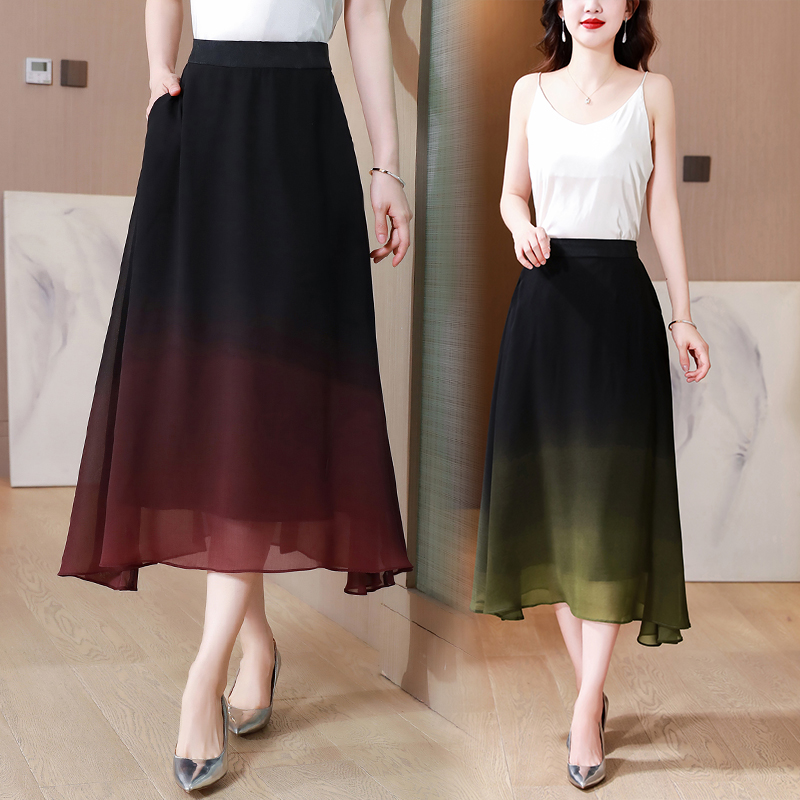 PF317#夏新款高腰中长渐变色雪纺裙中老年大码半身裙