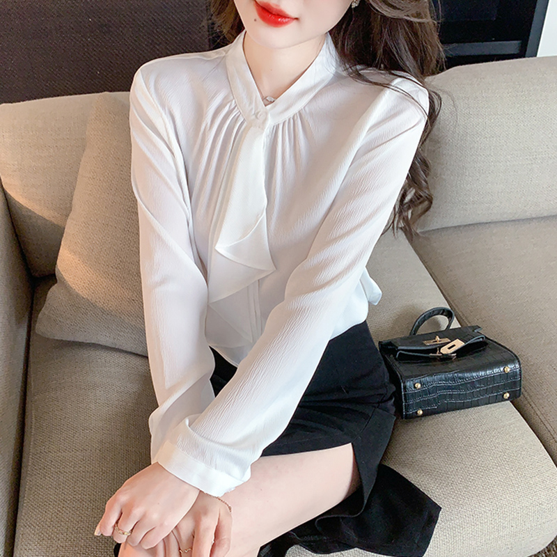 PF319#新款紫色飘带领结长袖衬衫女气质通勤职场衬衣