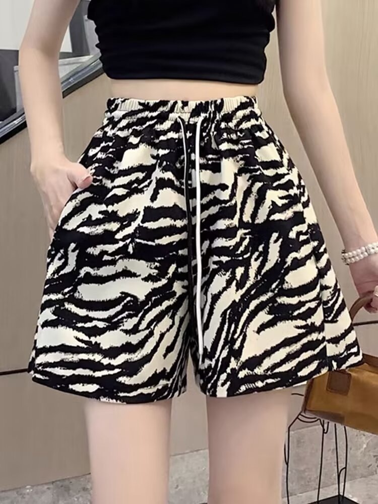PF340#欧洲站时尚短裤2024夏新款松紧腰抽绳宽松斑马纹A字阔腿冰丝裤潮